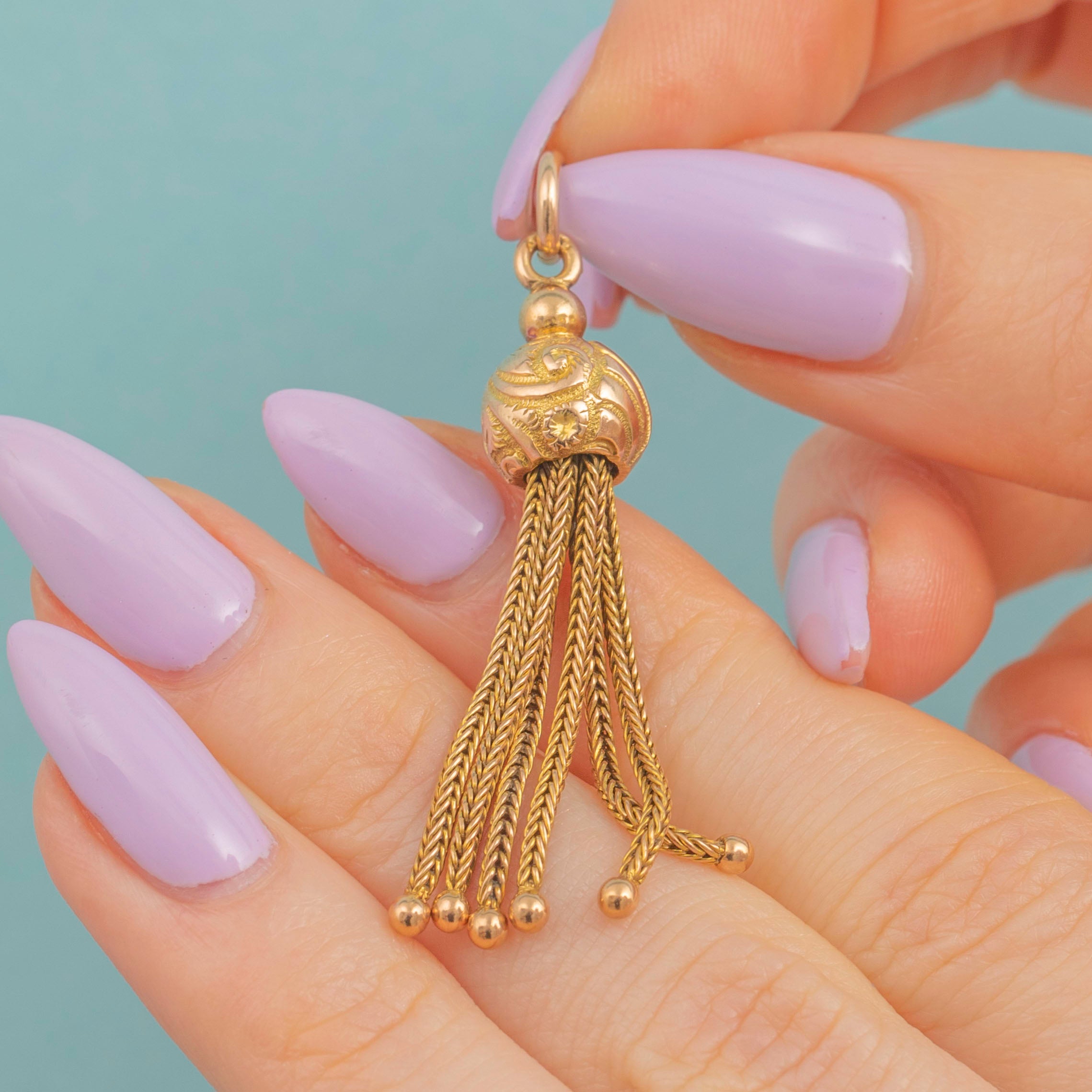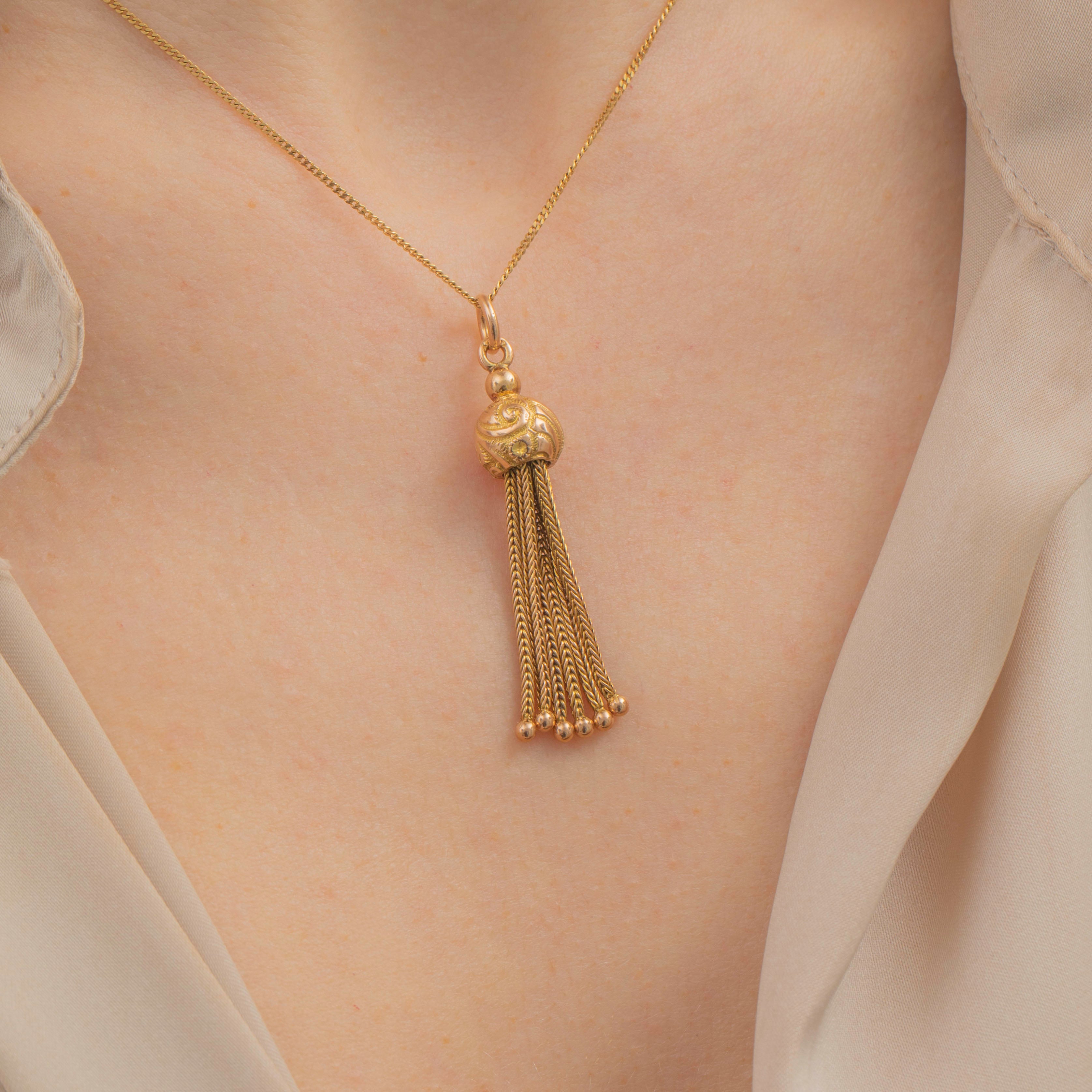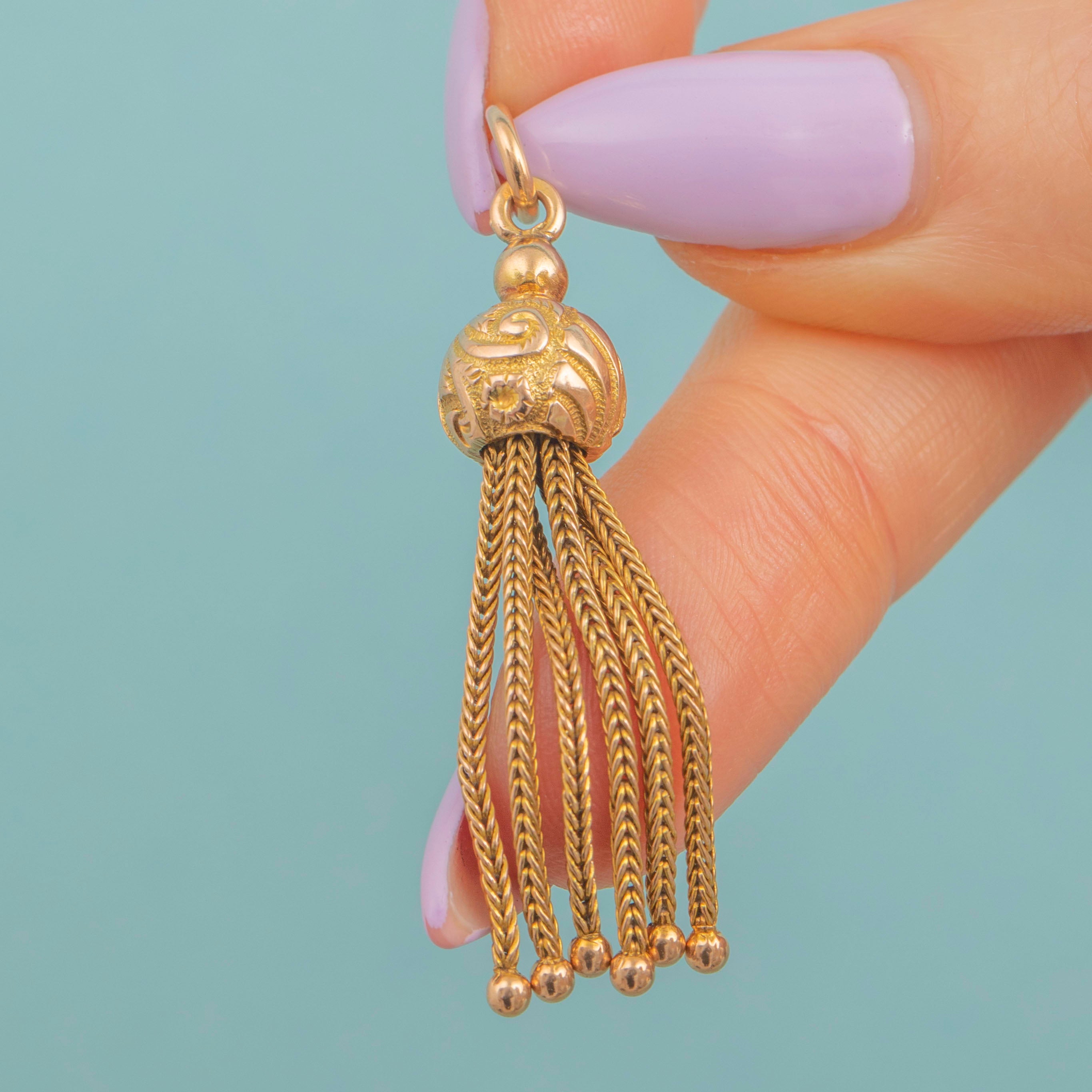 Introduce some Victorian pizzazz to your jewellery collection with this antique 9ct Gold tassel pendant! Her domed orb head is engraved with elaborate acanthus leaves and securely suspend six perfectly woven tassels below.