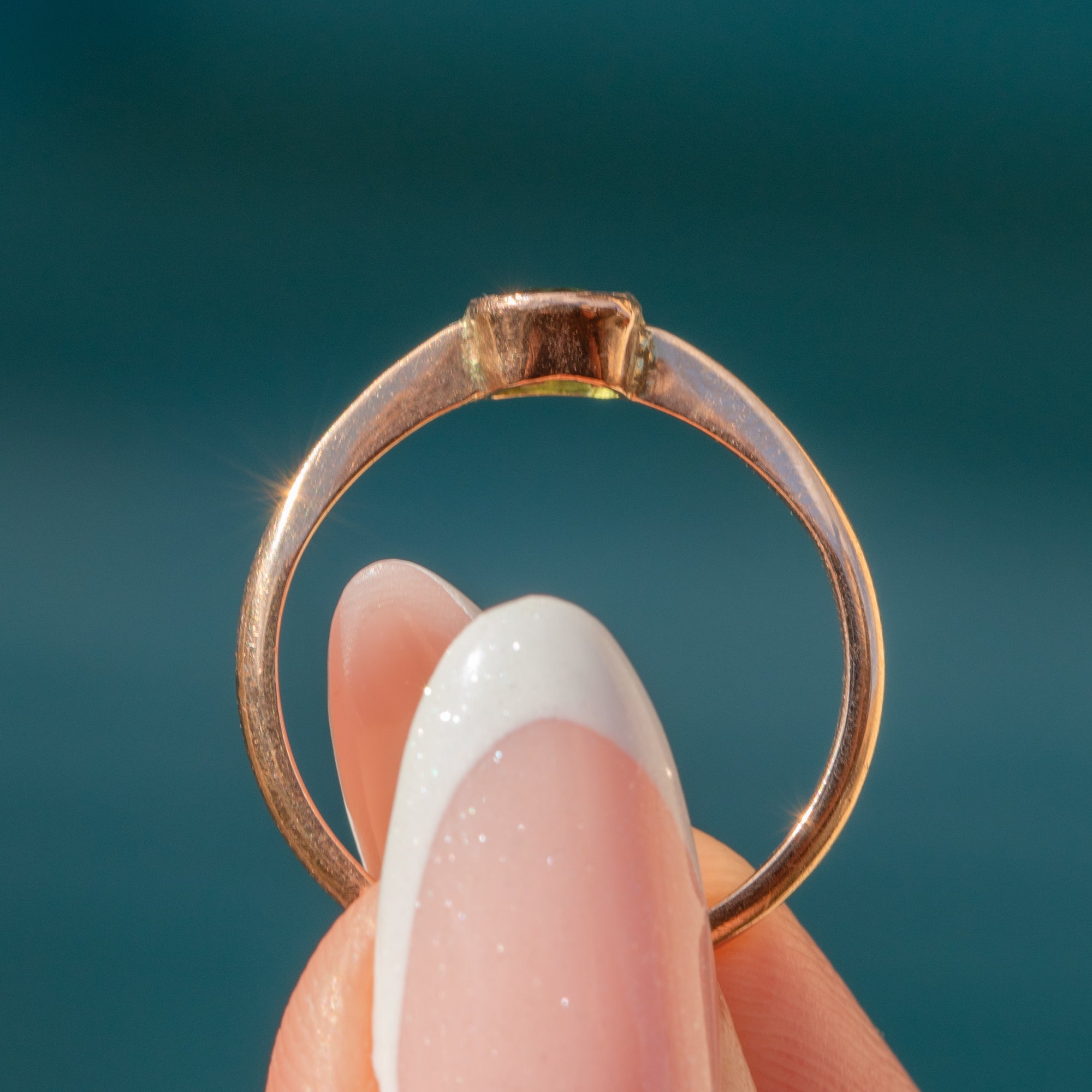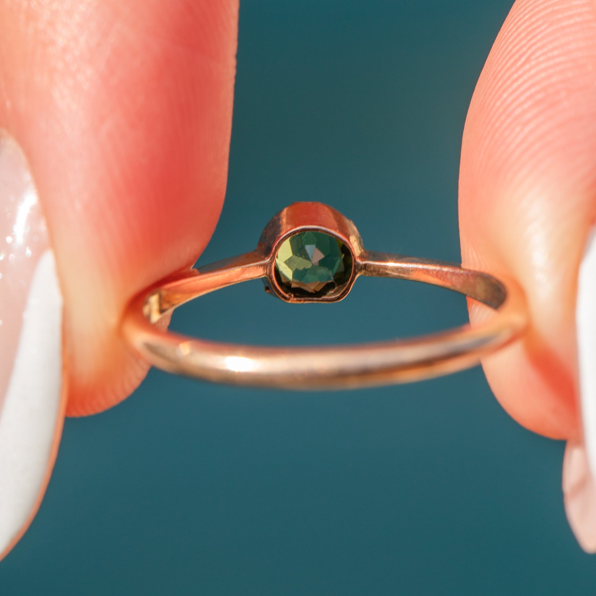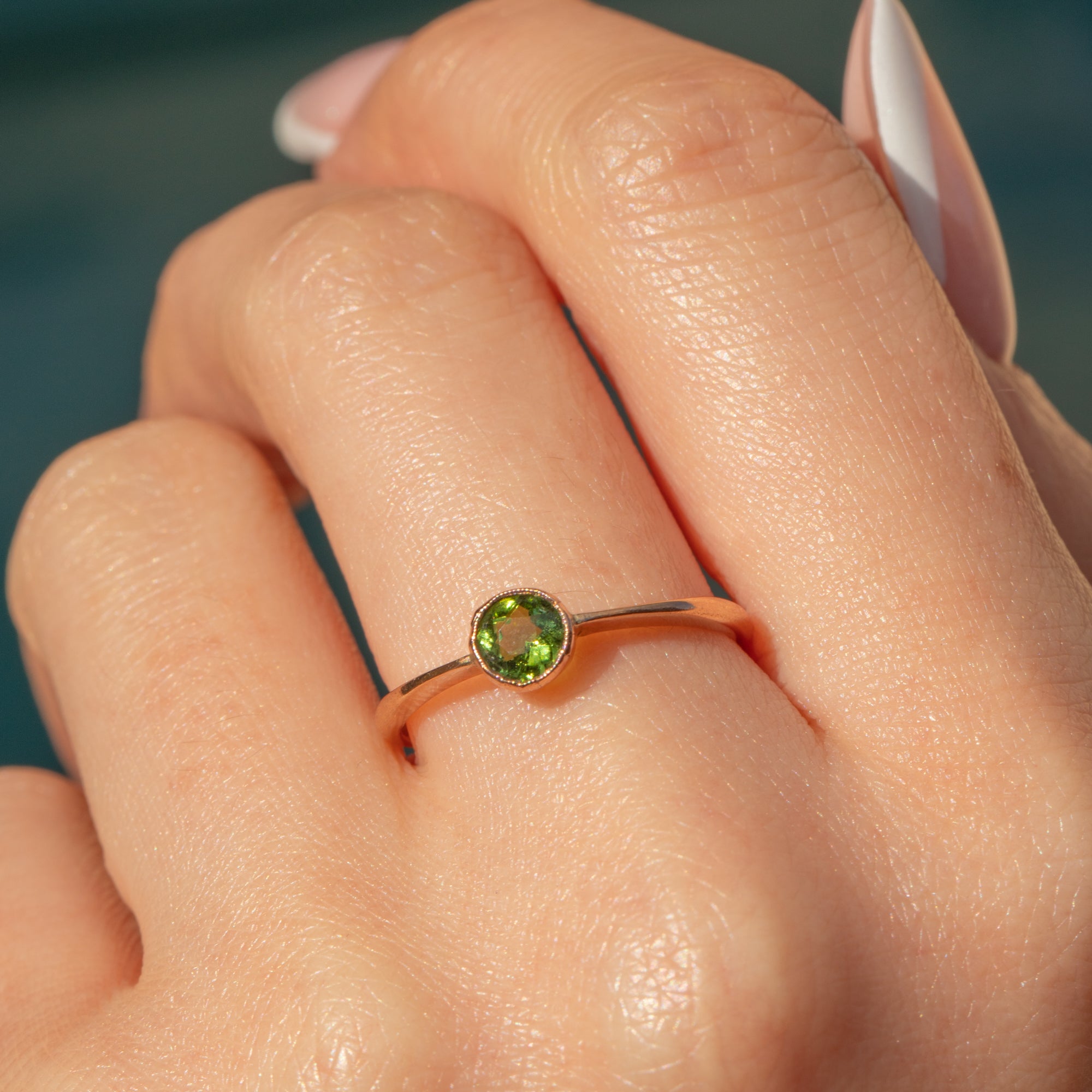 With a rosy-warm 9ct Gold band and setting effortlessly complementing the saturated green Tourmaline, you can wear this petite ring alone or stacked alongside your collection.