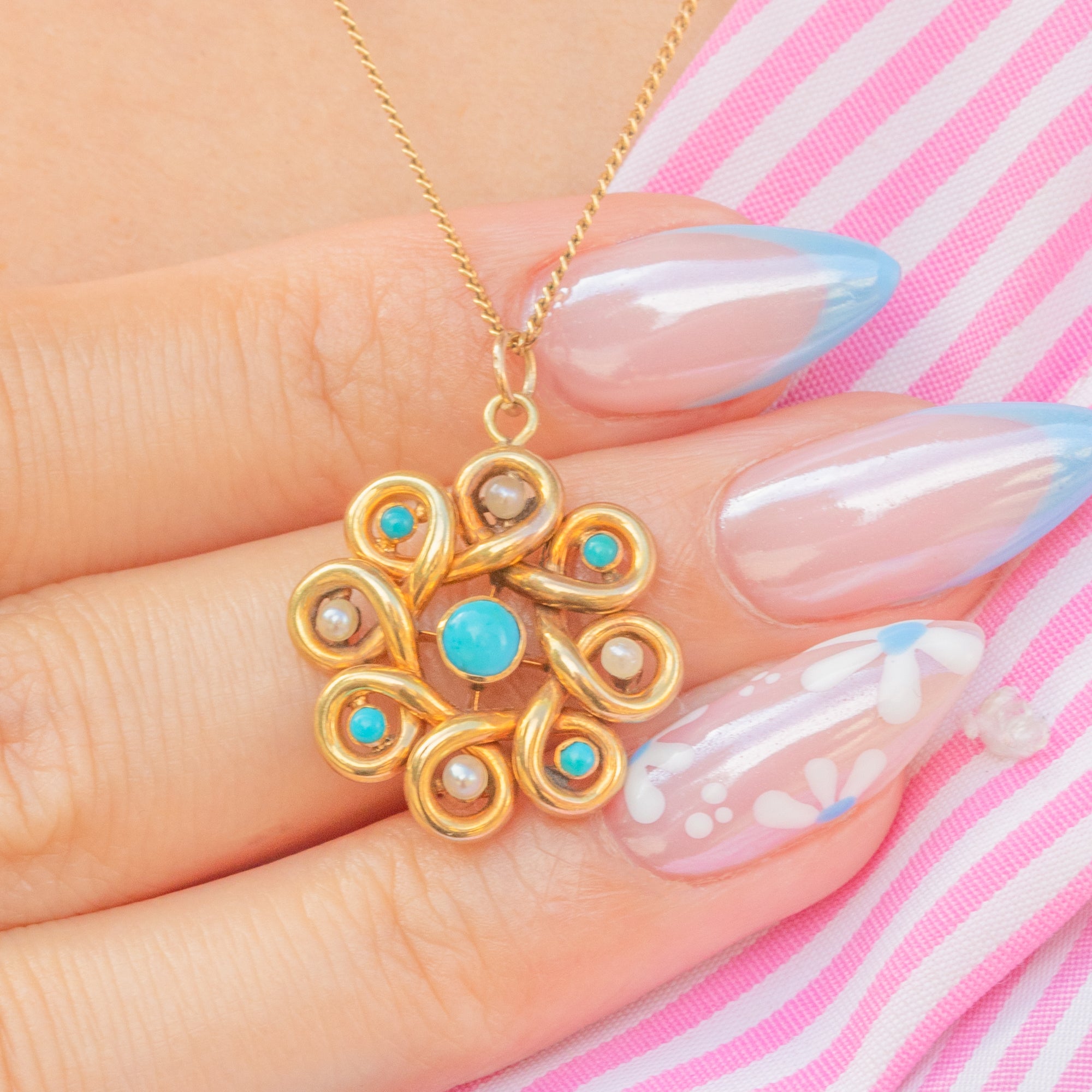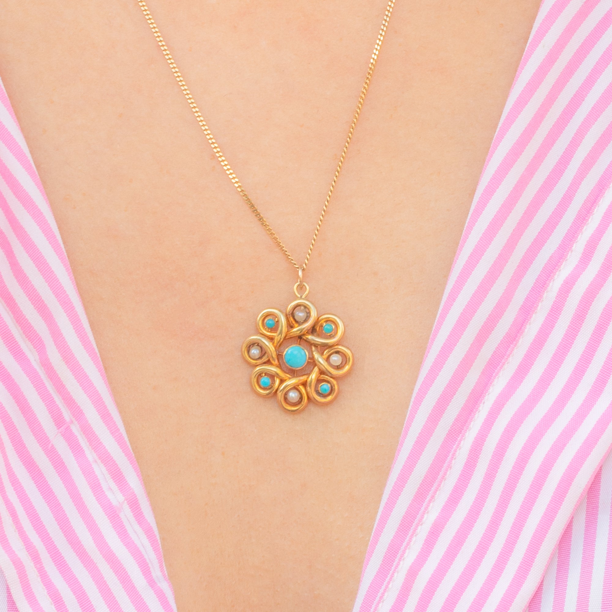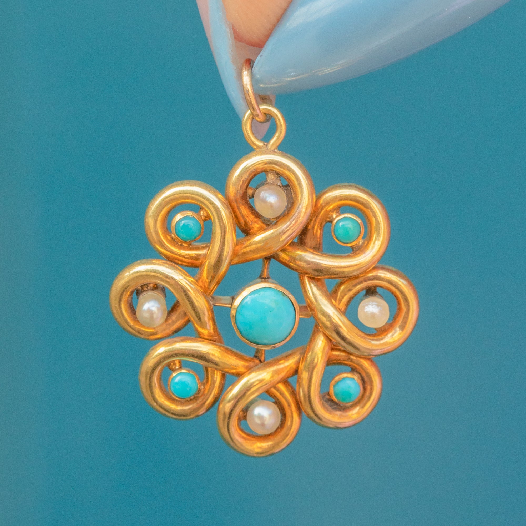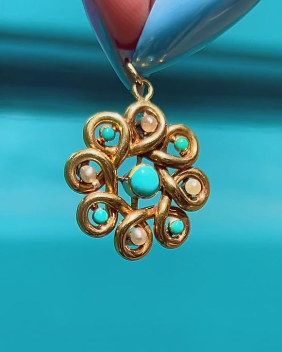 Antique 9ct Gold Turquoise Pearl Swirl Pendant