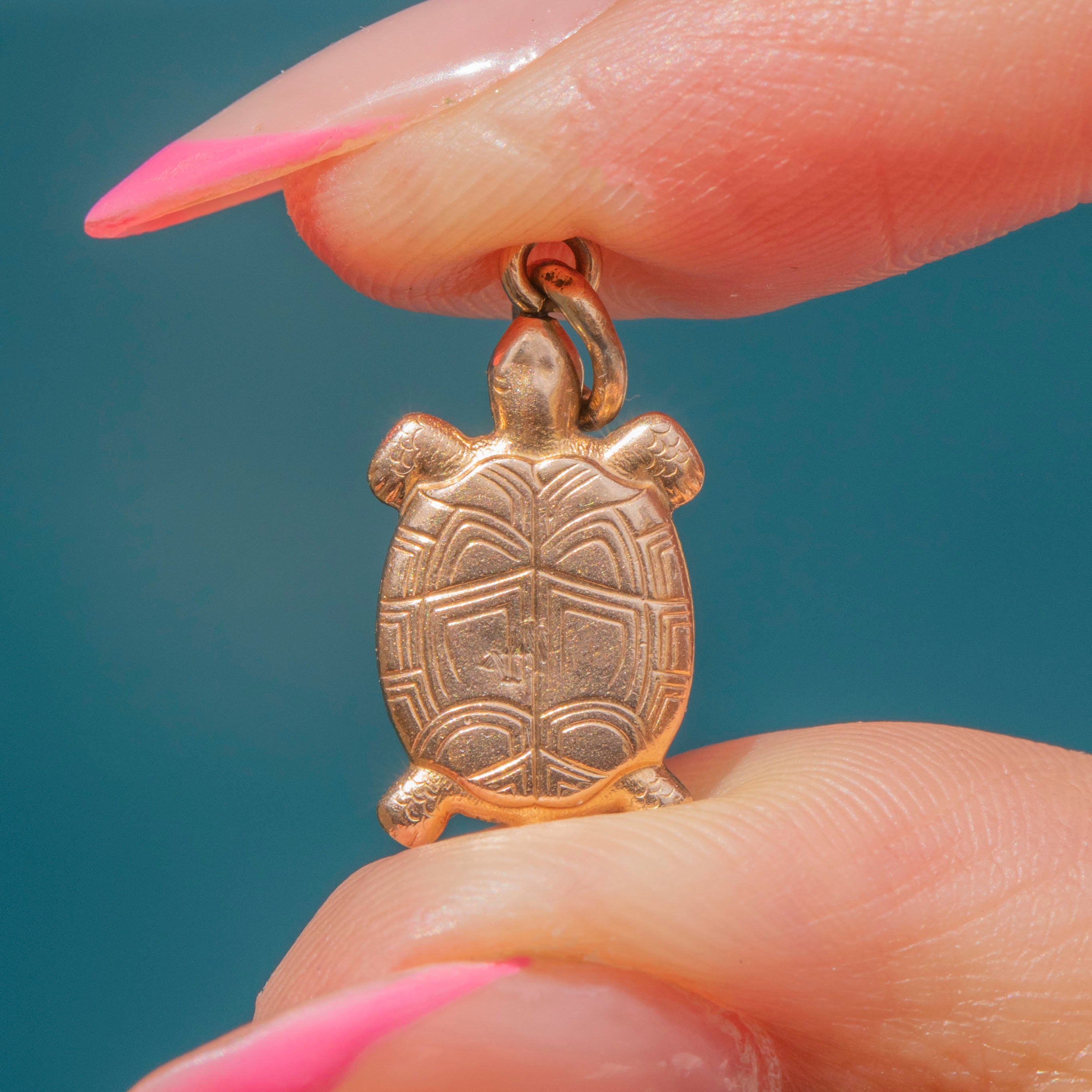 EXCELLENT: This antique 9ct Gold turtle charm is in brilliant condition. She has been crafted beautifully, with her engravings remaining crisp and detailed. There is some very light surface wear present but considering age, still remains in great condition. With a securely soldered jump ring, you can wear this antique charm with confidence!