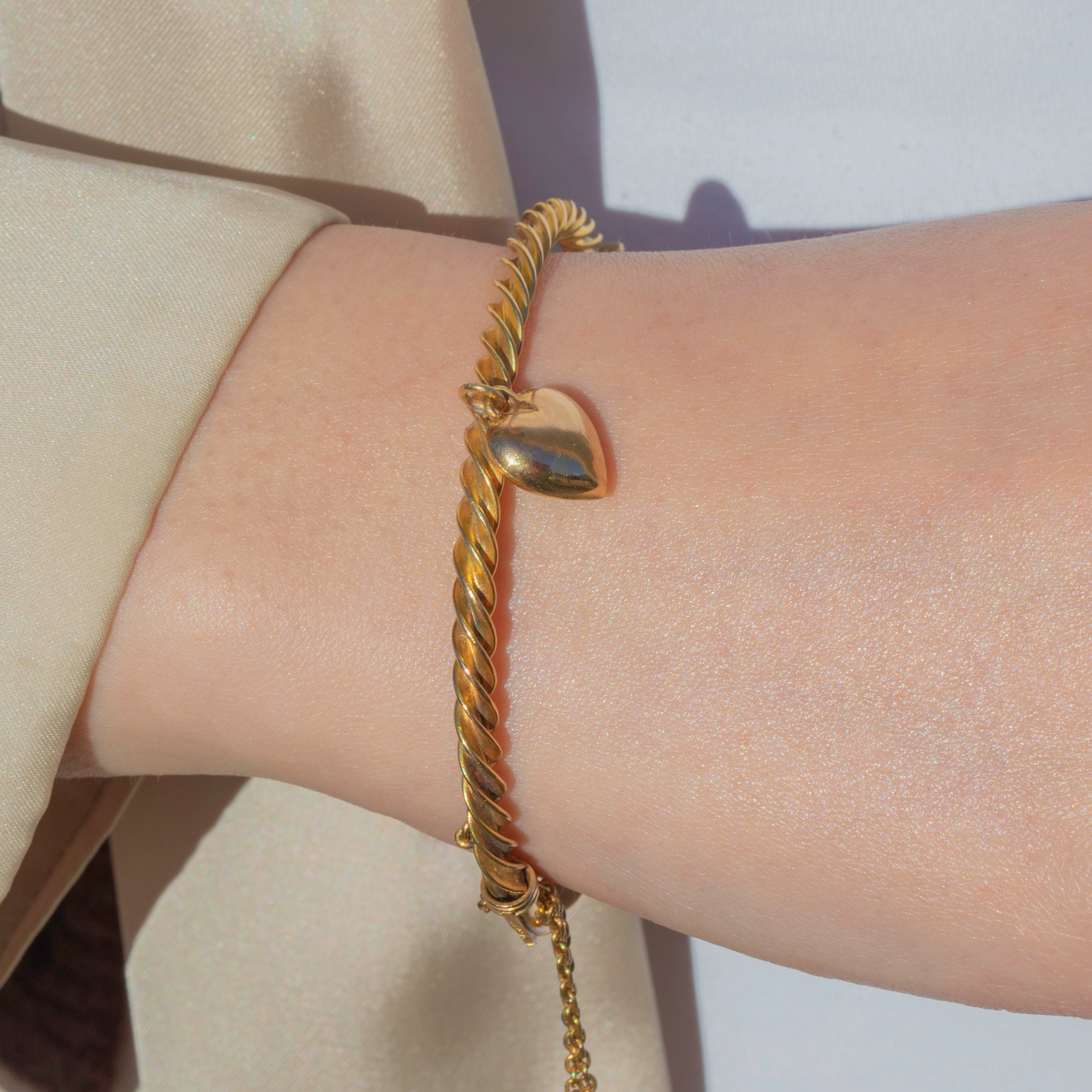 VERY GOOD: This antique 9ct Gold twist bangle is in very good overall condition, with only minor signs of wear consistent with age and use. The Gold retains a lovely warm tone, though there is some surface wear and light discolouration on the bangle band and heart charm. The clasp functions securely, closing with a satisfying click, and the original safety chain is intact, offering additional peace of mind during wear. This is a charming and wearable antique piece, full of romantic character!