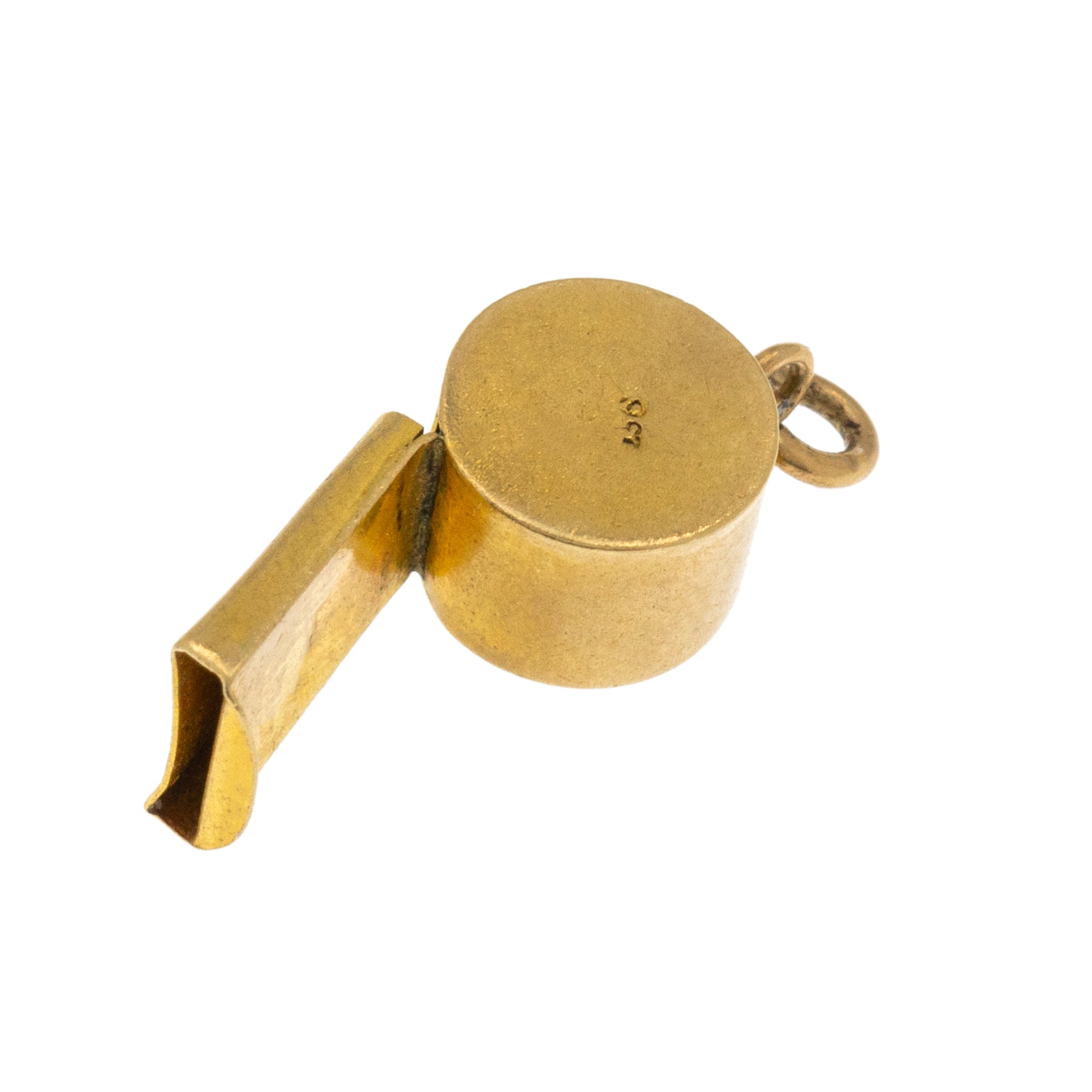 VERY GOOD. This antique 9ct Gold whistle charm is offered in very good condition. The pendant works perfectly as a whistle with a good blow, and hasn't lost its charm over the years. The Gold is buttery, and there are only a few little dings to the body of the piece, most notably by the mouthpiece. This is a gorgeous little treasure!