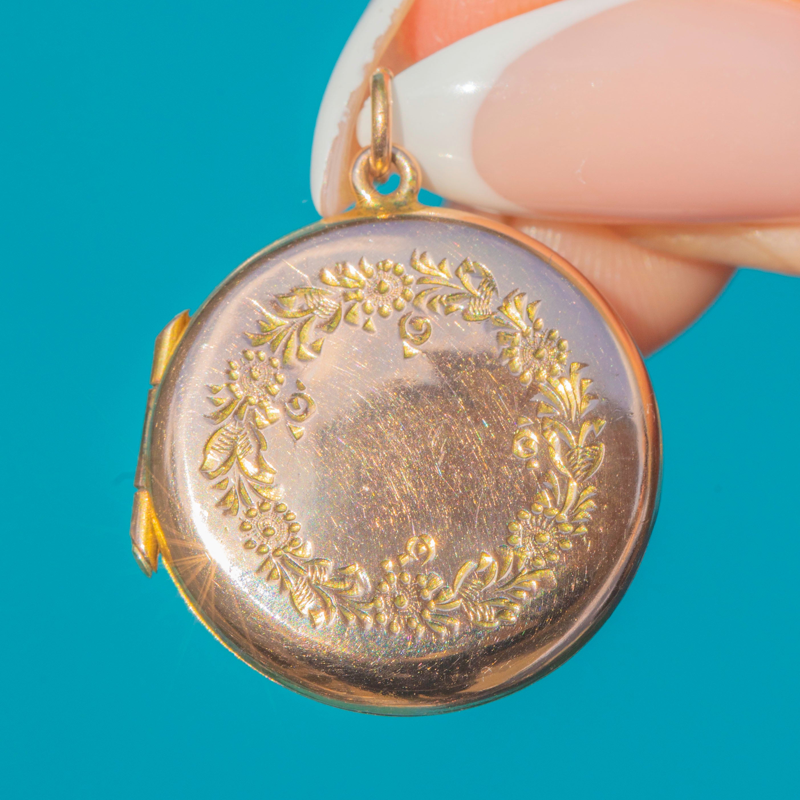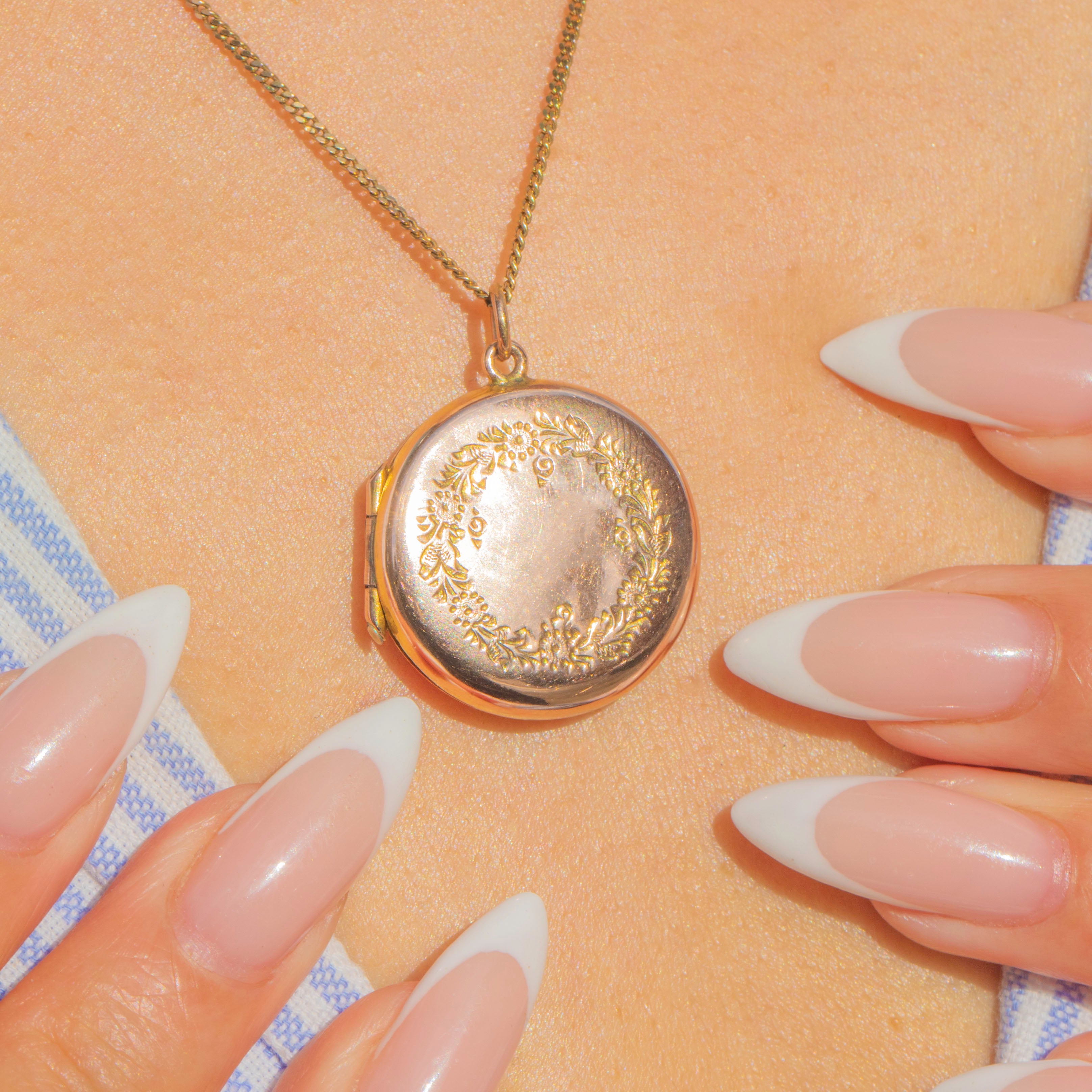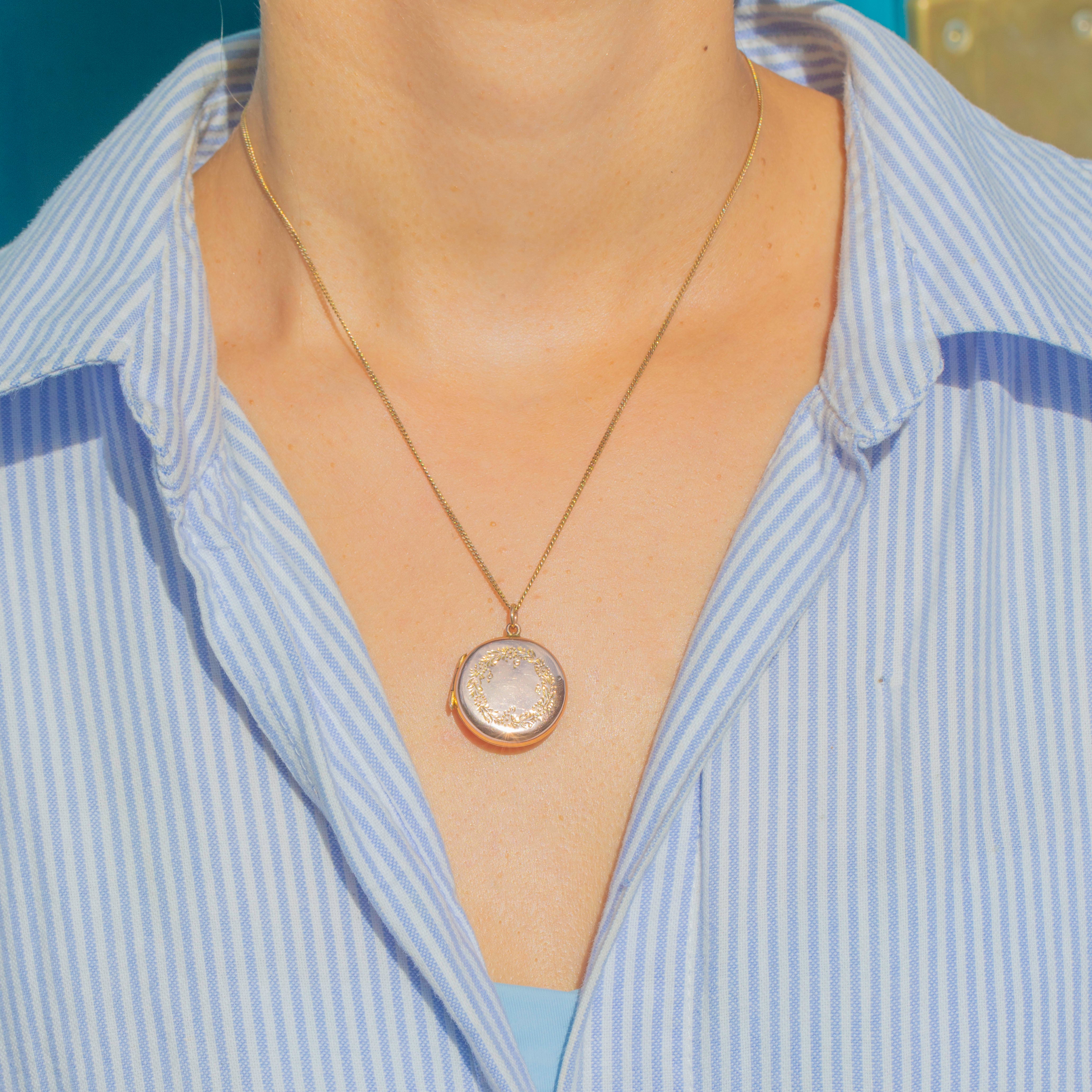 This Edwardian locket is crafted in 9ct Gold and adorned with a beautiful embossed floral wreath to the front. The circular design opens to reveal two internal frames, perfect for holding treasured photographs or mementos.