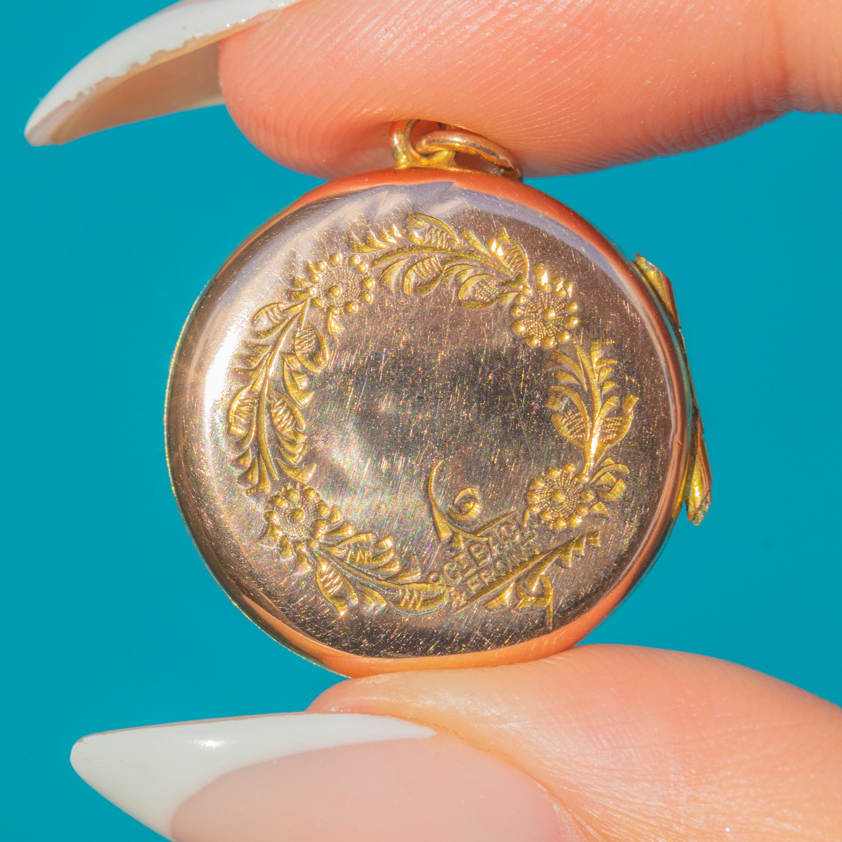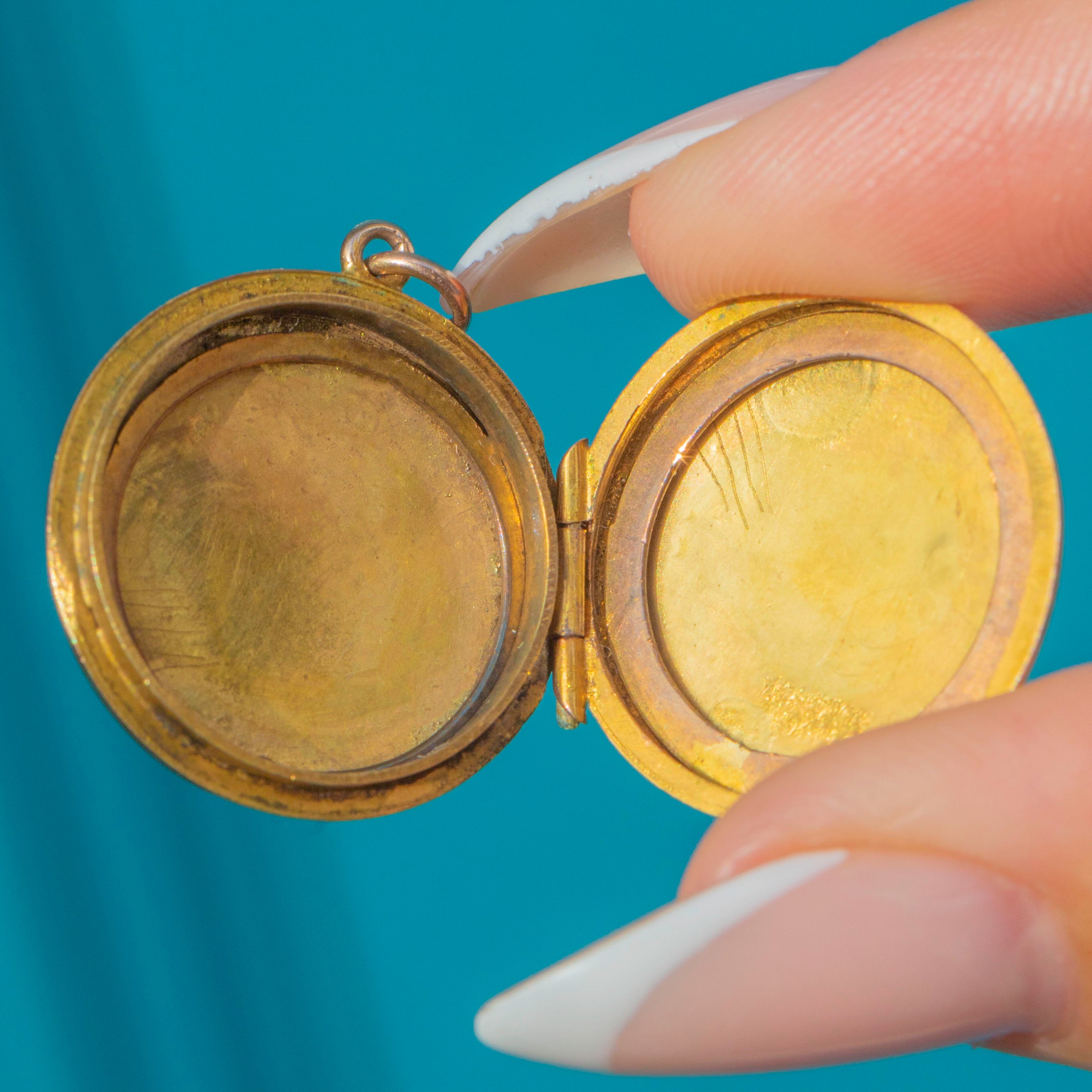 EXCELLENT: The embossed floral decoration is crisp with minimal surface wear. The locket closes securely and the hinge works smoothly. Inside frames remain intact, making this piece both practical and beautifully preserved.