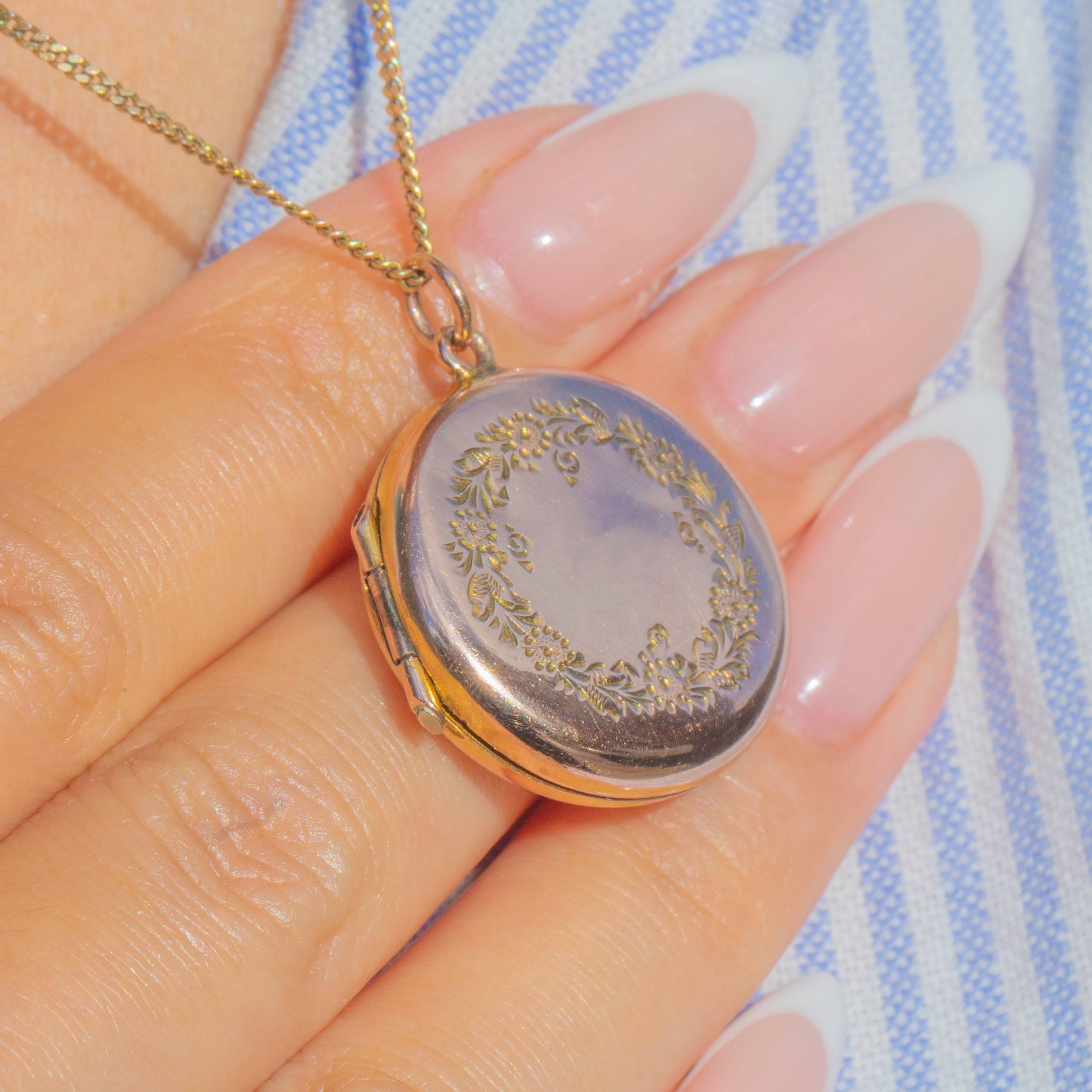 A timeless piece of sentimental jewellery, it combines delicate floral detail with practical strength, featuring Gold on the back and front reinforced with base metal to the frames and hinge for durability.