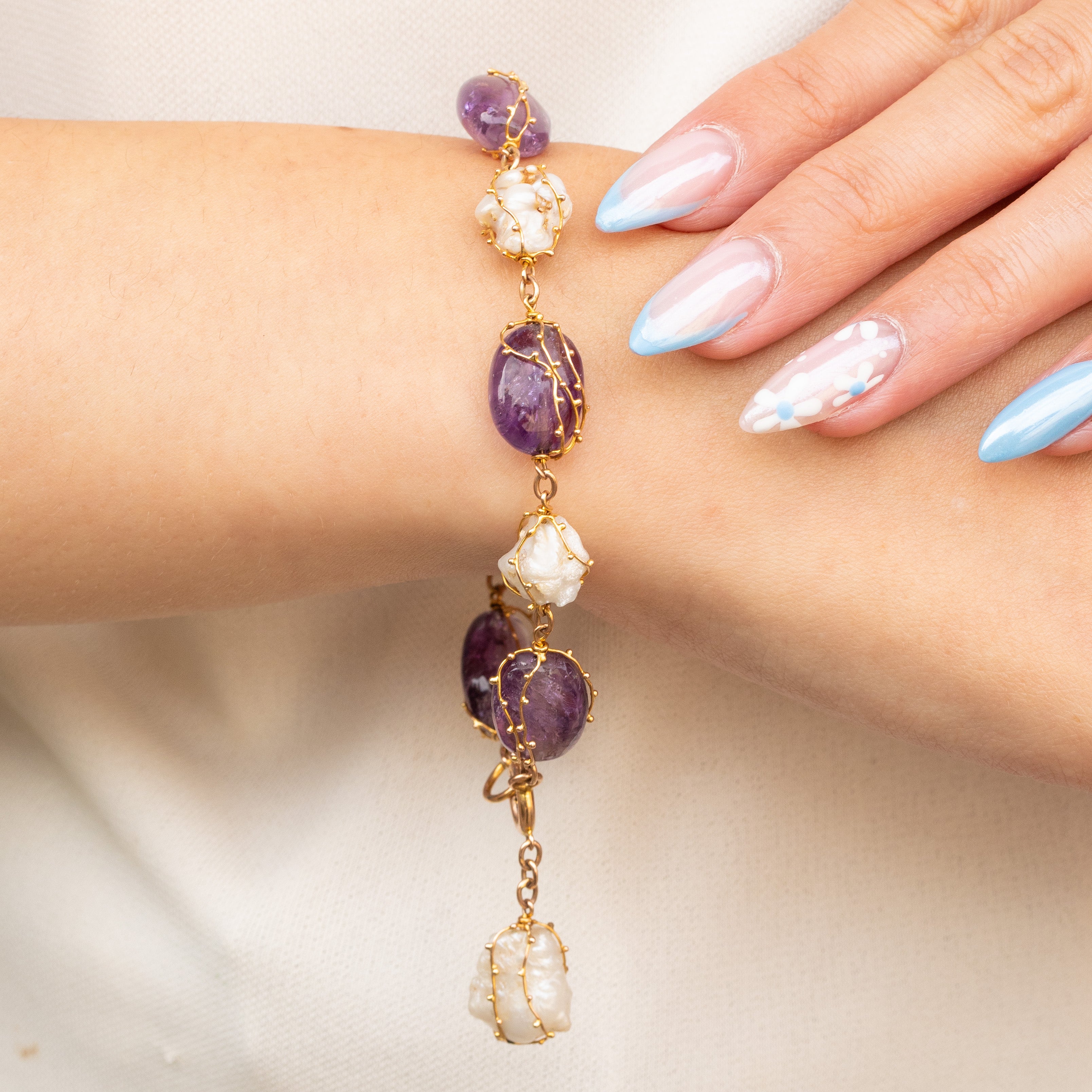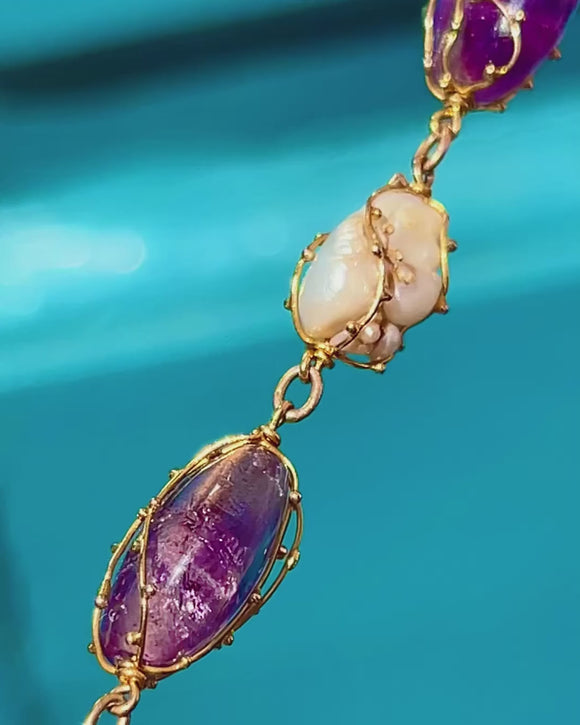 Antique Arts & Crafts Era 15ct Gold Caged Amethyst & Baroque Pearl Bracelet