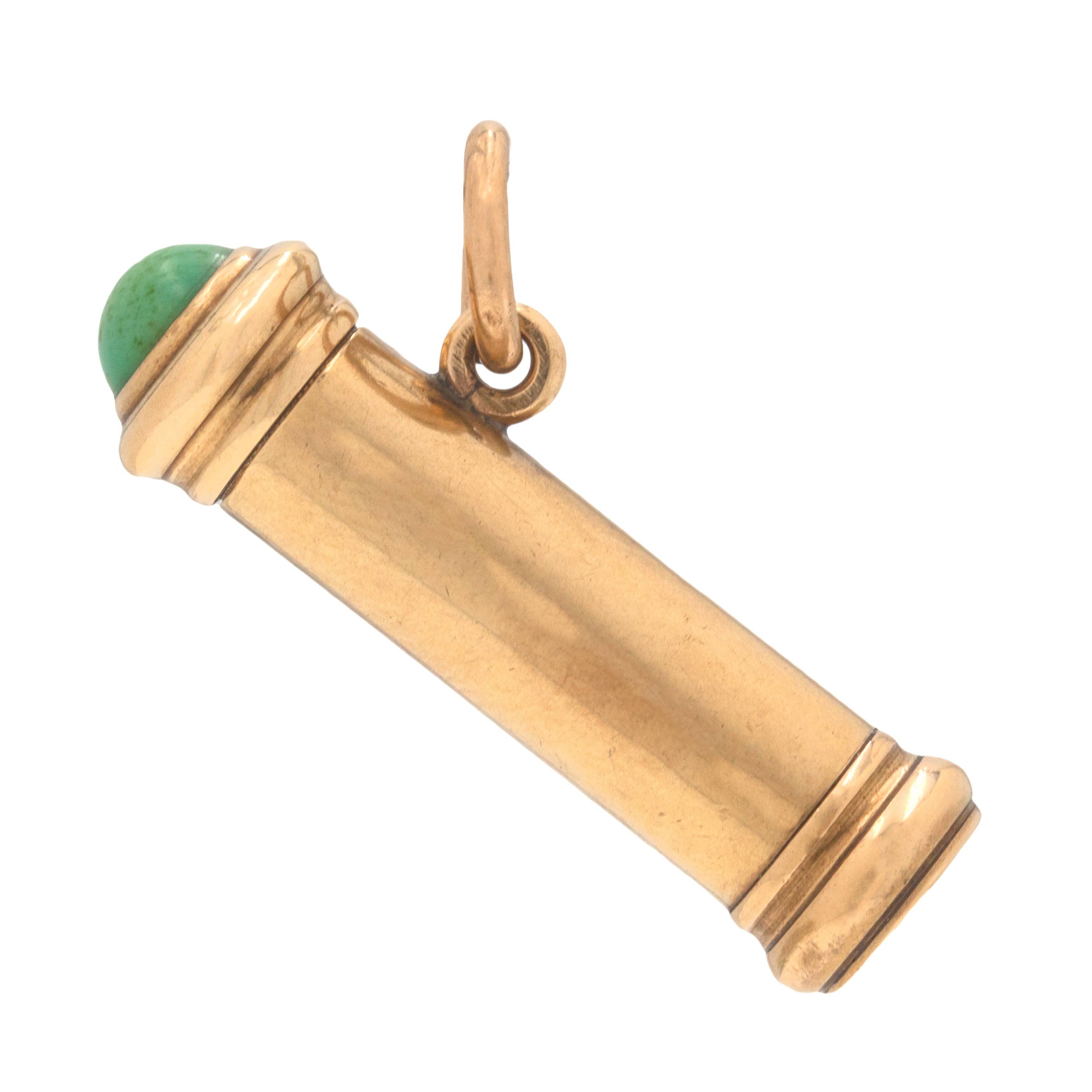 VERY GOOD. This antique Asprey 9ct Gold Turquoise mechanical pendant is in very good condition! Over 100 years old, this piece has lasted very well, with the mechanical function allowing the pencil to work as it originally would. The inside of the pendant has some minor discolouration present, but this doesn't affect its functionality. The pencil has a gorgeous Gold hue, the lead is still present, and there is a clear ASPREY stamp on the inside.