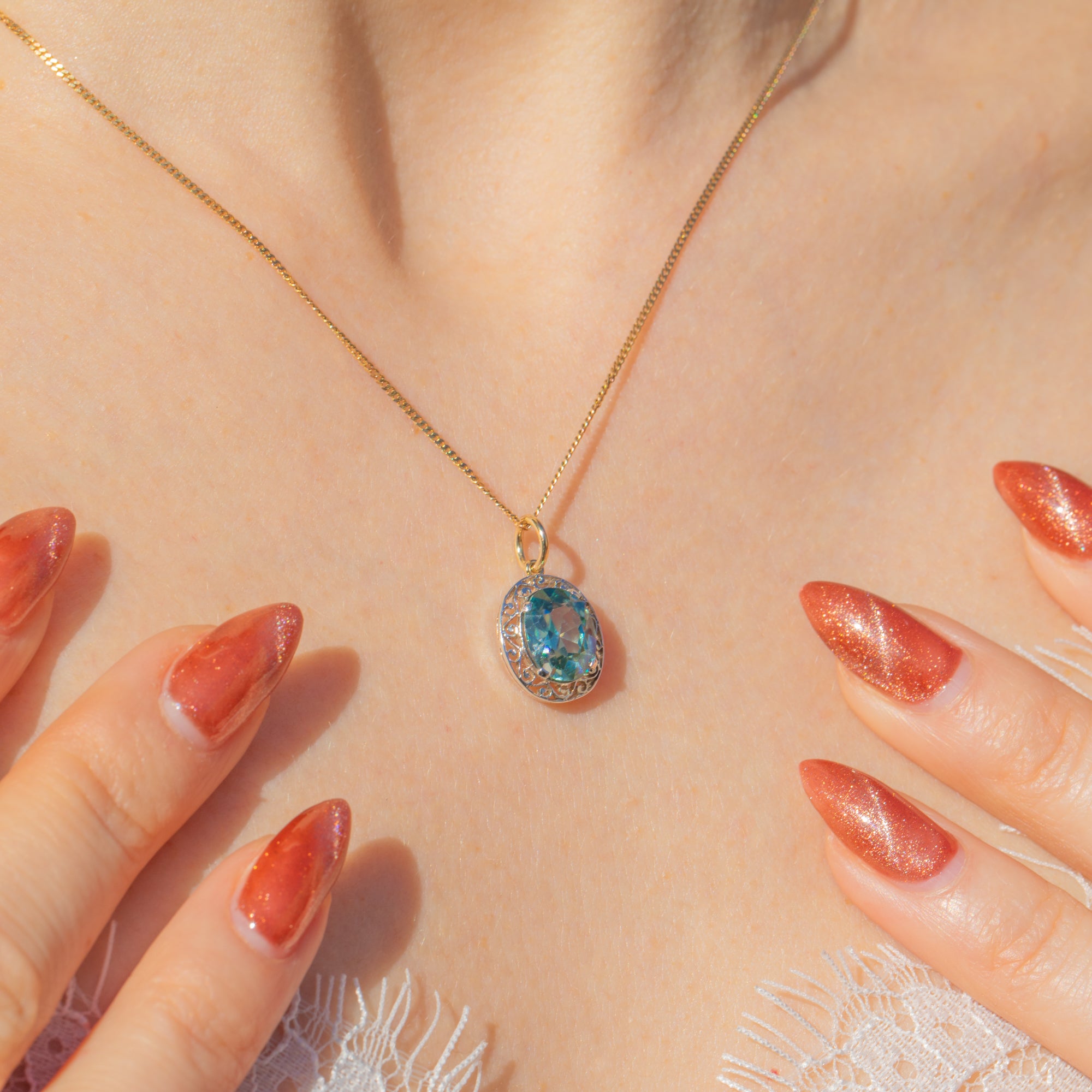 In her centre sits a 2.60ct blue Zircon, faceted wonderfully and radiating cool azure hues as she catches the light. She is steeped in antique charm, with an ornate Silver setting, providing a lovely depth and texture to this pendant.