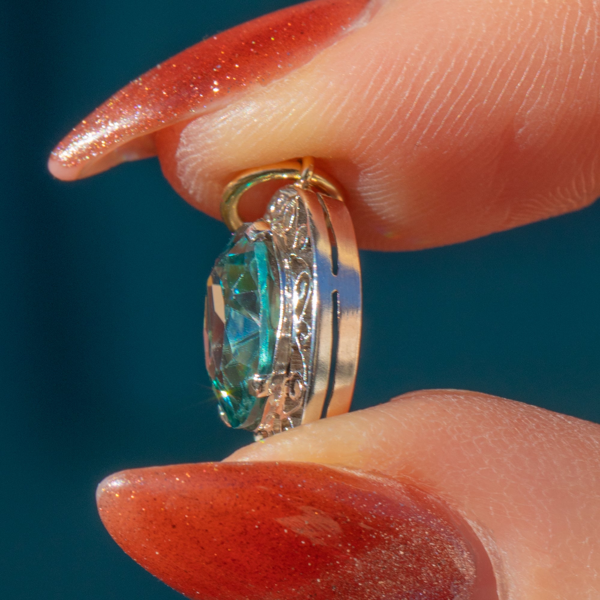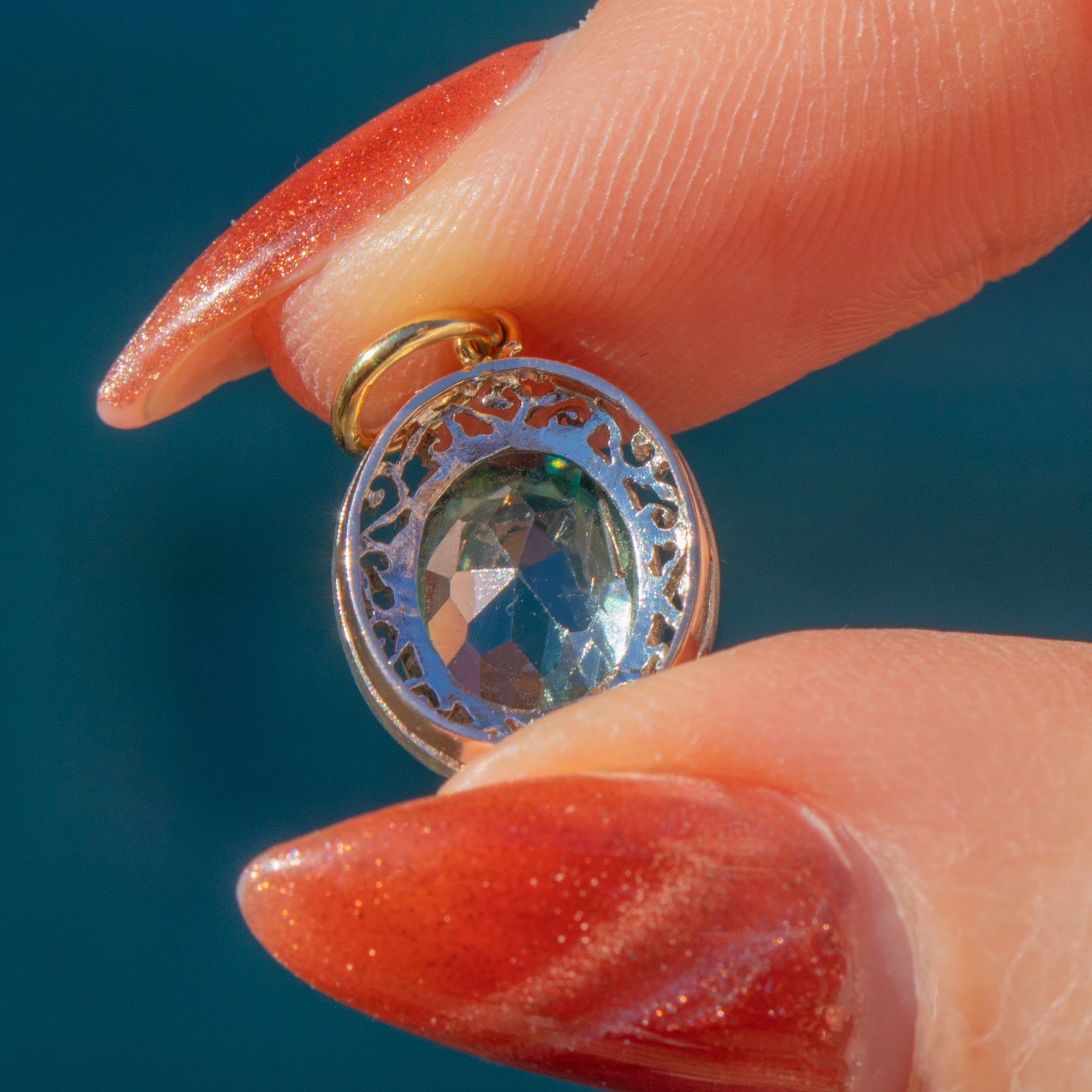 Add a pop of colour to your attire with this antique Blue Zircon filigree charm!