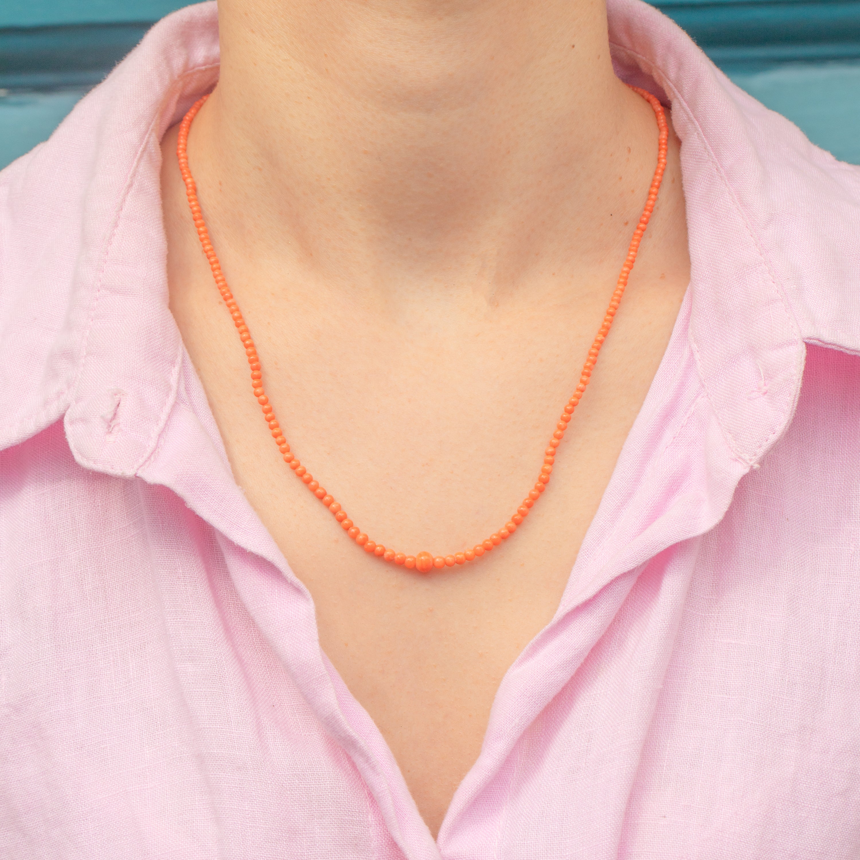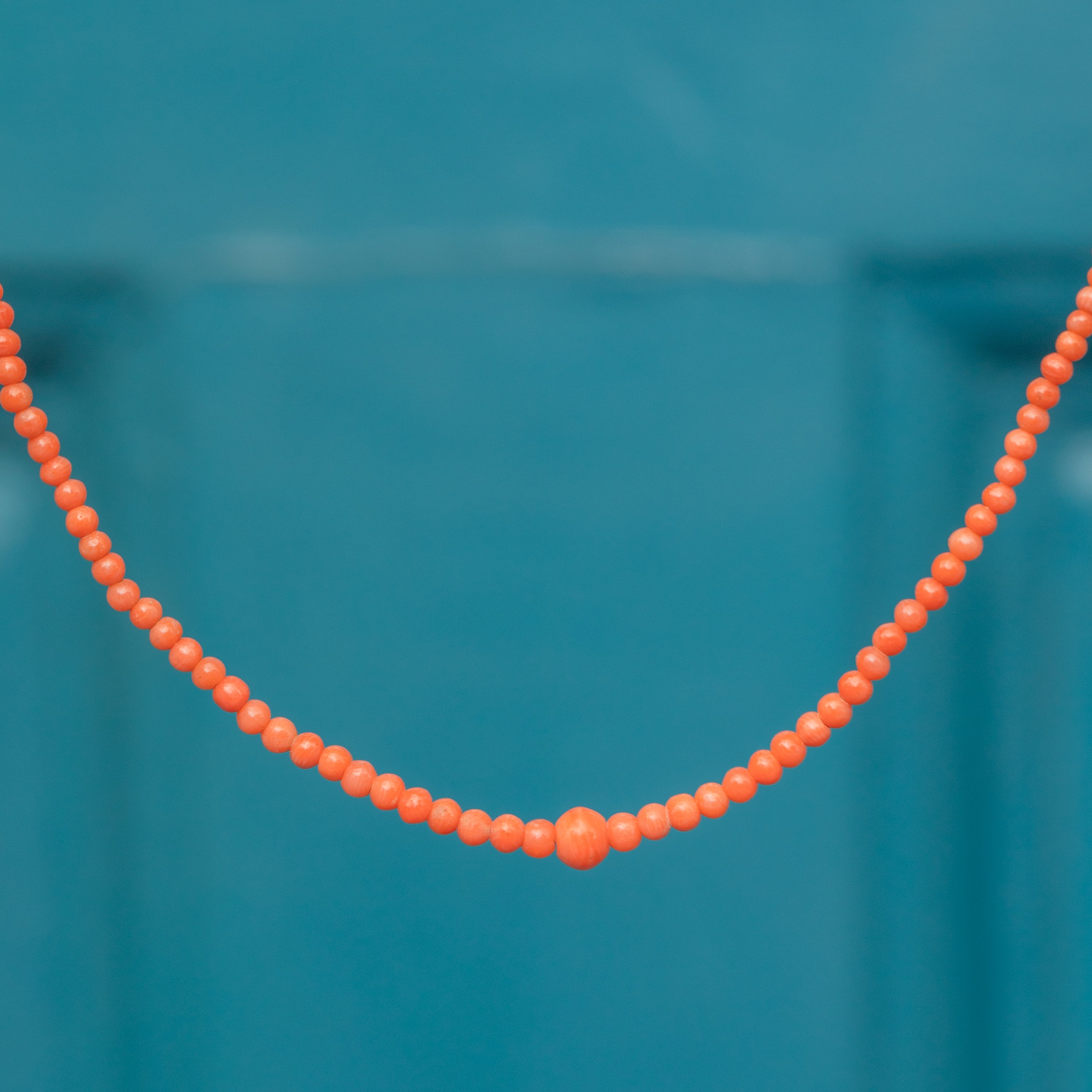 This antique Coral beaded necklace will add a feminine flourish to your décolletage! The graduating Coral beads display a lovely variation in hue, highlighting their natural beauty, and are centred by a larger bead that will rest elegantly between your collarbones.