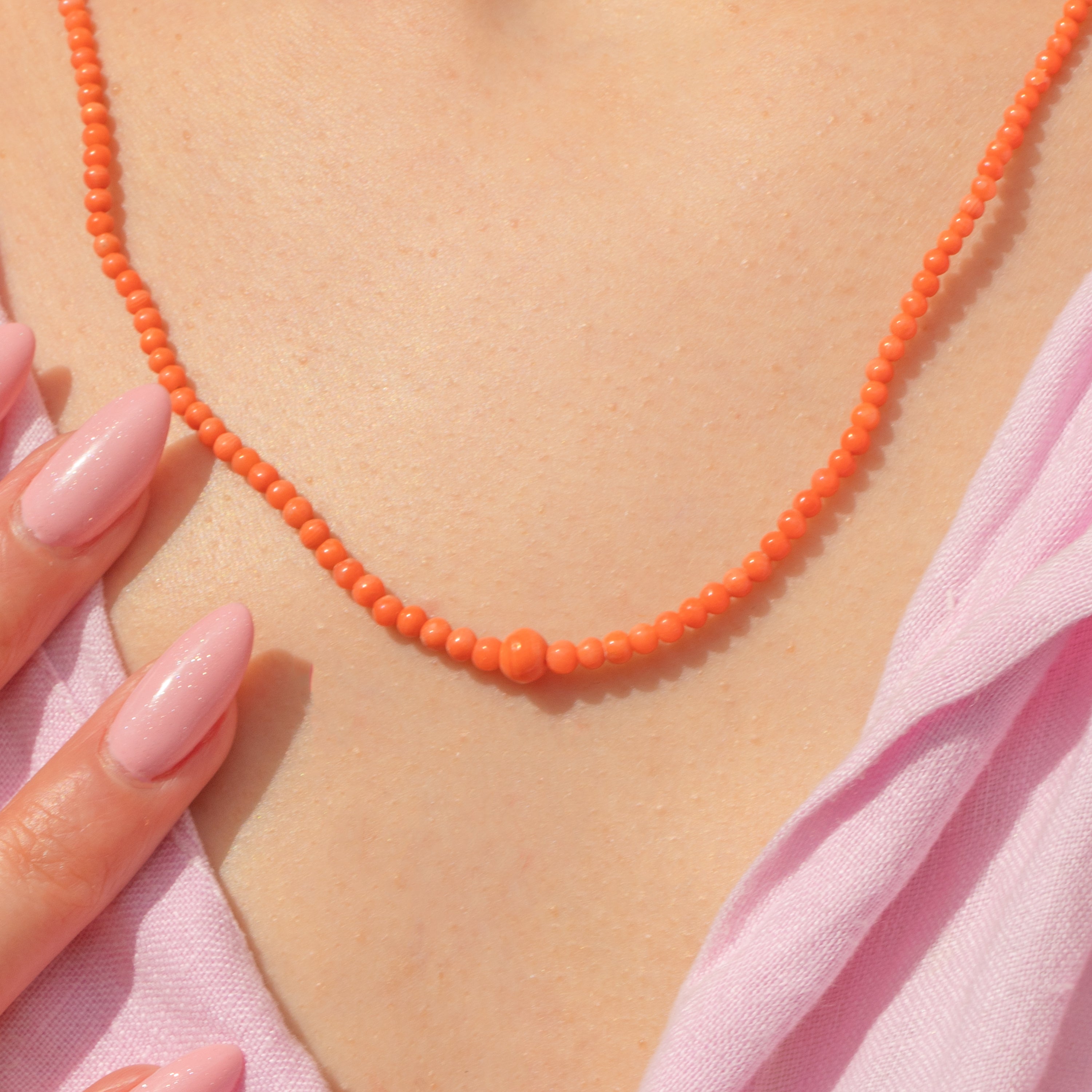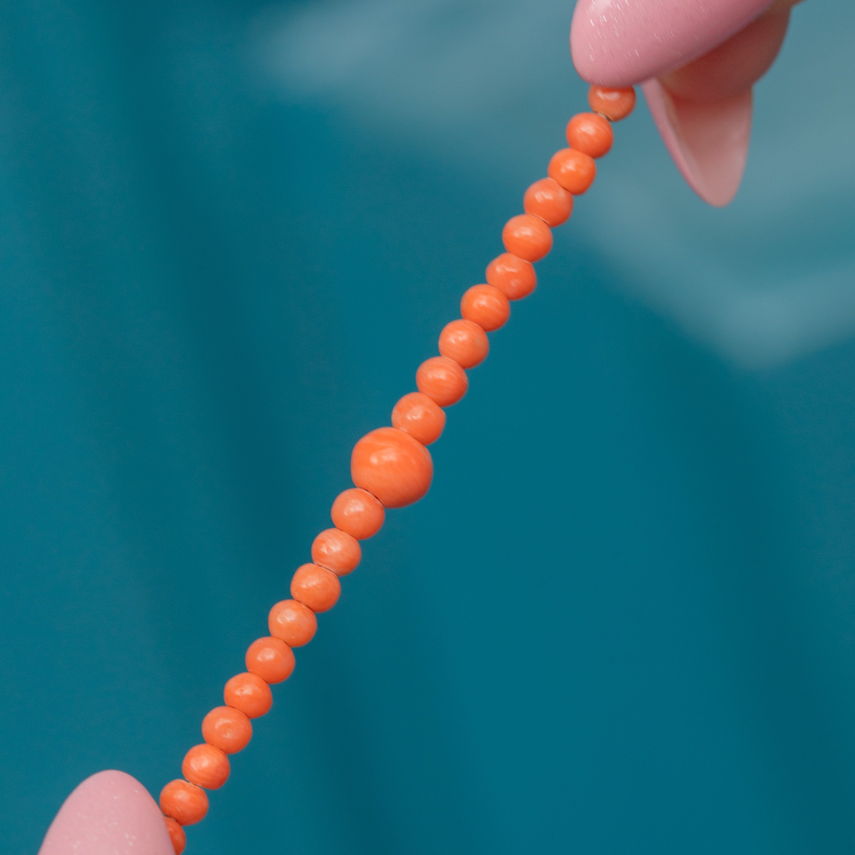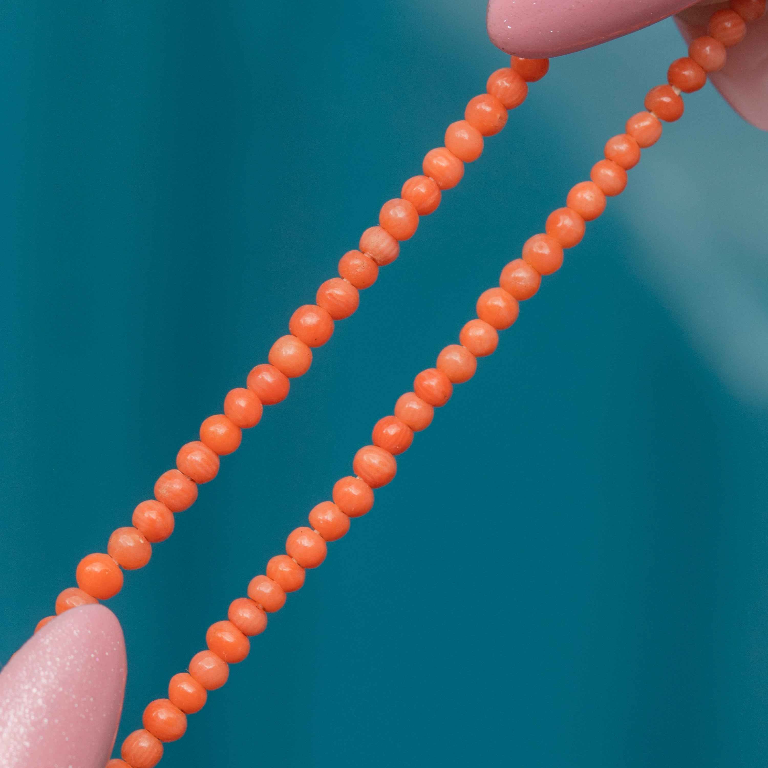Coral beads graduate from 3mm to 5mm in diameter.