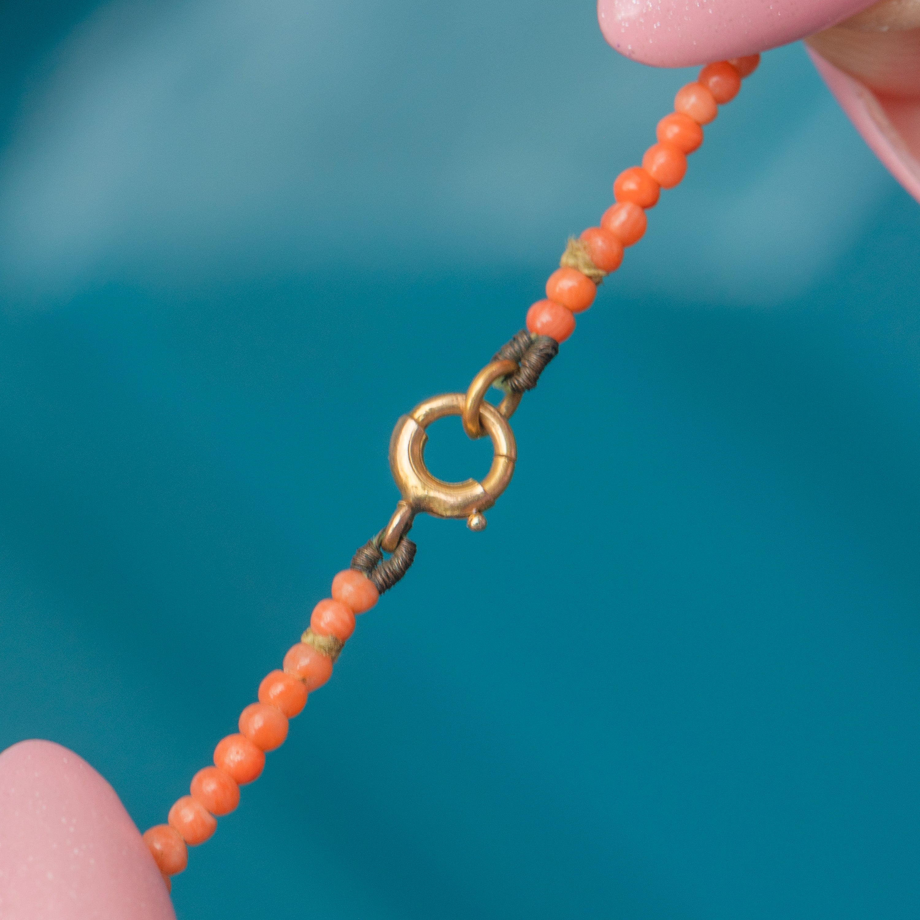 The necklace is securely affixed around the neck by a solid 15ct Gold bolt-ring for a luxurious finishing touch. Whether worn as a standalone piece or stacked in a curated neck mess, this Victorian Coral necklace is an easy-to-style piece bursting with antique charm!