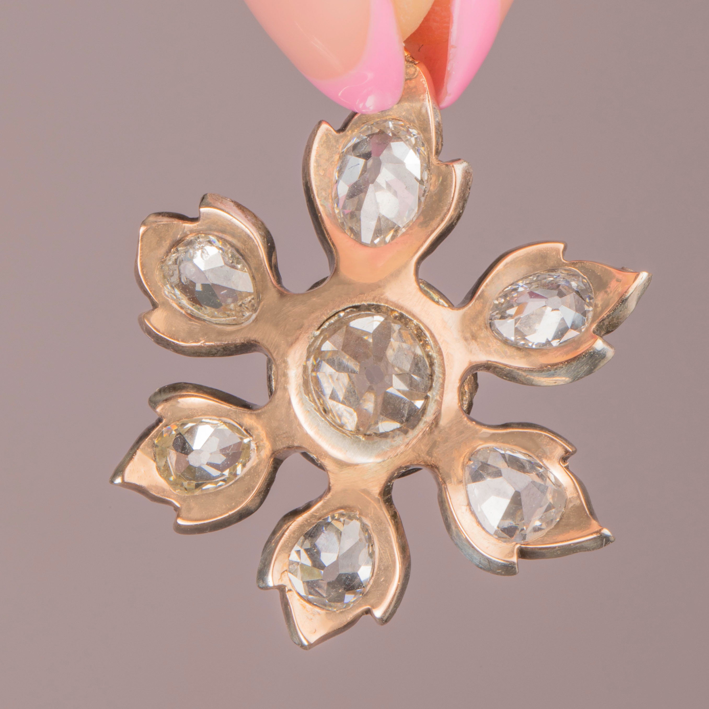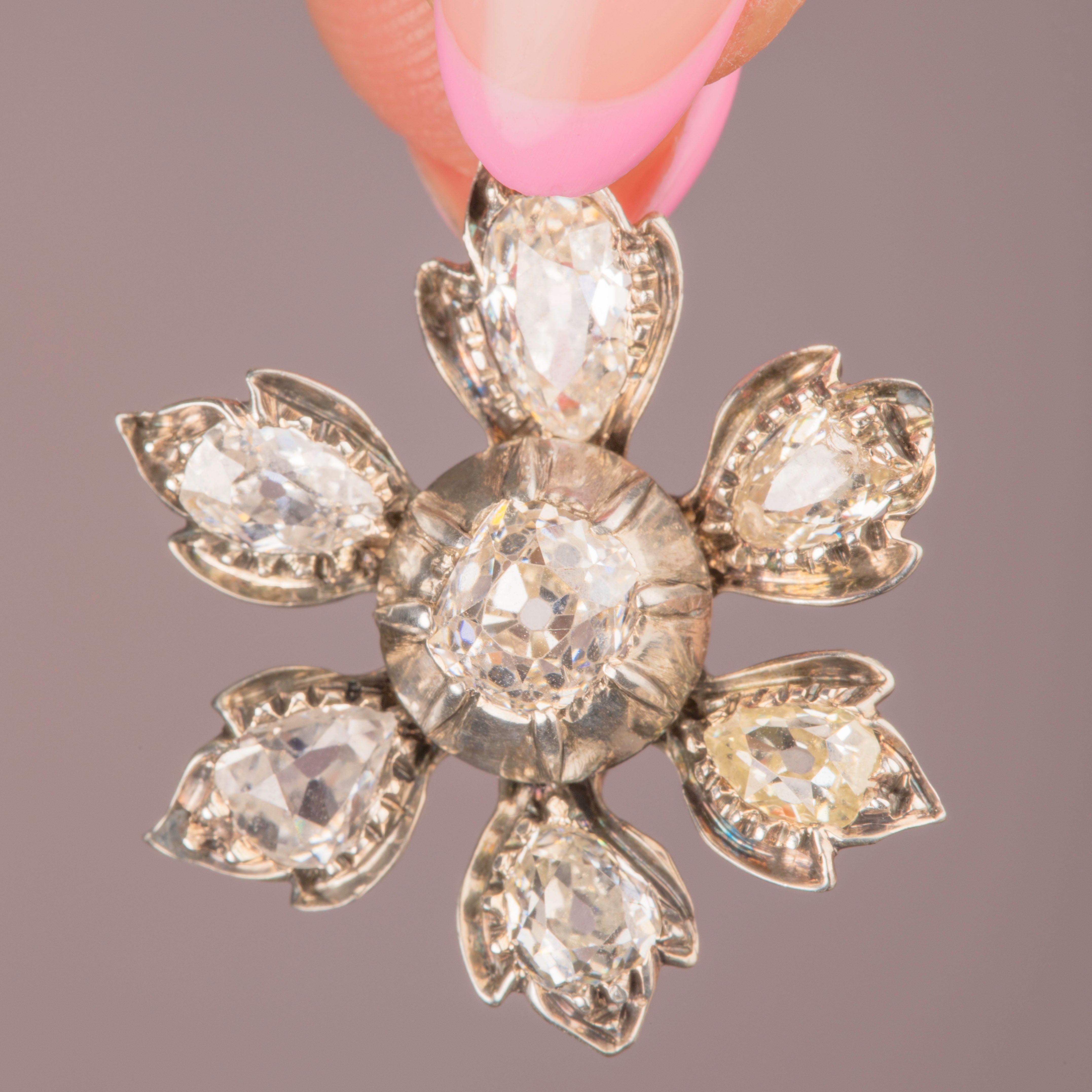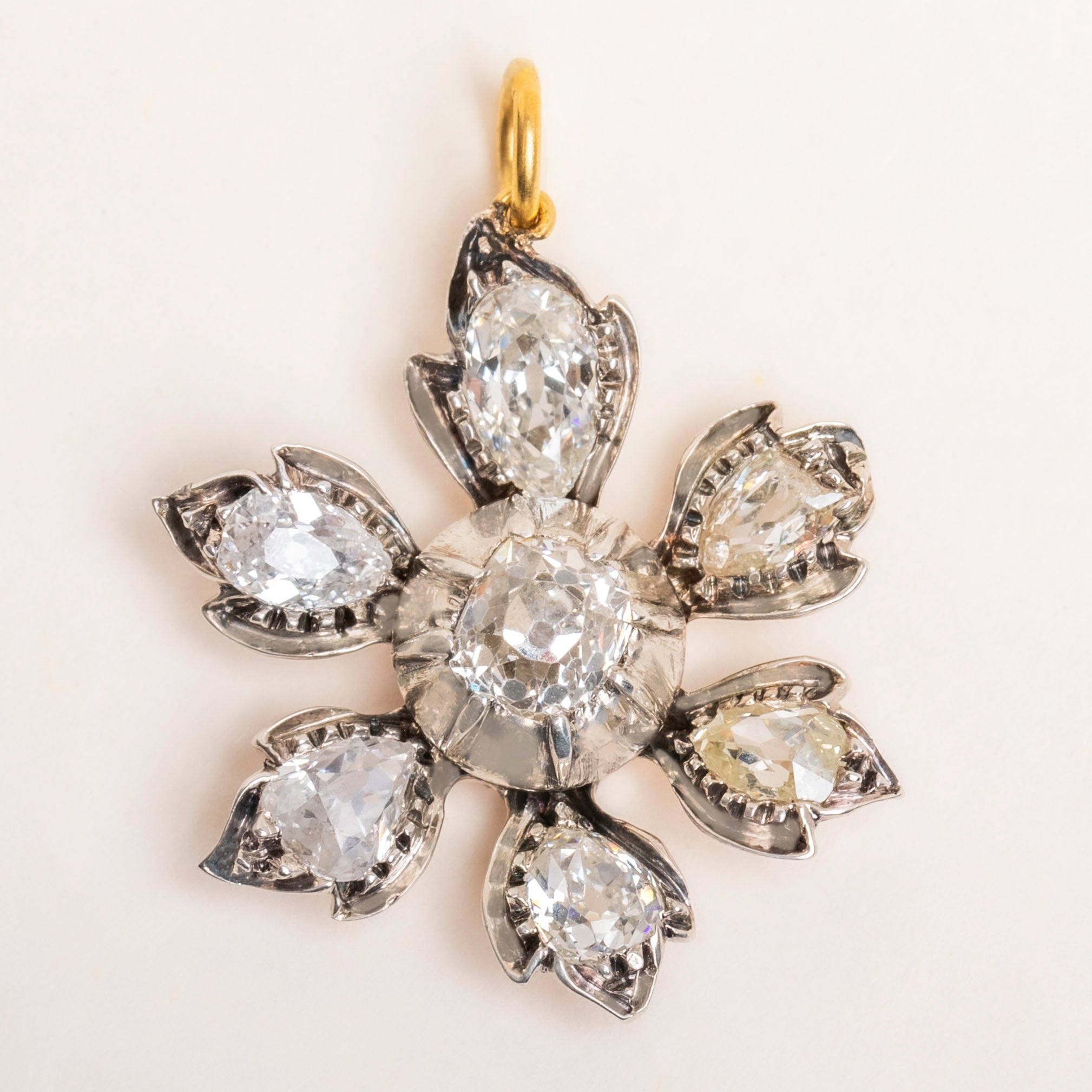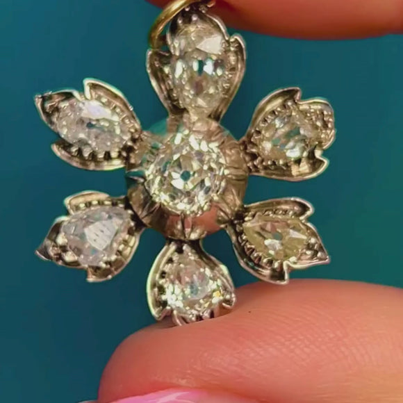 VERY GOOD-EXCELLENT. This antique Diamond flower pendant is in wonderful condition. The Diamonds are all secure within their collet settings, flaunting some of the most vivacious sparkles we've seen, free from any flea bites or chips to note. Each Diamond has an open culet, a sign of high quality antique Diamonds, which hard to come by these days. The pendant itself is well formed, with lovely whimsical petals securely soldered to the main body of the piece. There is some subtle wear on the back, more notable at the centre, however this cannot be seen when worn and does not affect the integrity of the piece. With a soldered jump-ring, you can wear this antique Diamond pendant with the utmost confidence!