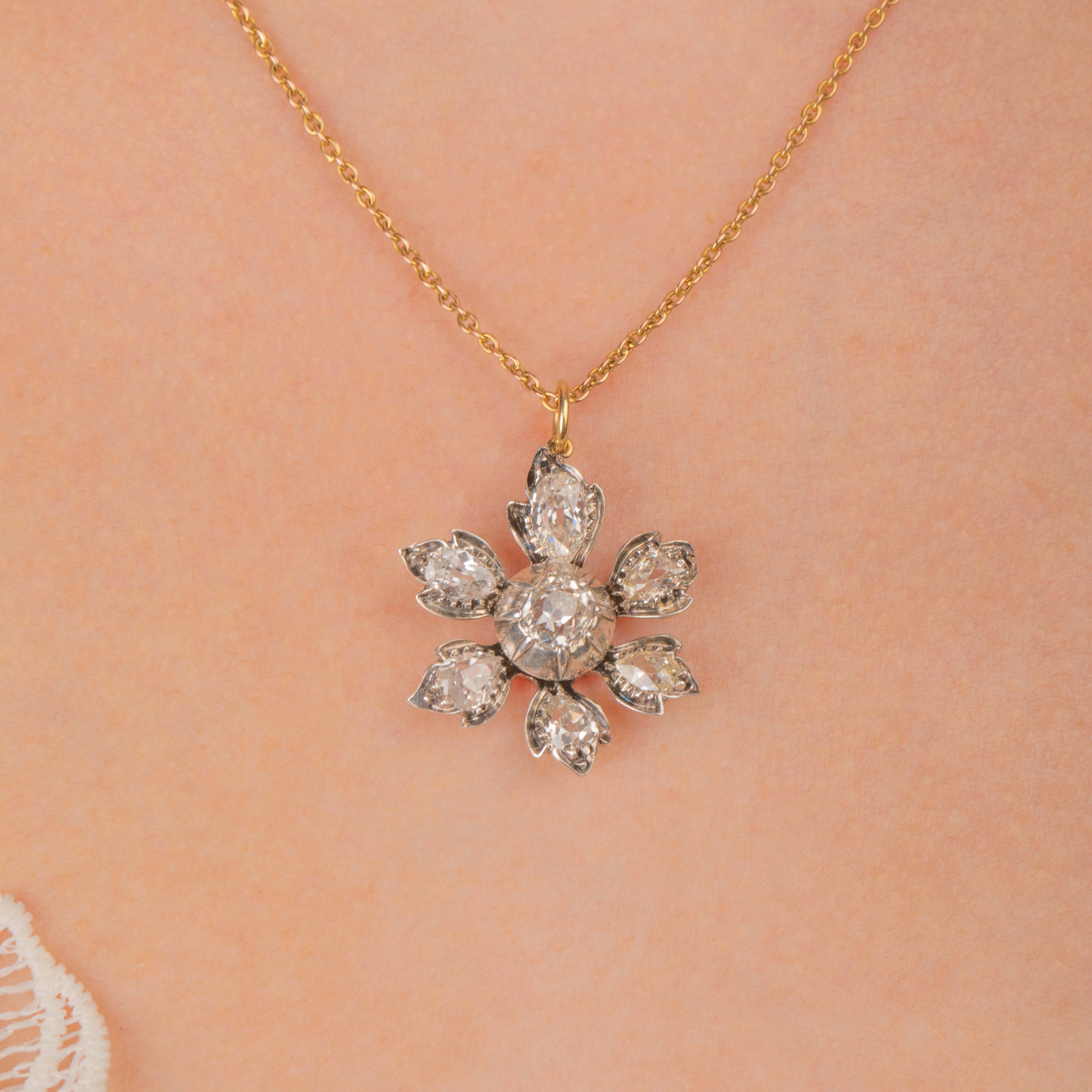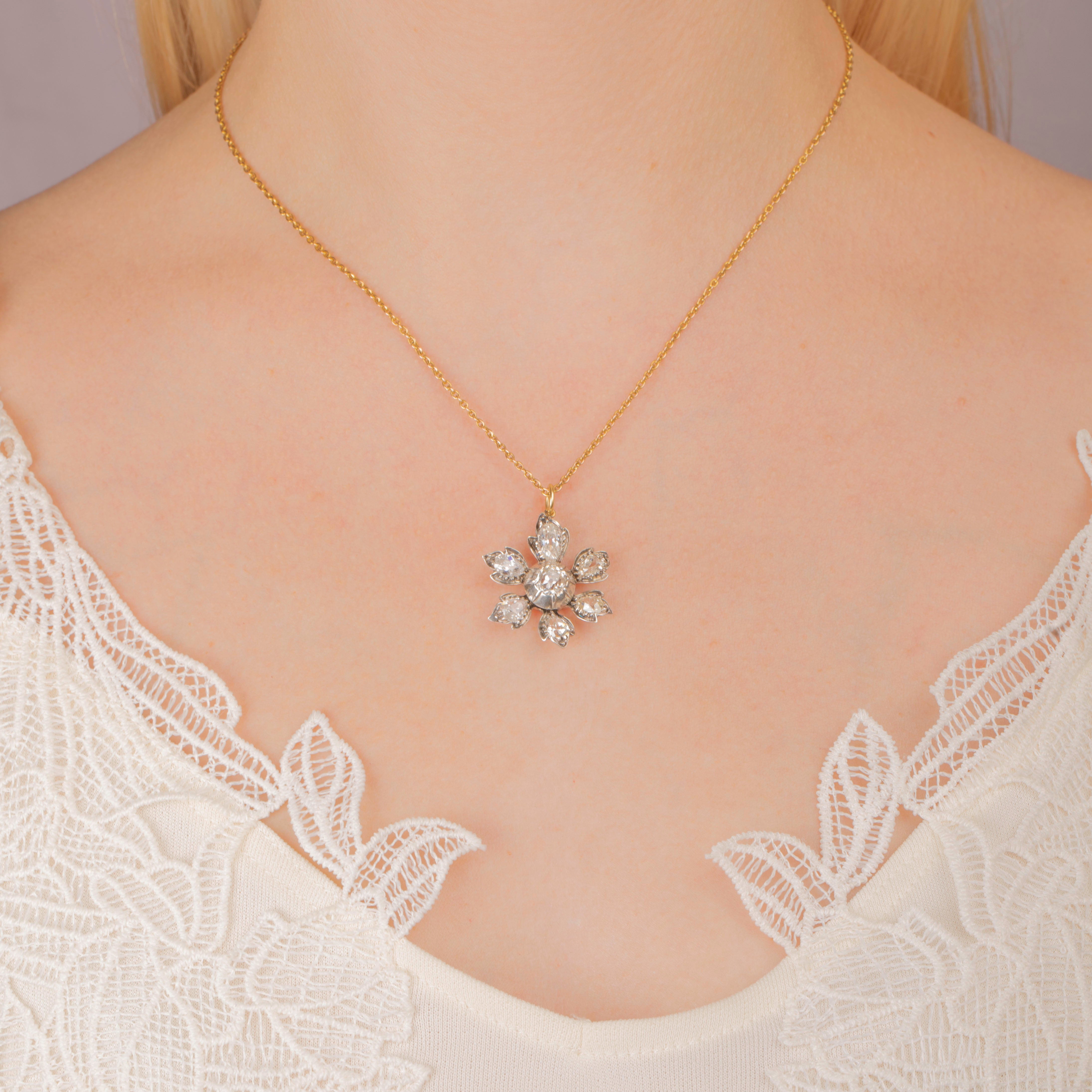Each of her six petals are inlaid with rare antique pear cut Diamonds, giving this antique Diamond pendant a total approximate carat weight of 2.40ct. The unmissable glistens that dance between the hand-cut facets will brighten up the day of anyone lucky enough to lay eyes on her.