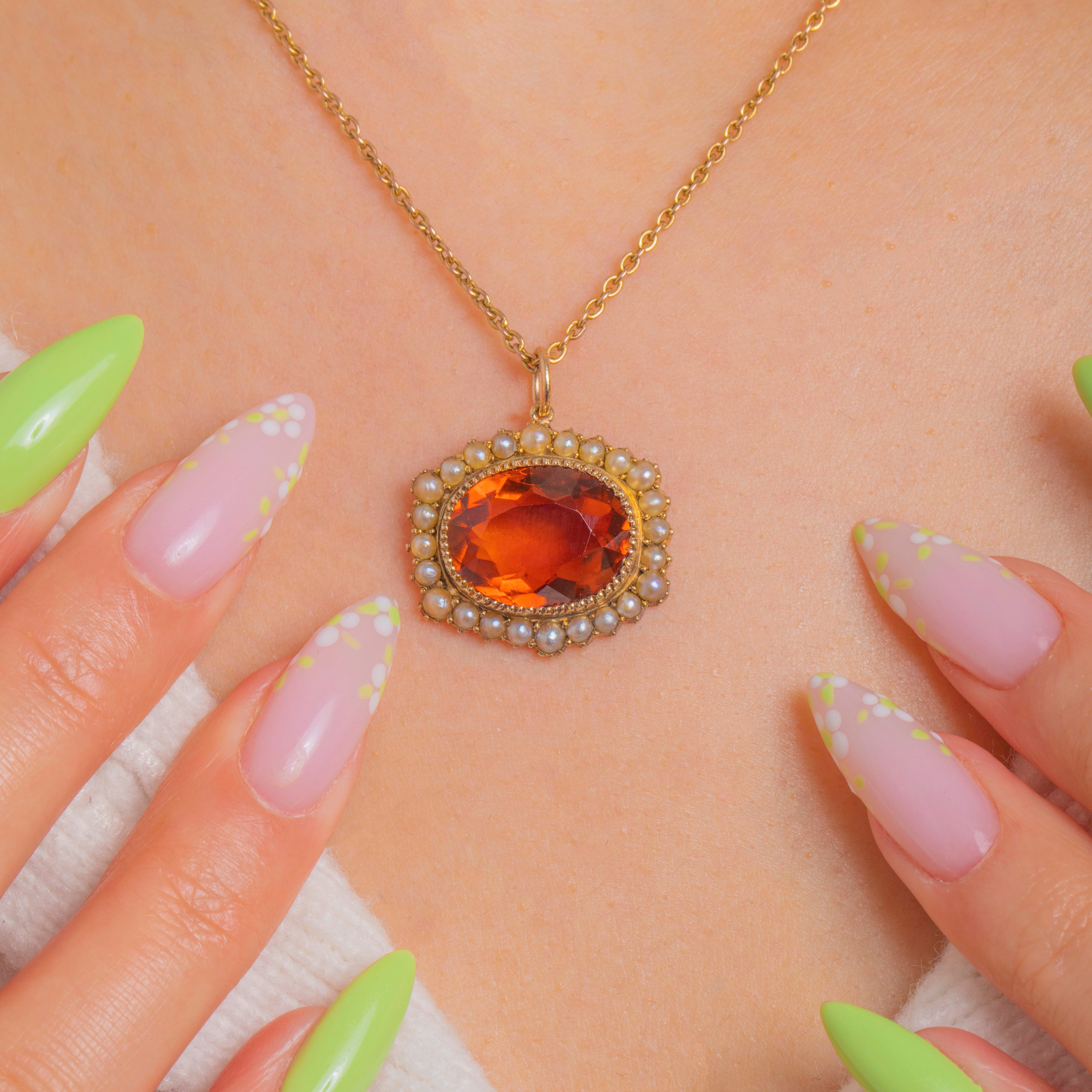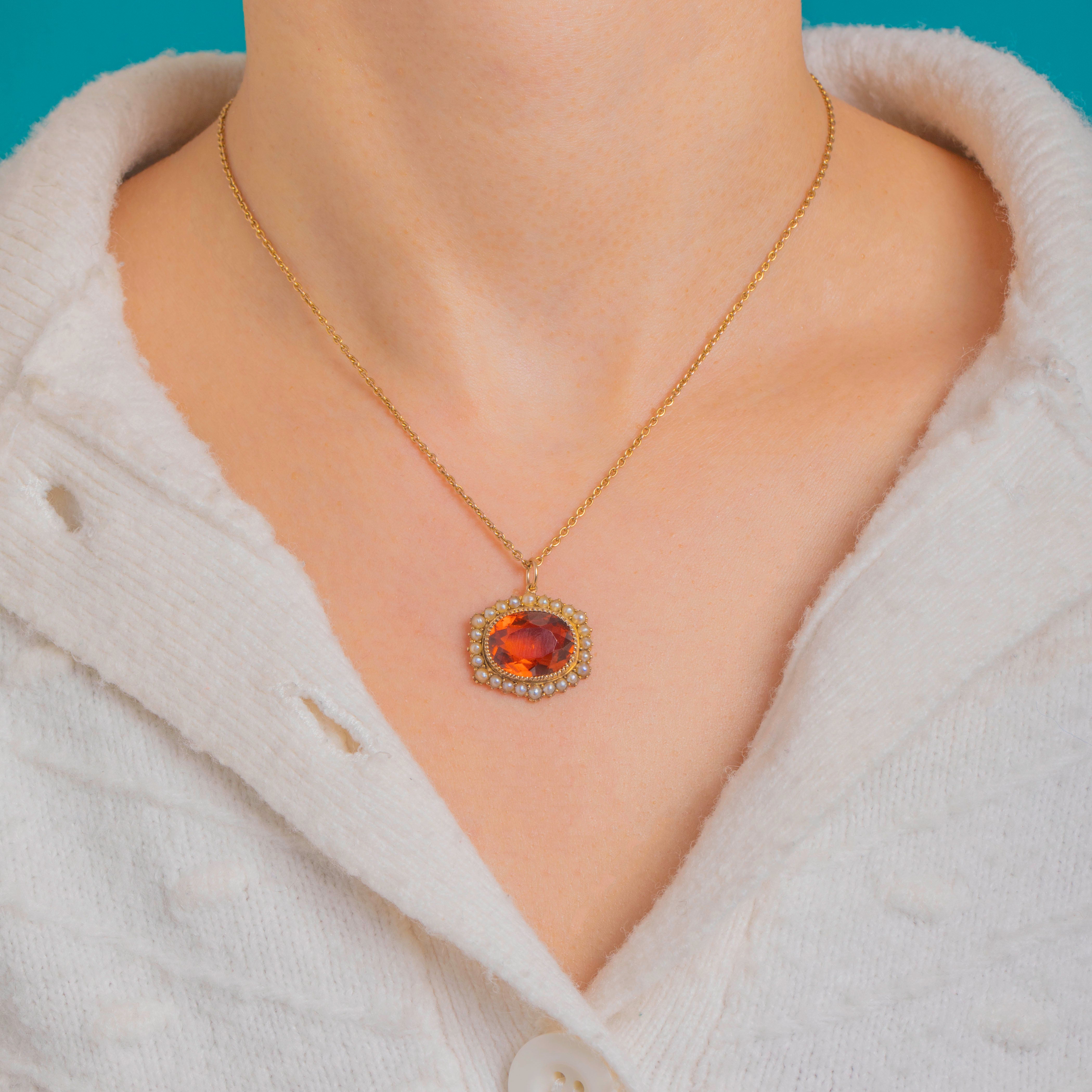 A glowing ode to antique elegance, this Edwardian pendant showcases a sumptuous Madeira Citrine framed by a halo of creamy Seed Pearls. The oval Citrine flashes rich ember-orange and golden tones, its warmth heightened by a refined 15ct Gold setting with delicate beaded detailing. Each petite Pearl is neatly cupped to create a soft, romantic outline around the vibrant centre.