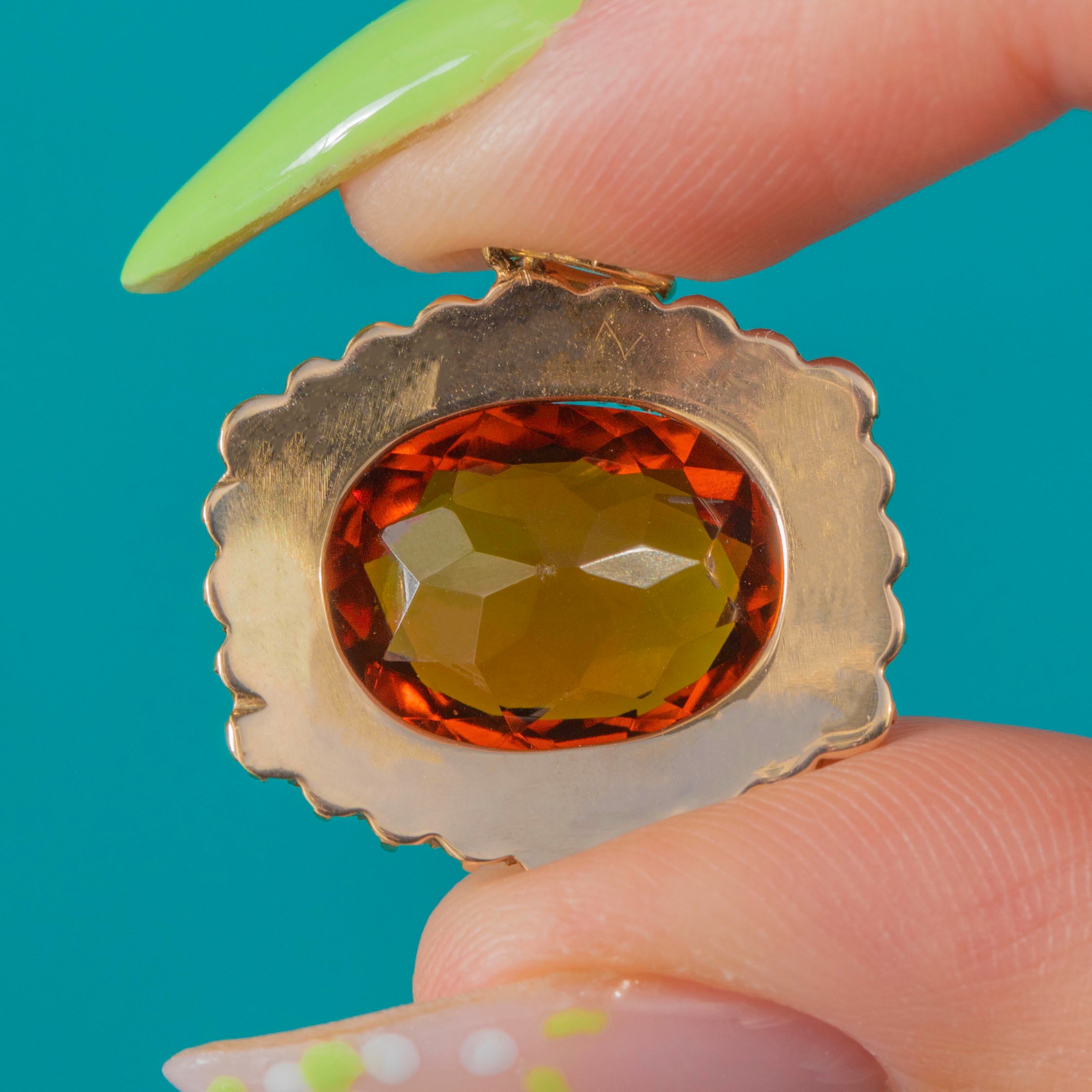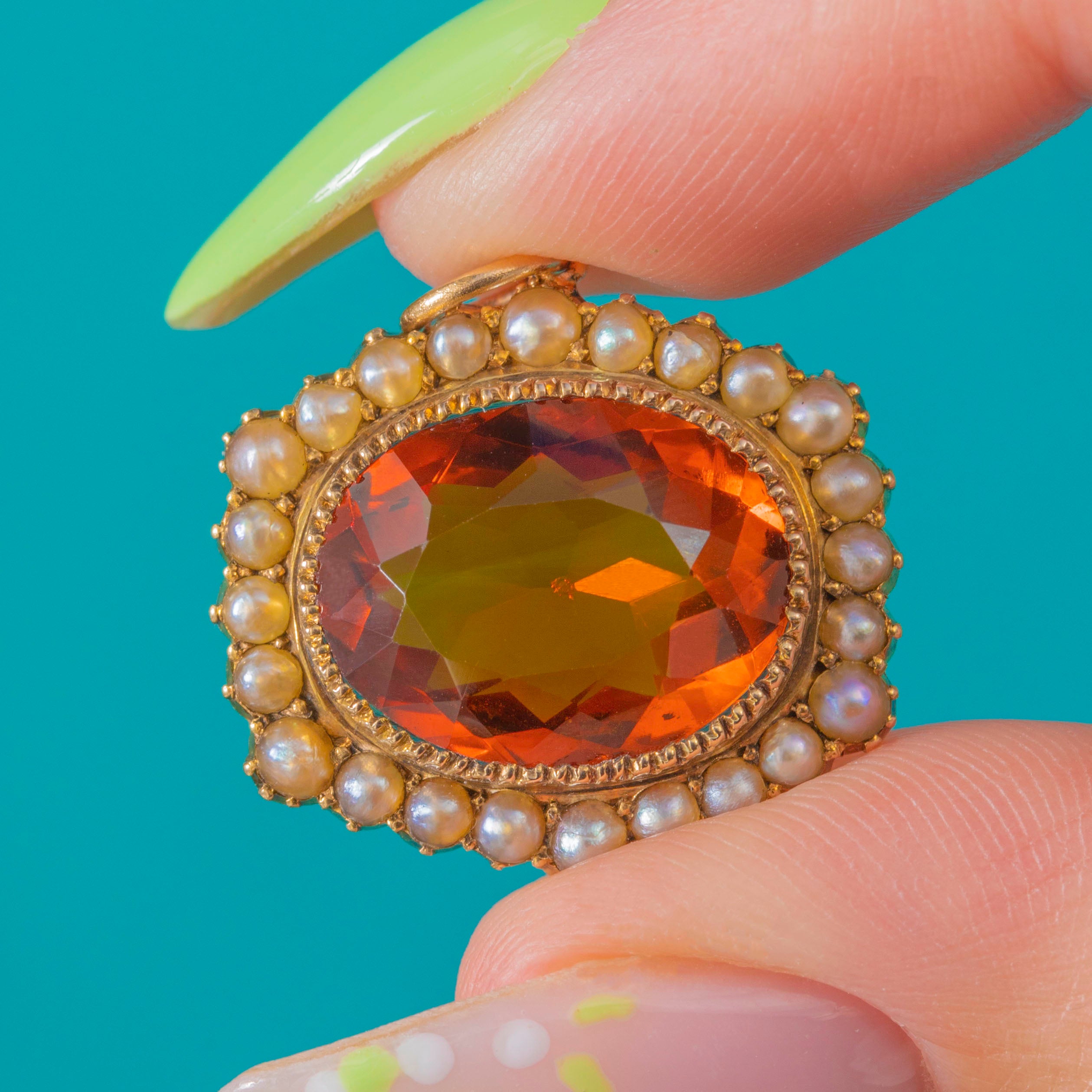 MATERIALS: Tests as 15ct Gold, 9ct Gold jump ring, Madeira Citrine (4.65ct), Seed Pearl.