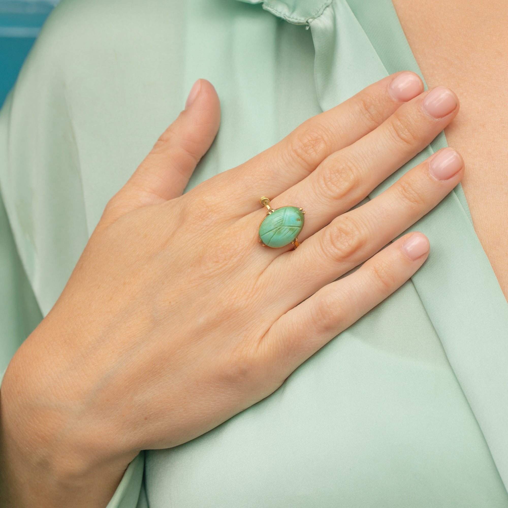 This antique Egyptian Revival Scarab Faience ring is a captivating artifact from the Art Deco era, reflecting the period's fascination with ancient Egyptian motifs. This exquisite piece features a finely crafted faience scarab, a symbol of rebirth and protection, set in solid 18ct Gold.