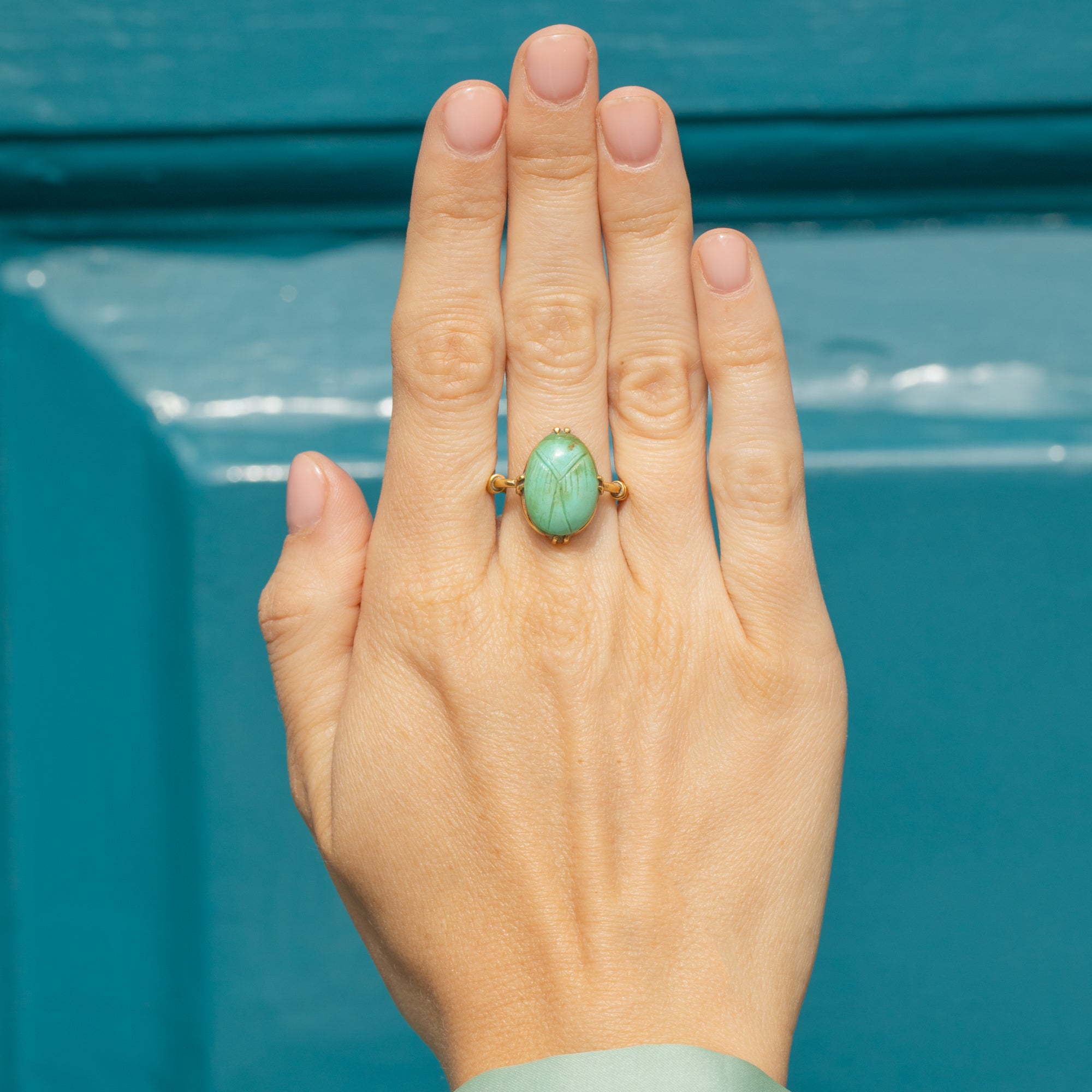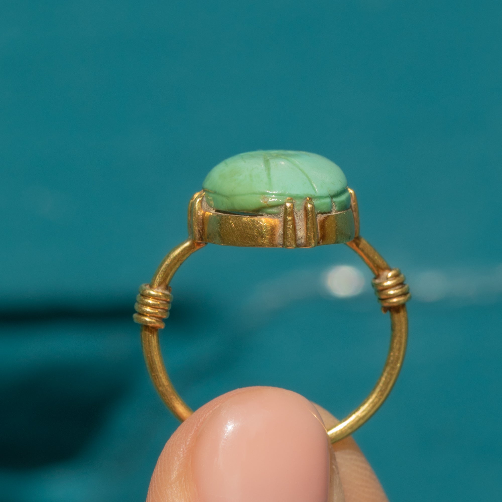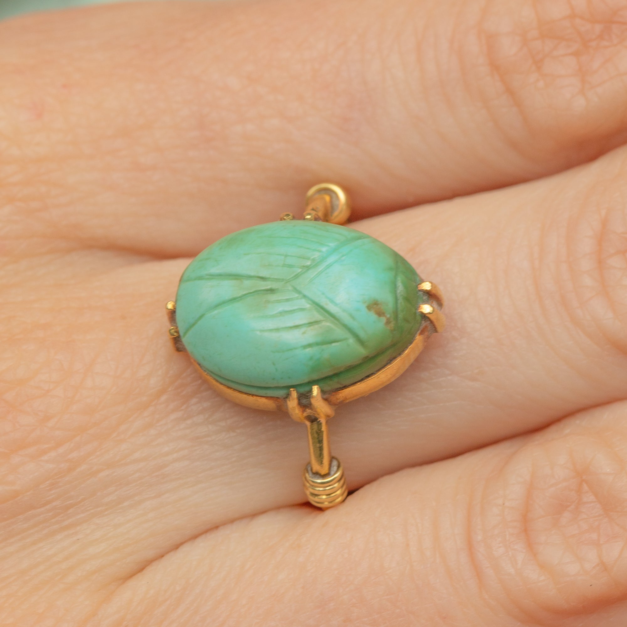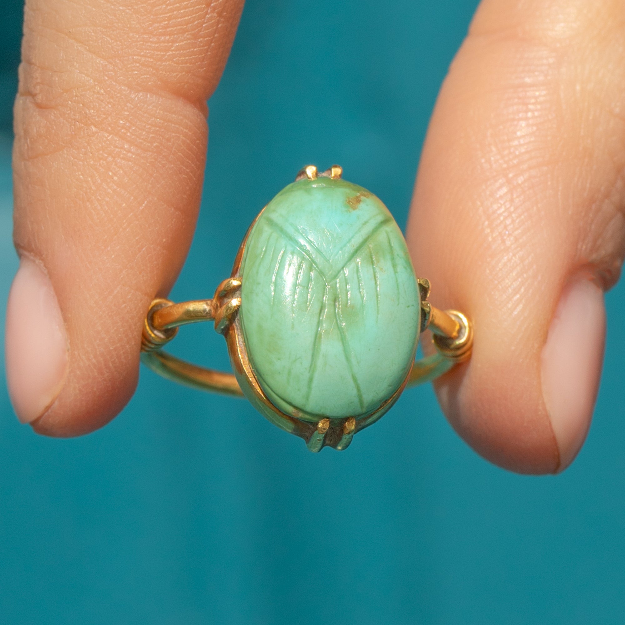 EXCELLENT. This antique Egyptian Revival Scarab Faience ring is in excellent condition! The faience scarab remains vibrant and intact, with no visible cracks or chips, preserving its turquoise hue and intricate engravings. The 18ct Gold band and setting are remarkably well-preserved with a bright yellow tone of Gold free from significant scratches or signs of wear.