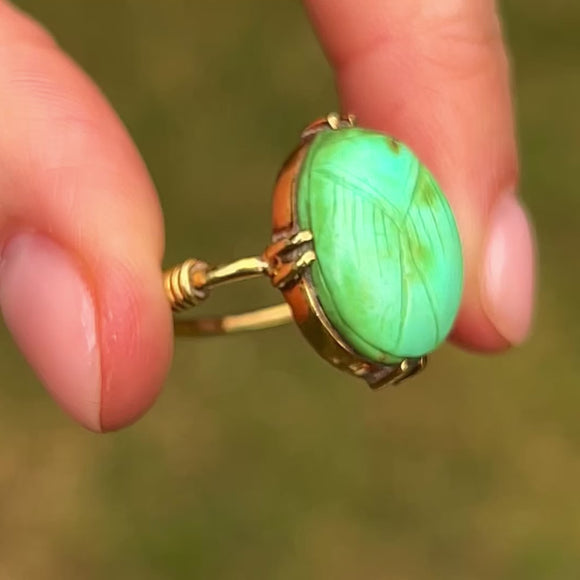 Showcasing a deep blue Scarab with intricate engravings on its underside, this Art Deco ring offers a glimpse into the sacred symbolism of ancient Egypt. The ring's historical significance and exquisite craftsmanship make it a treasured piece!