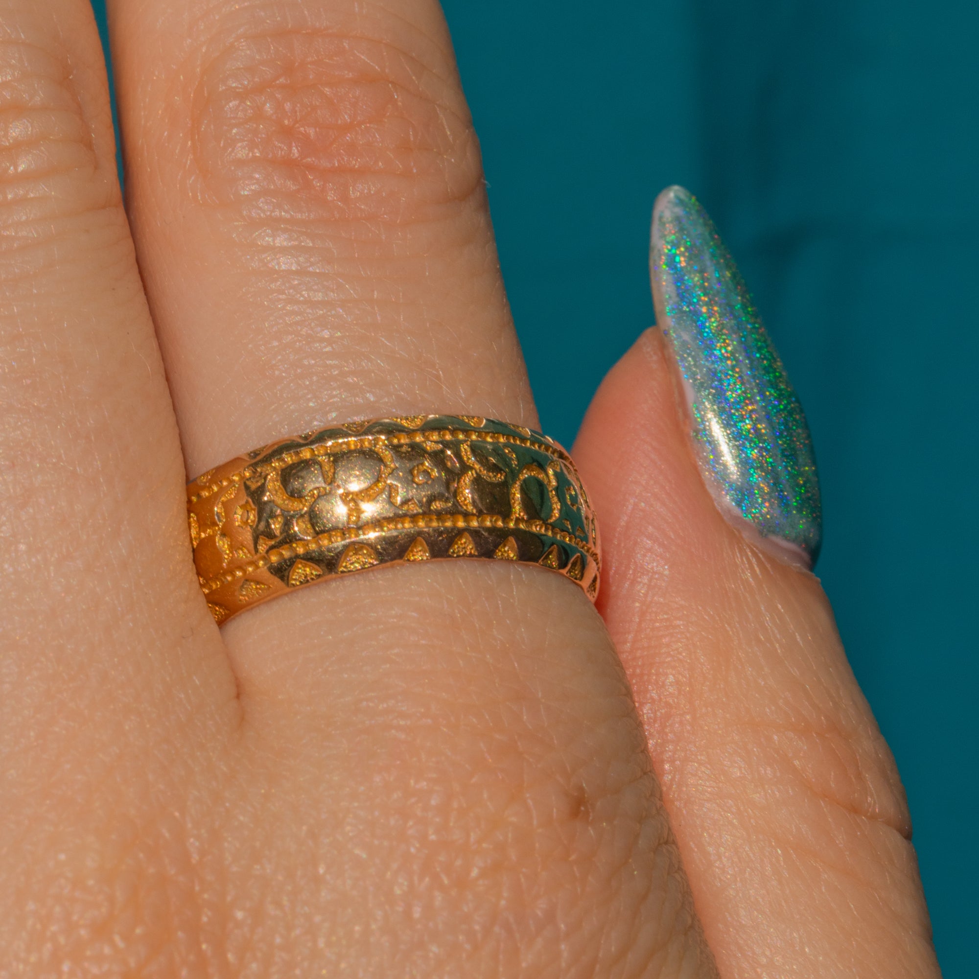 The 7.5mm wide band provides wonderful finger coverage and her low profile makes it perfect for everyday wear. Whether worn as a standalone piece, stacked in amongst your other favourite rings, or accompanying your engagement ring as a unique wedding band, this chunky delight will make a fine addition to your collection!