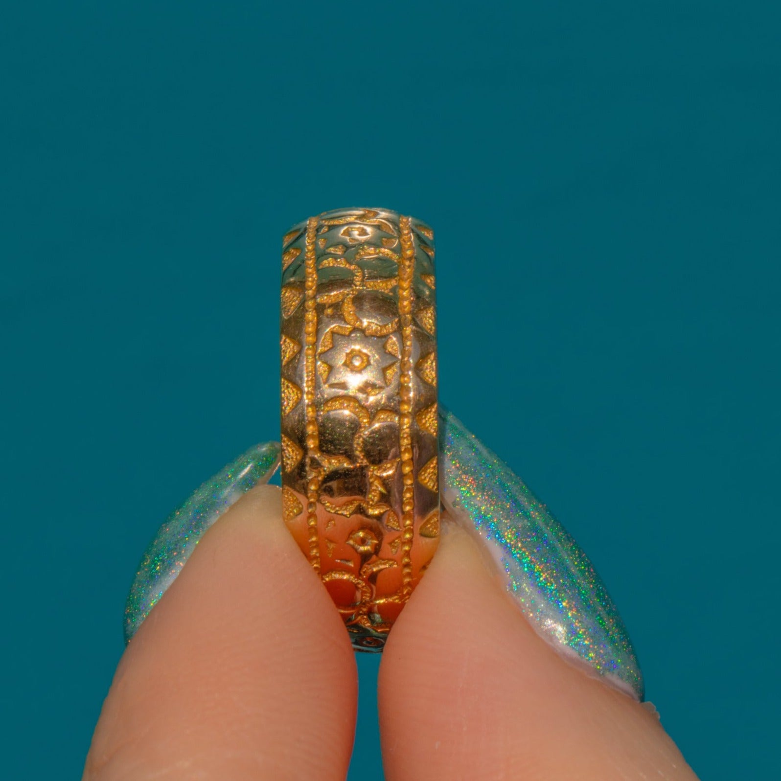 EXCELLENT. This antique floral engraved 18ct Gold band is in excellent condition. The Gold is brightly saturated throughout and the engraved details have remained crisp. There is some minor surface wear on the inside of the band, commensurate with age, but this is to be expected from an authentic piece of Victorian jewellery and the hallmarks have remained lovely and clear.
