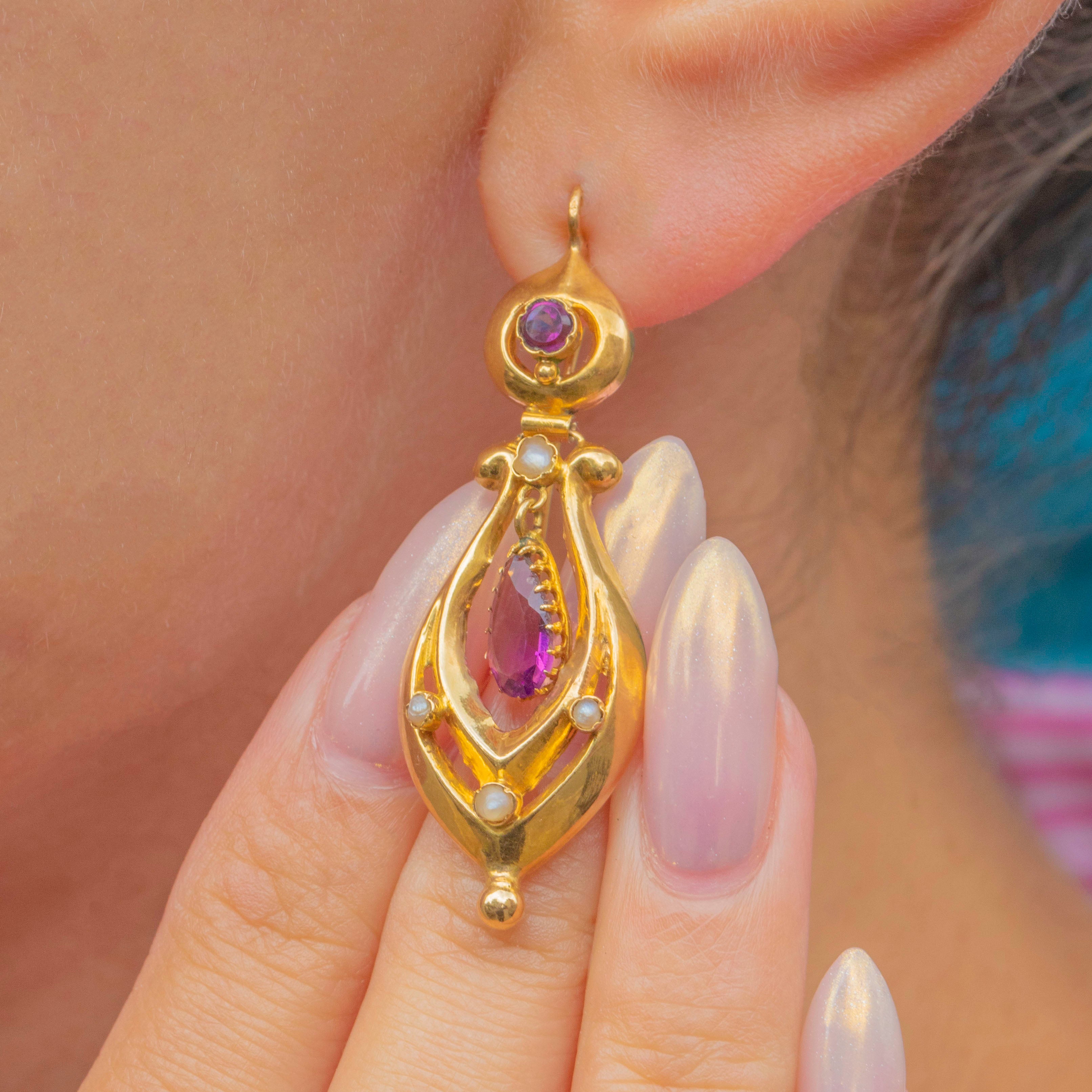 Antique French 18ct Gold Amethyst Pearl Drop Earrings, c.1890