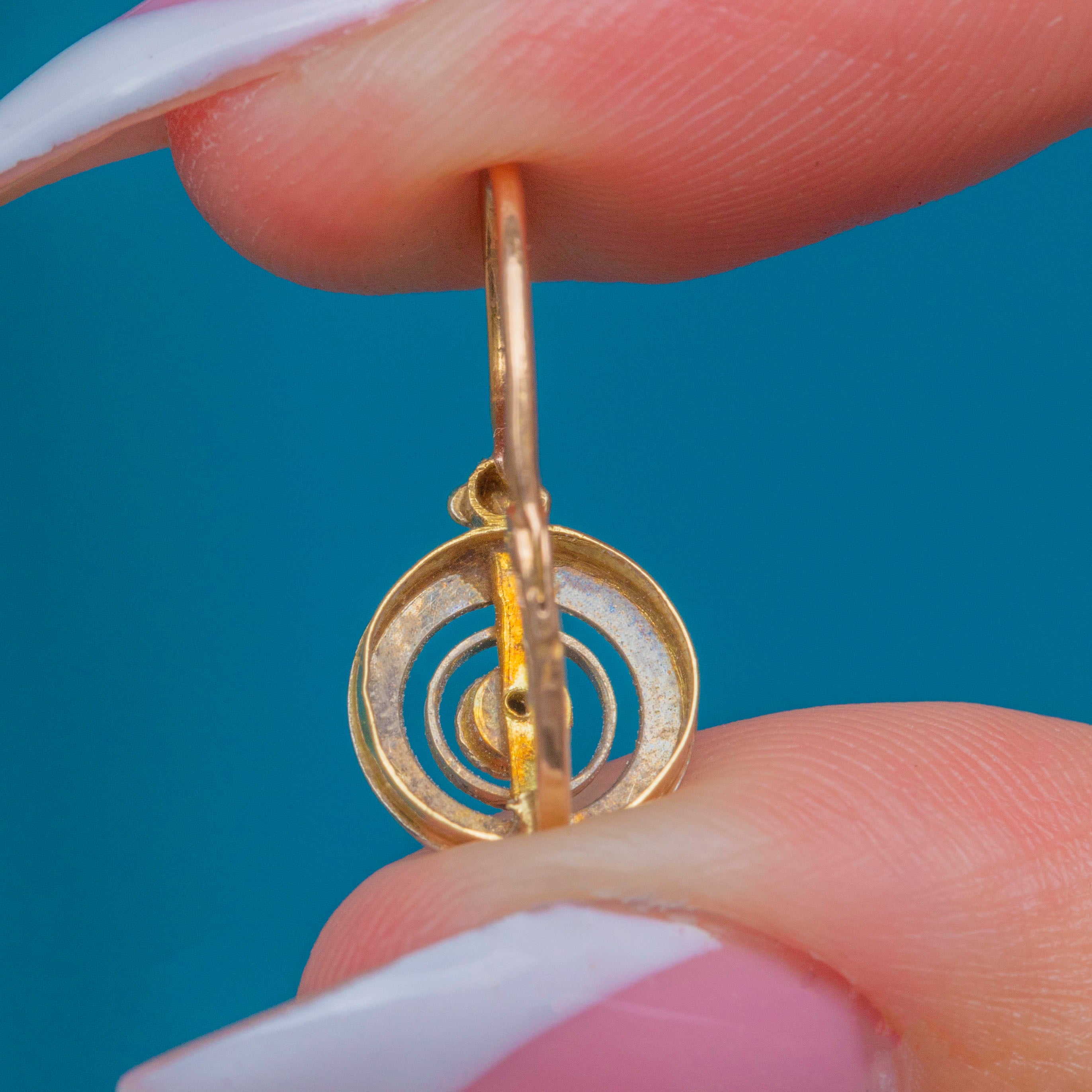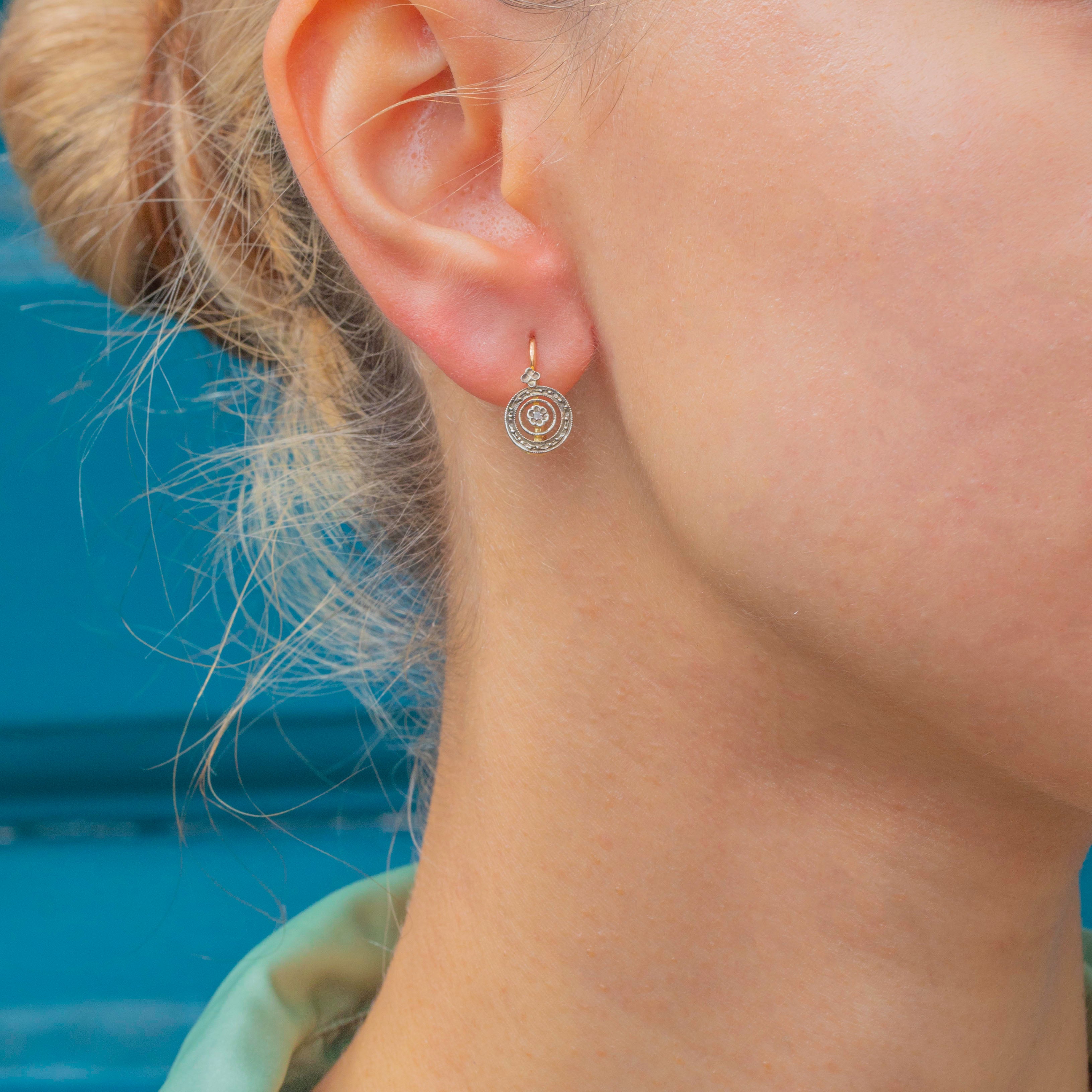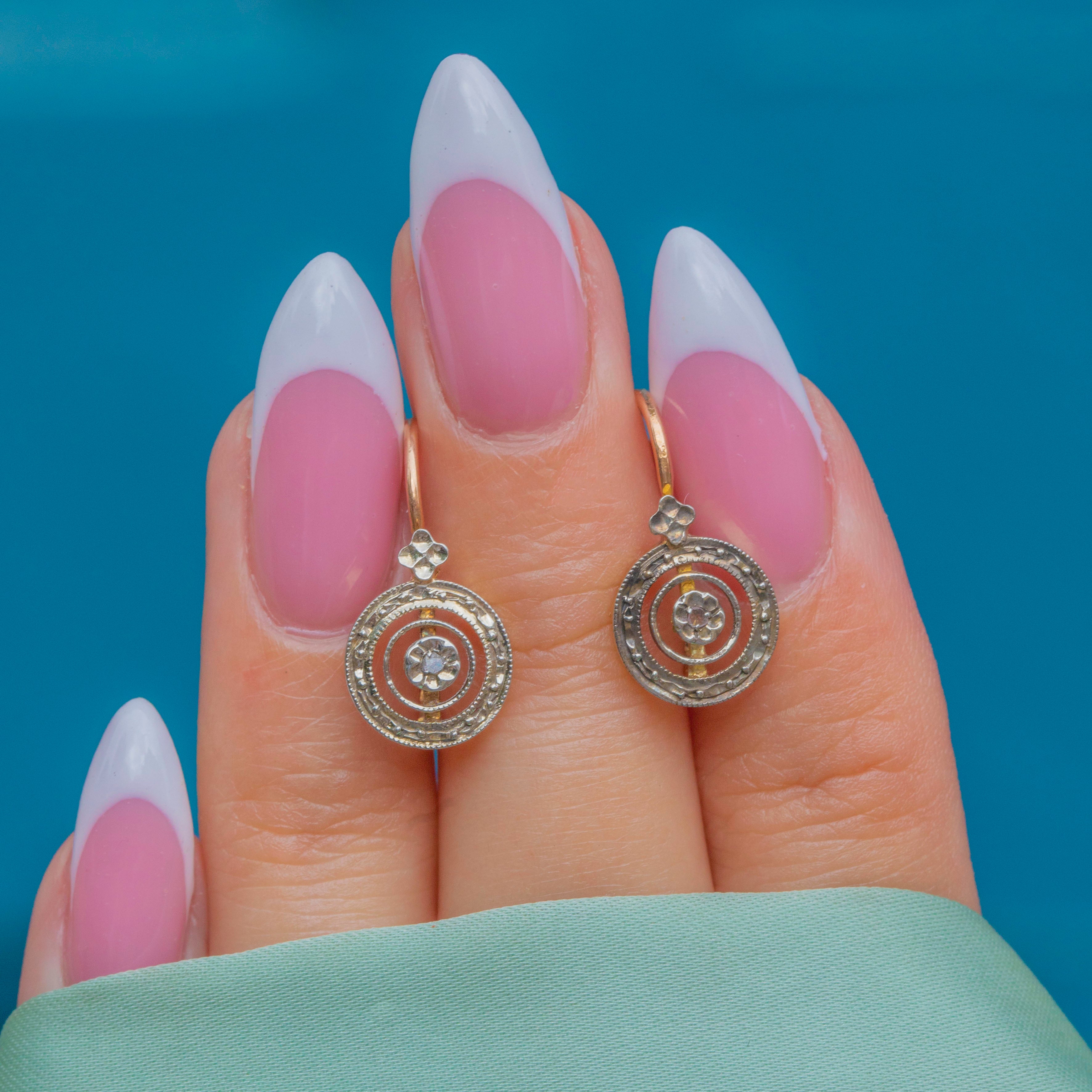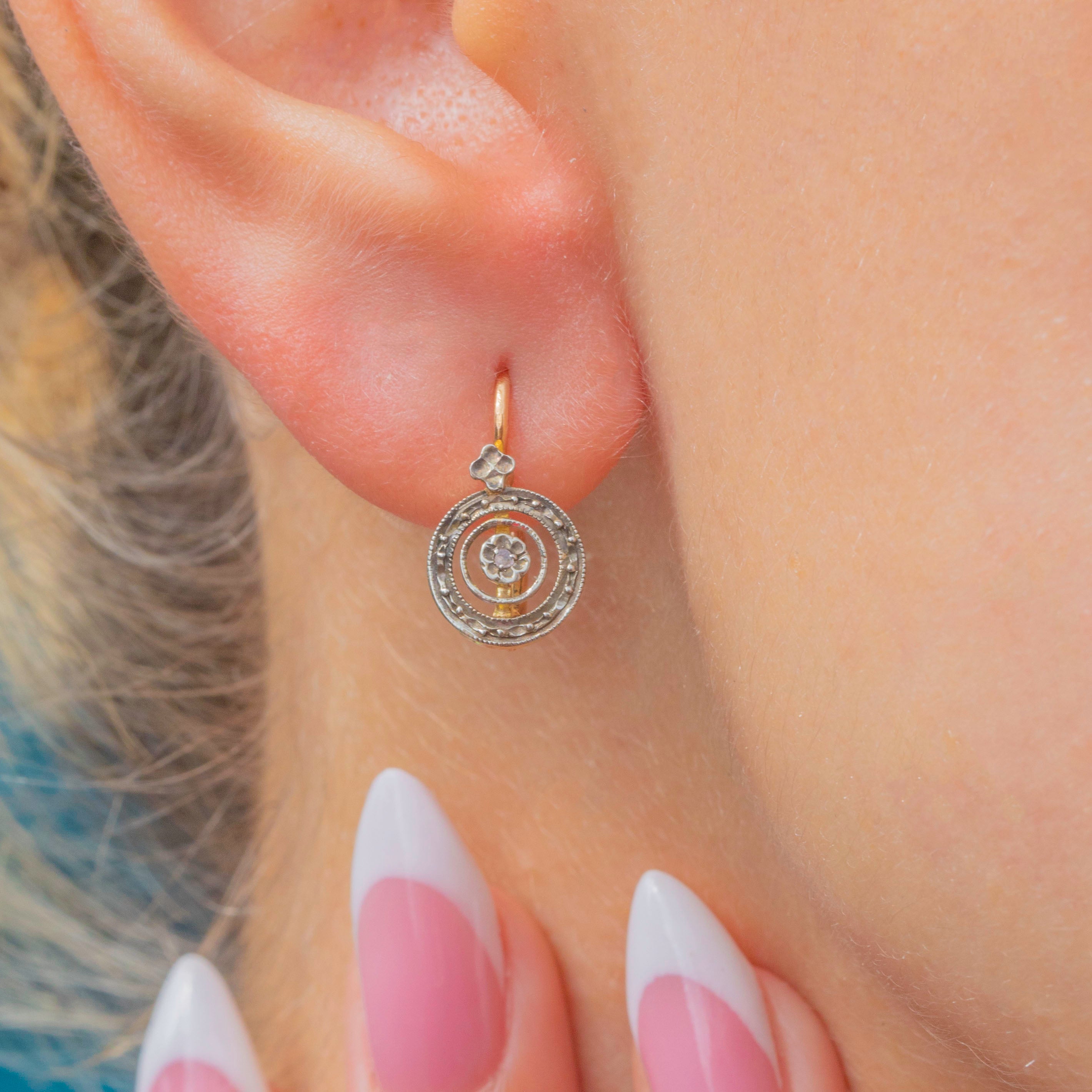 These French Edwardian 'sleeper style' Dormeuse earrings are formed from blush toned 18ct Gold, crafted into an elegant roundel design accented by dainty 18ct White Gold floral motifs.
