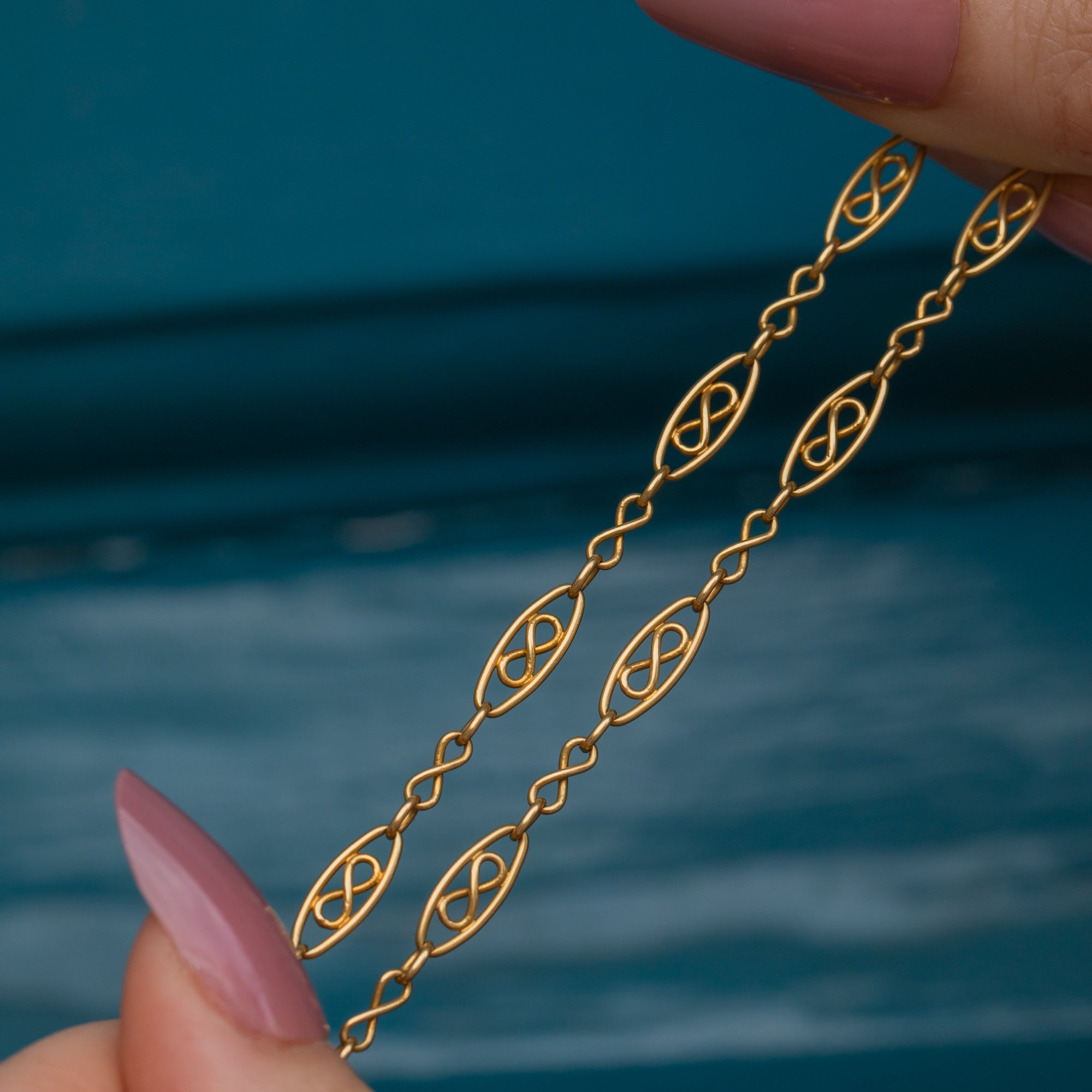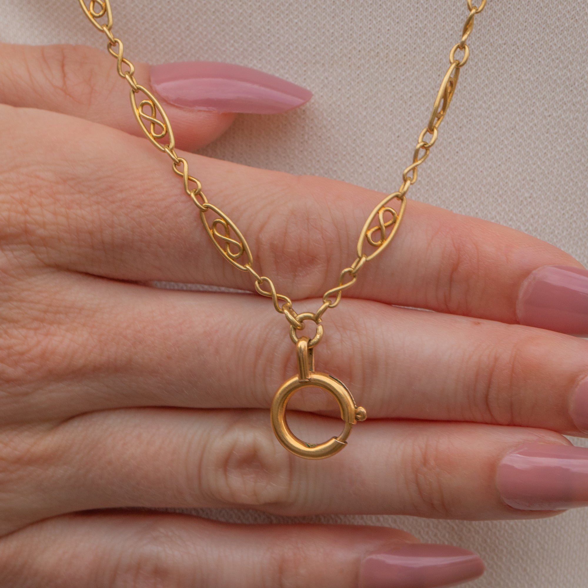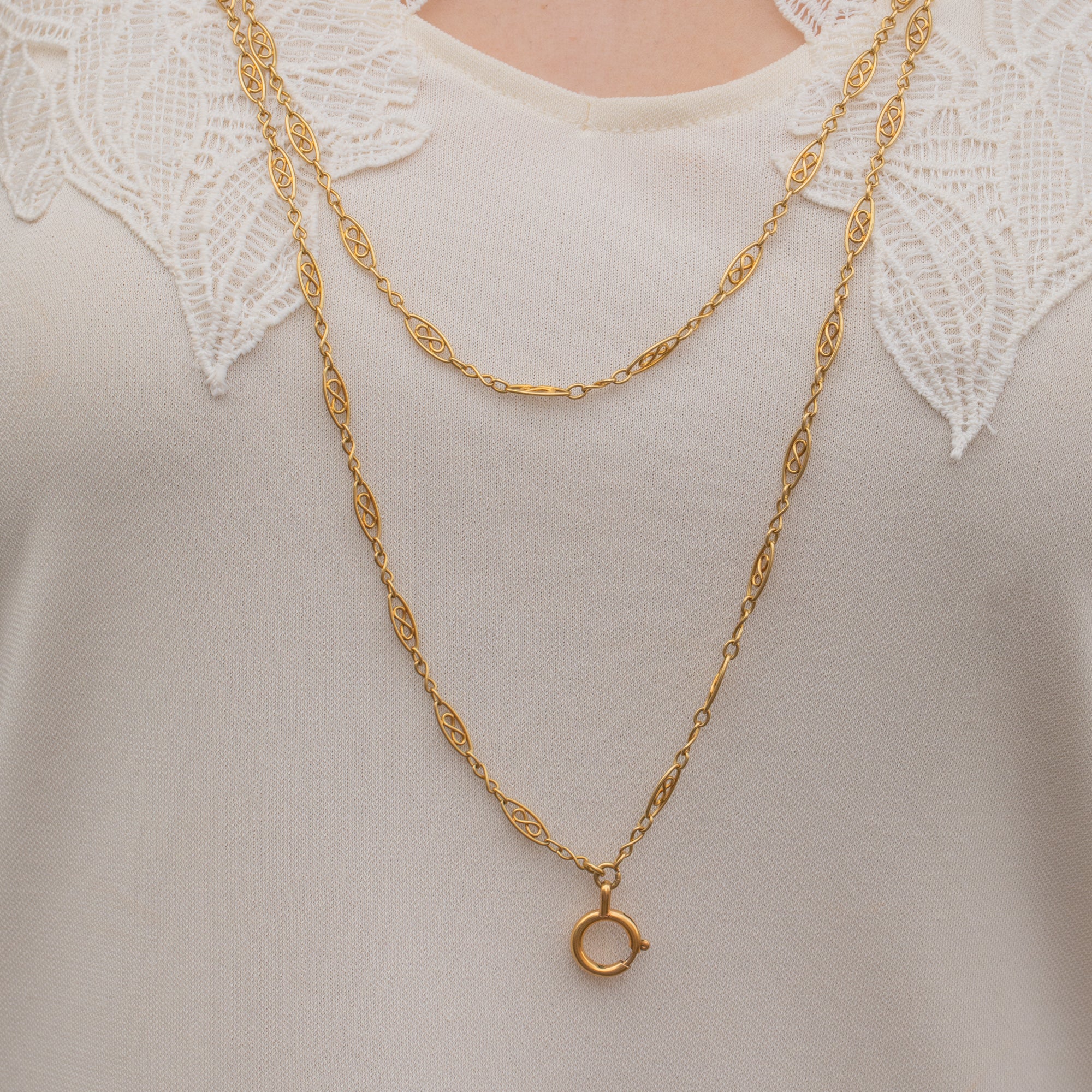 At 62 inches long, versatility is at the heart of this Victorian Gold necklace. Whether layered as a necklace stack, as a single loop, or using her large over-sized (and fully French stamped!) antique bolt-ring to suspend your favourite charm from, her beauty is timeless.