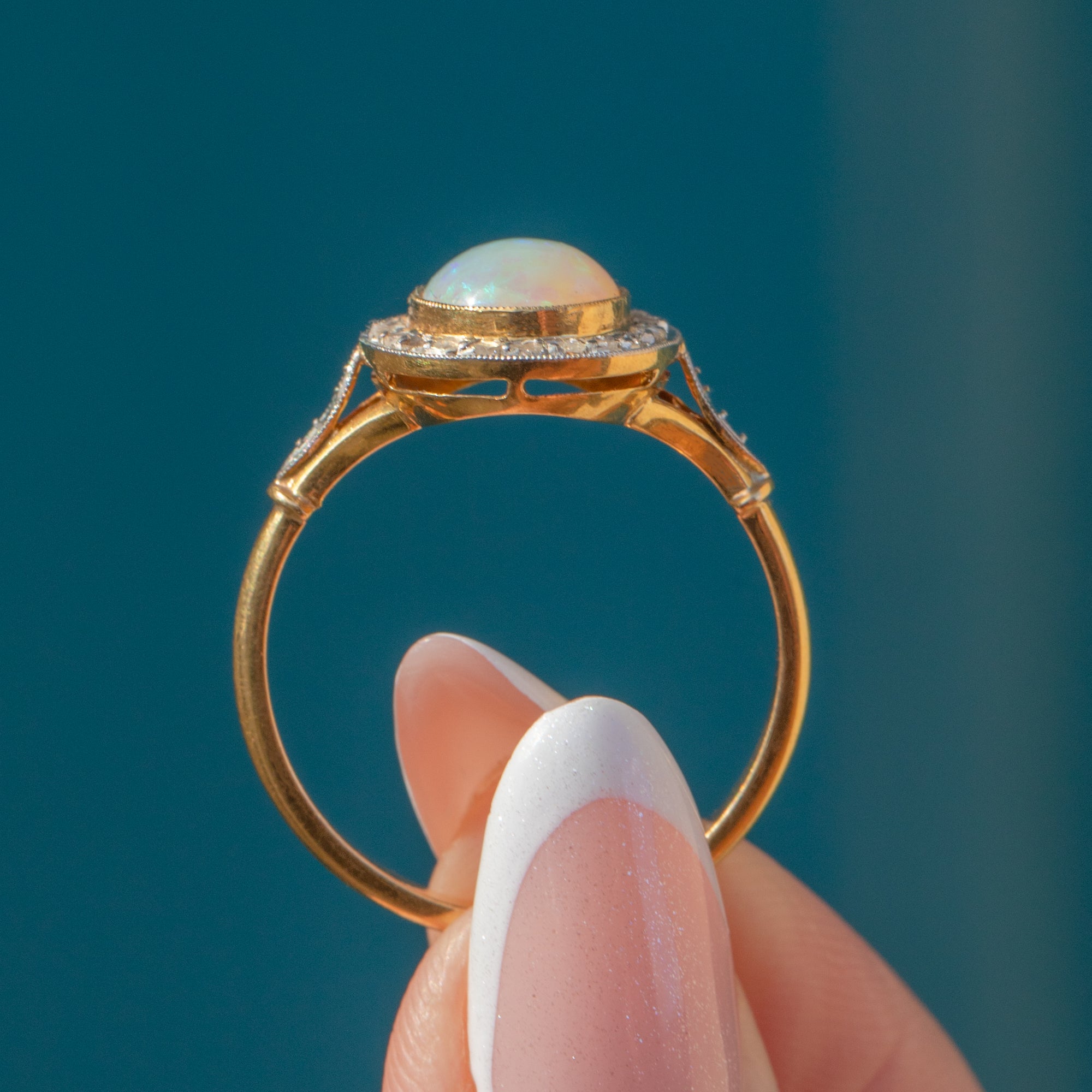 In her centre sits an iridescent soft blue Opal, catching the light to reveal striking flashes of greens and orange. Her natural solid 0.80ct Opal is circled by a halo of scintillating Diamonds, arranged in a cluster formation, providing a gorgeous twinkle from every angle.