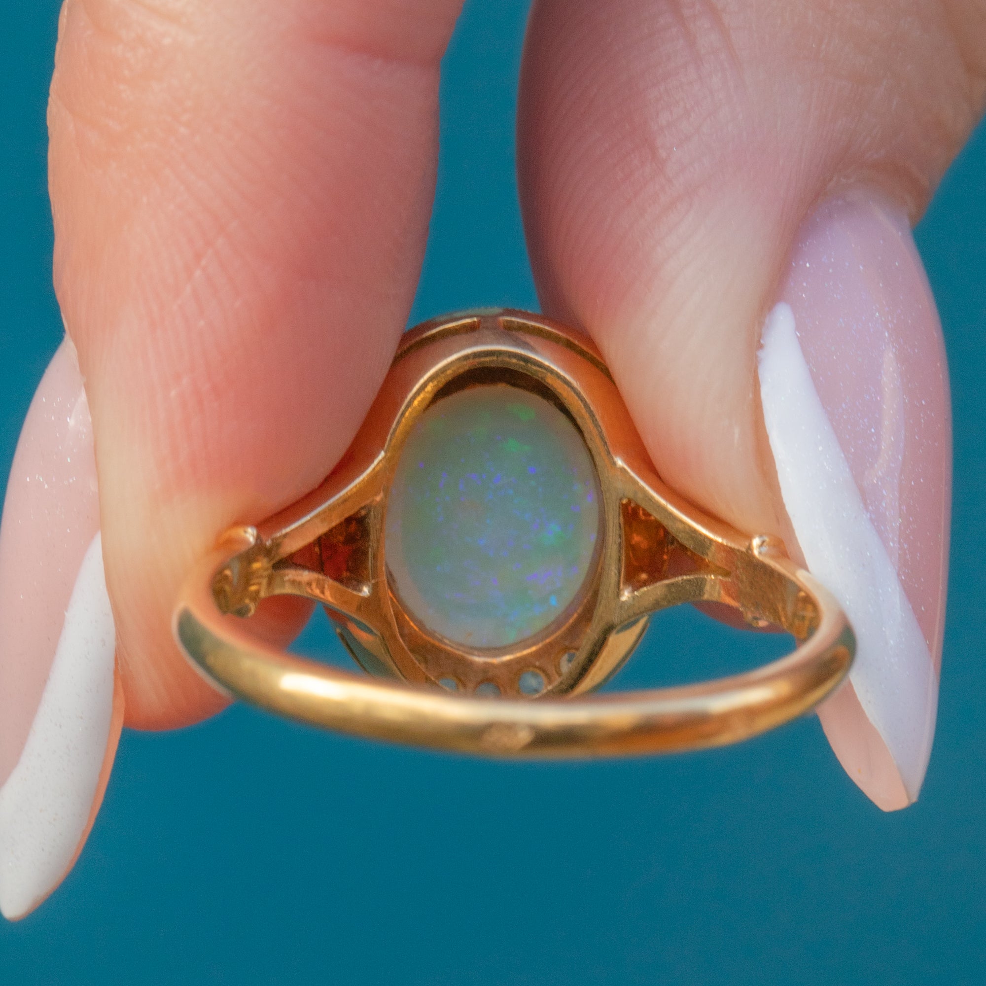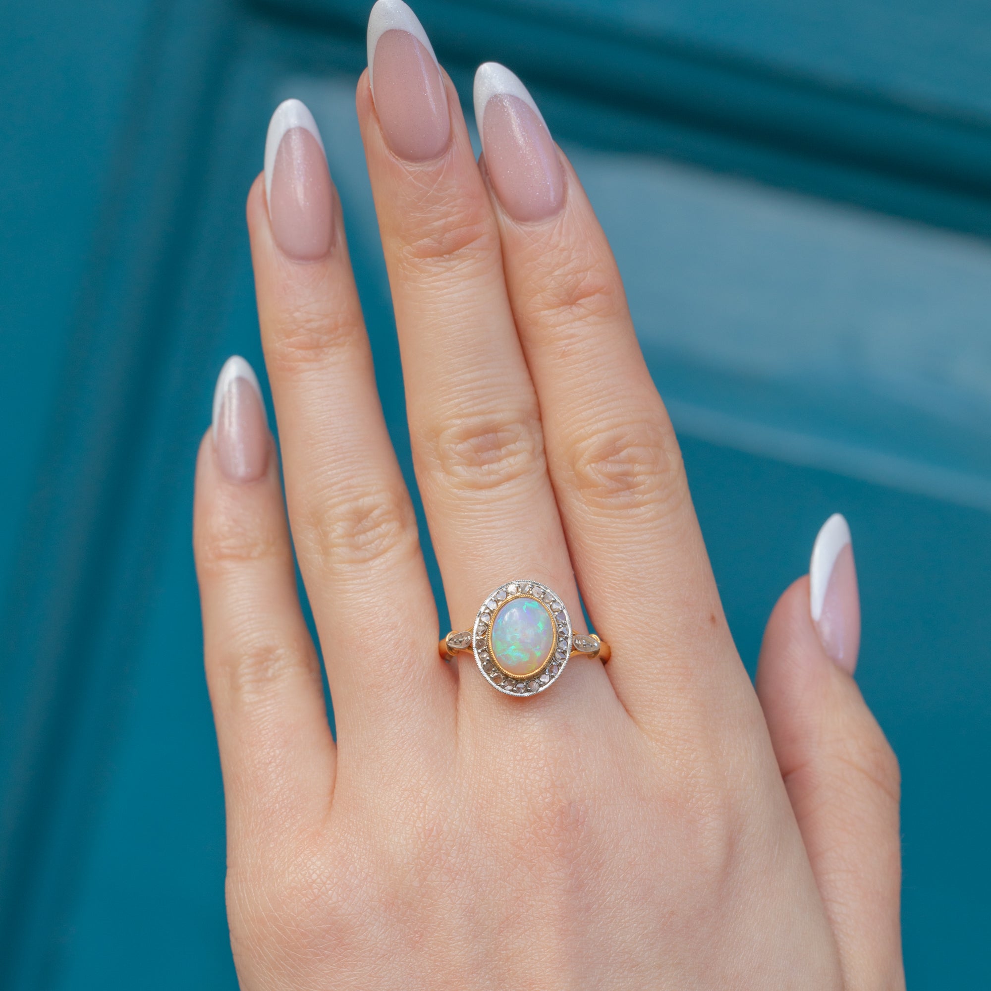 Antique French 18ct Gold Opal Diamond Cluster Ring, 0.80ct Opal
