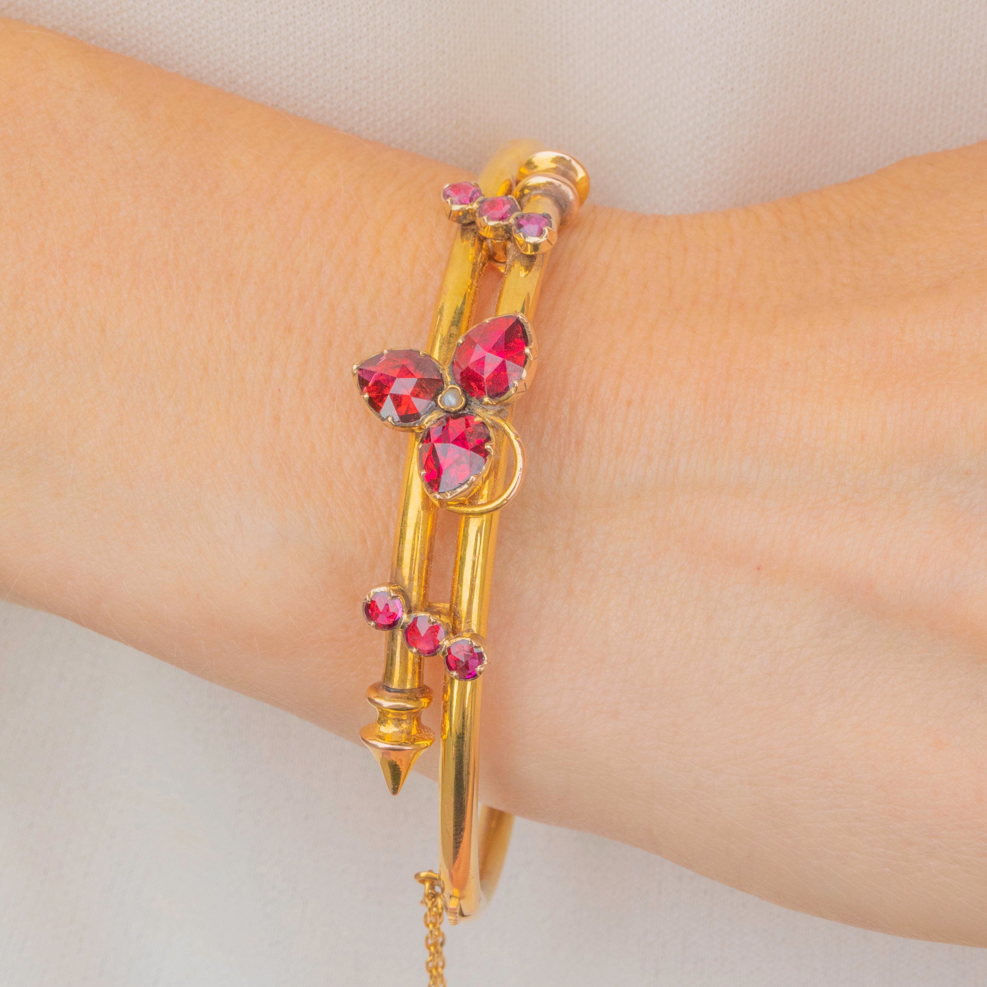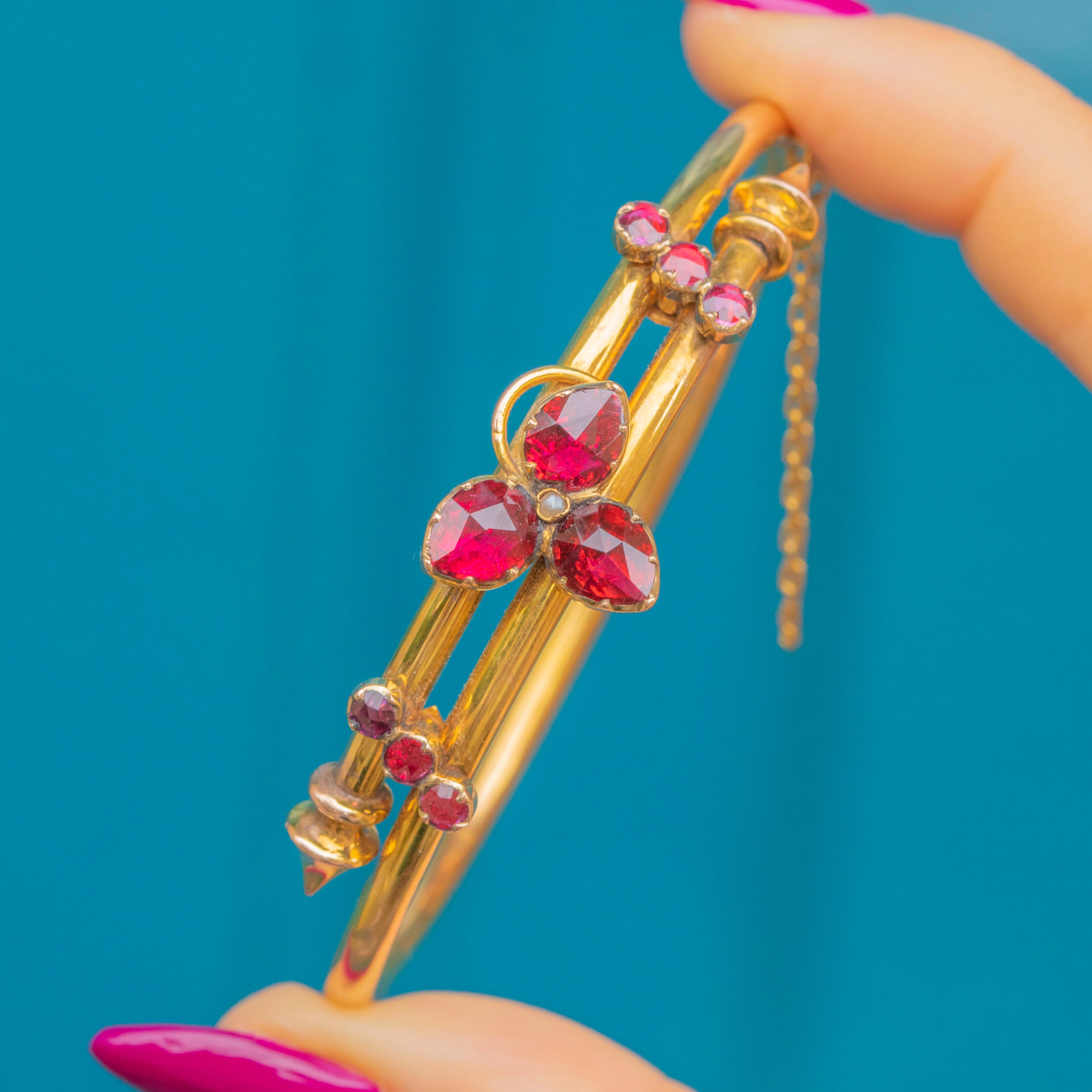 This resplendent 18ct Victorian French bangle flaunts 3.65ct of radiant Perpignan Garnets, each boasting a juicy sangria hue from their crisp facets.