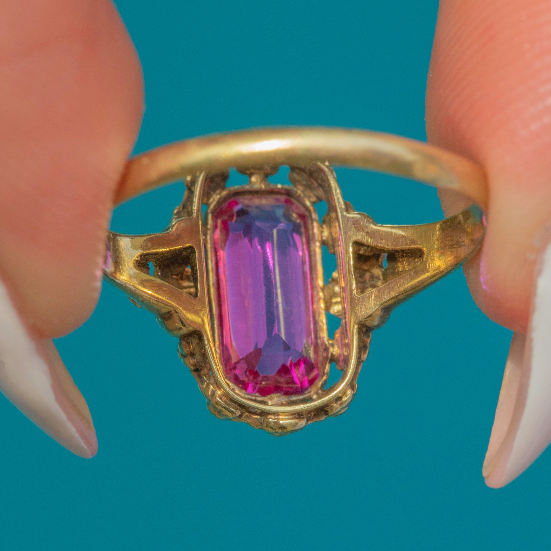 This charming antique ring features a vibrant pink paste gemstone in a sleek rectangular cut, measuring approximately 10 x 5mm. Its rich colour and crisp facets give it a lively sparkle, perfectly framed by a decorative 18ct Gold setting with delicate floral and foliate detailing.