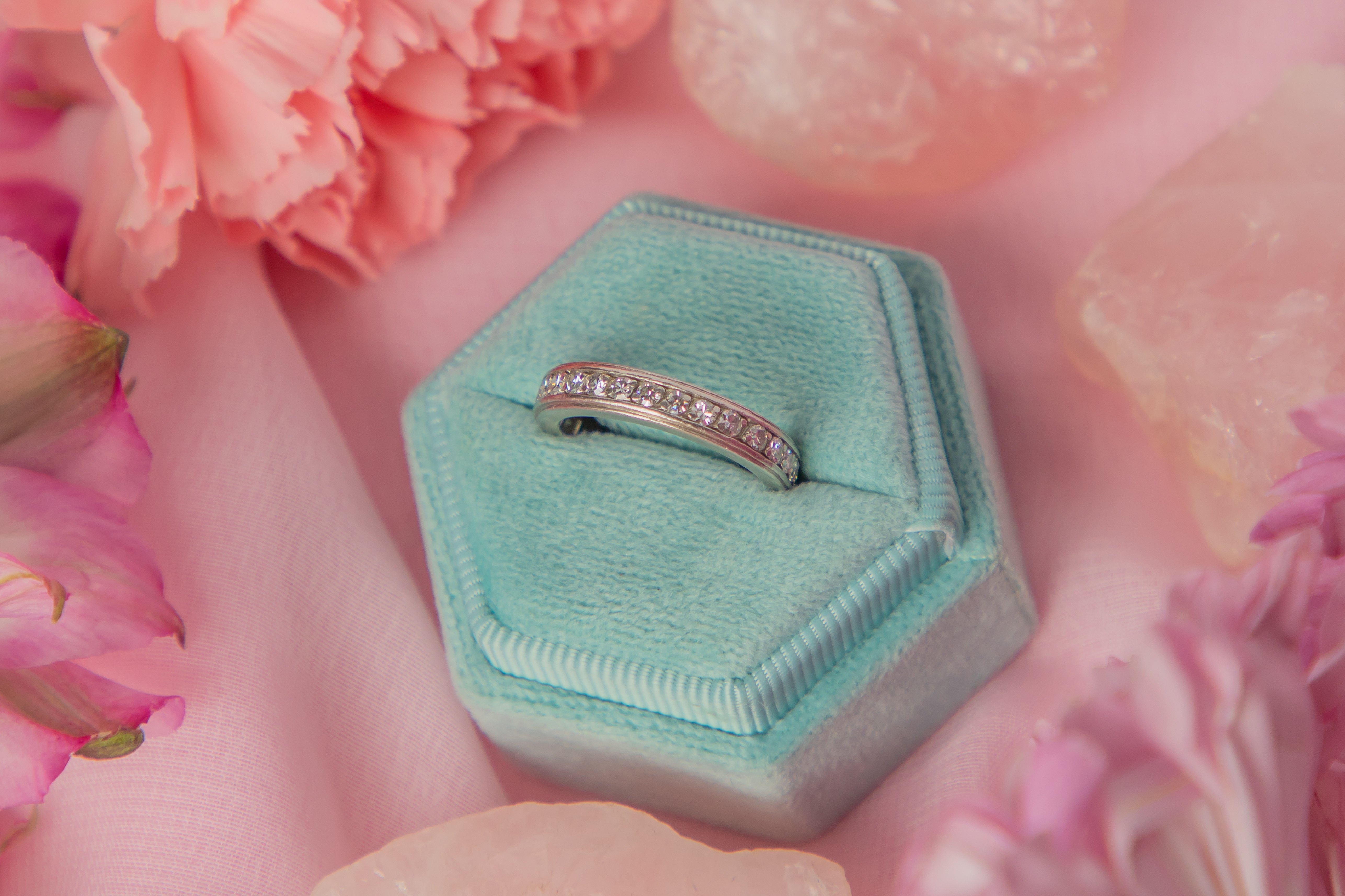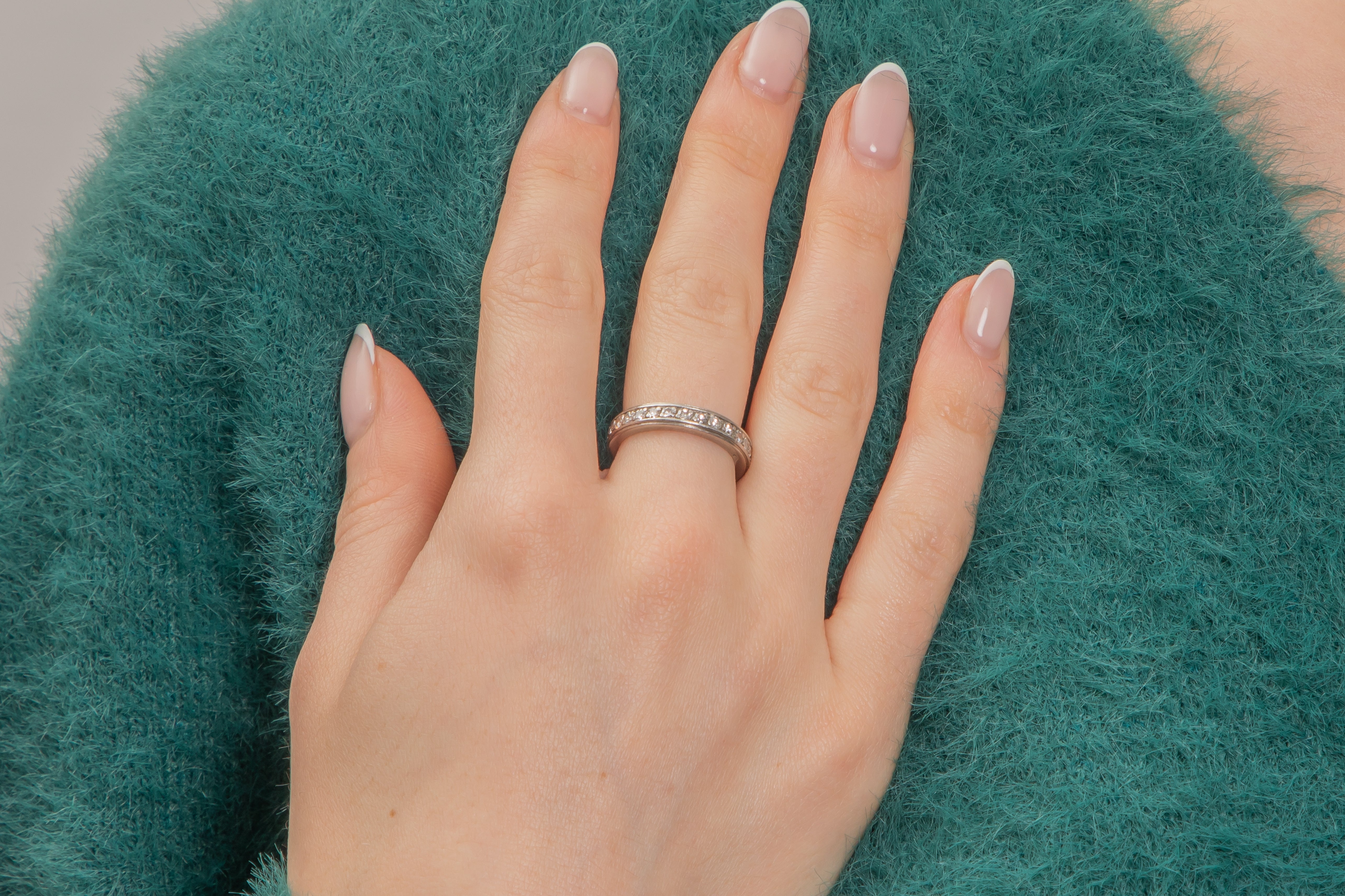 This antique French Platinum Diamond eternity ring is undeniably beautiful! With every inch of her opulent Platinum band adorned with scintillating Diamonds, once on you'll never want to take her off. A beauty from across the waters, her band is stamped with the most desirable French dog heads hallmark, which was used since 1912.