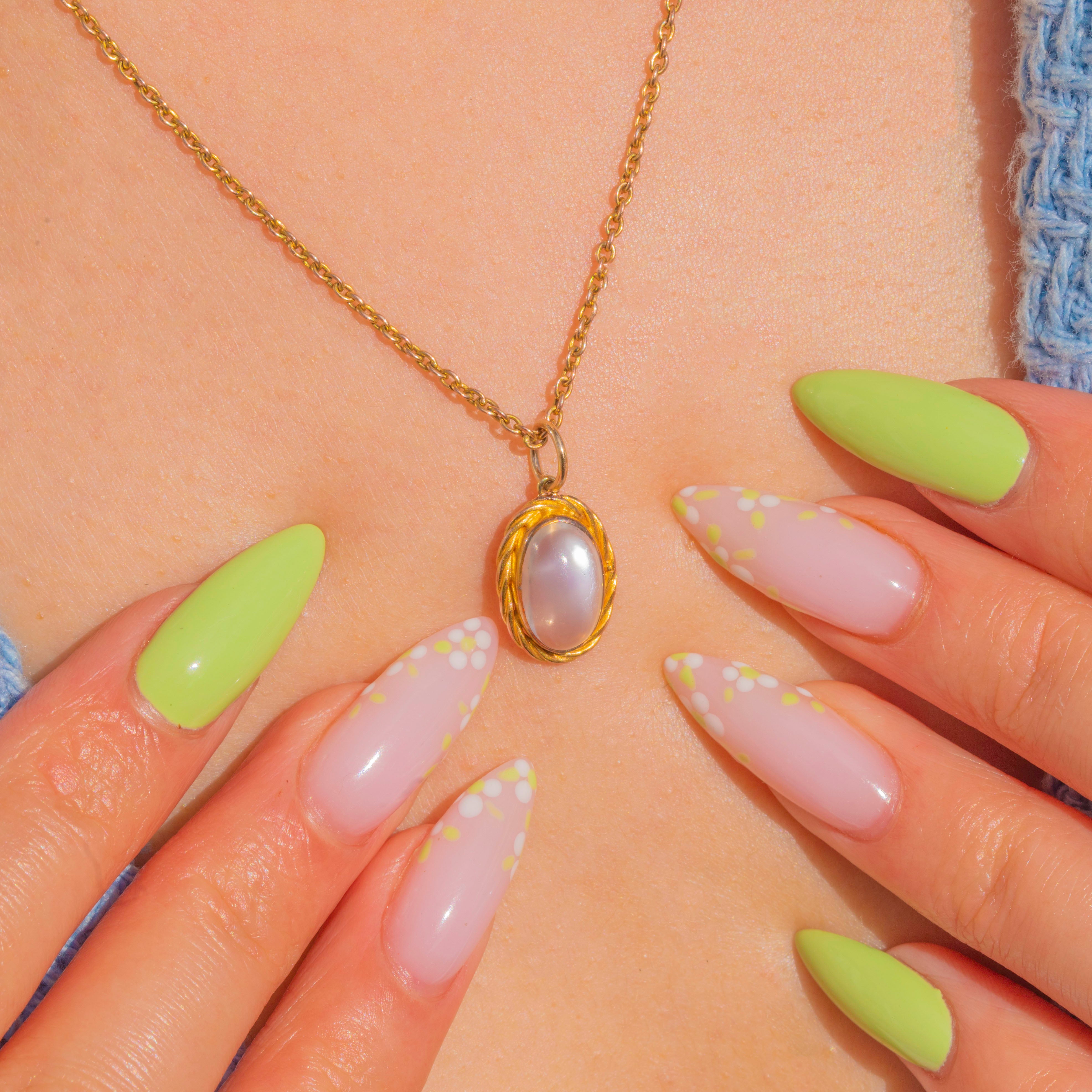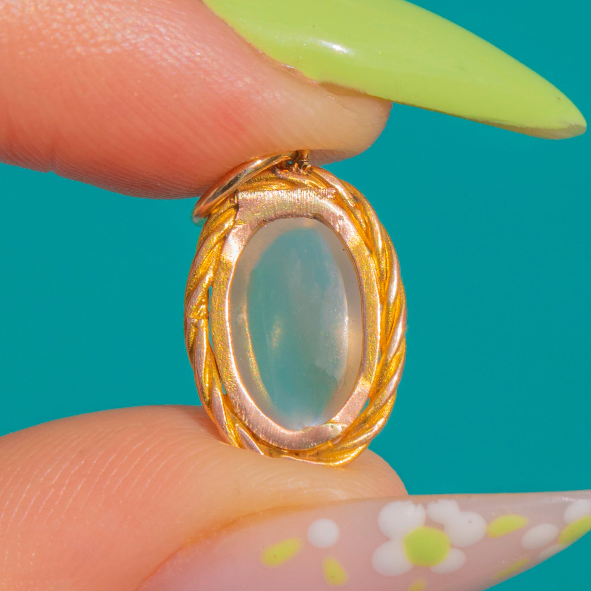 A delicate Victorian Moonstone pendant with the softest, ethereal glow. The oval cabochon is framed by a pretty twisted-rope border, its warm gilded Silver lending a buttery hue that beautifully complements the gem’s silvery-blue adularescence. Petite and romantic, it’s a timeless accent that sits effortlessly with any neckline.
