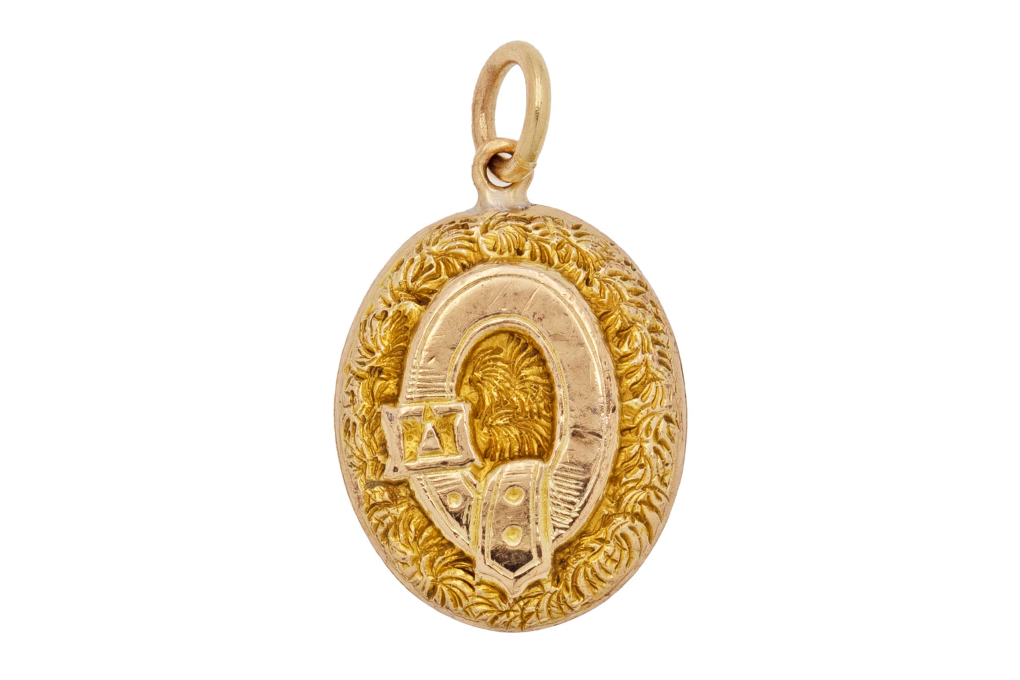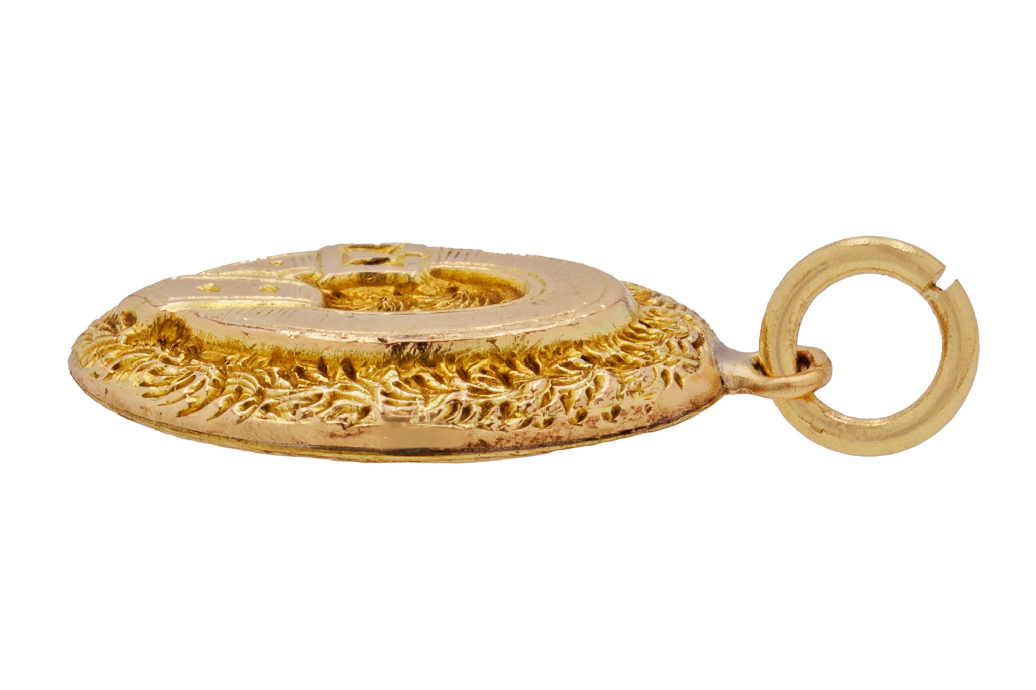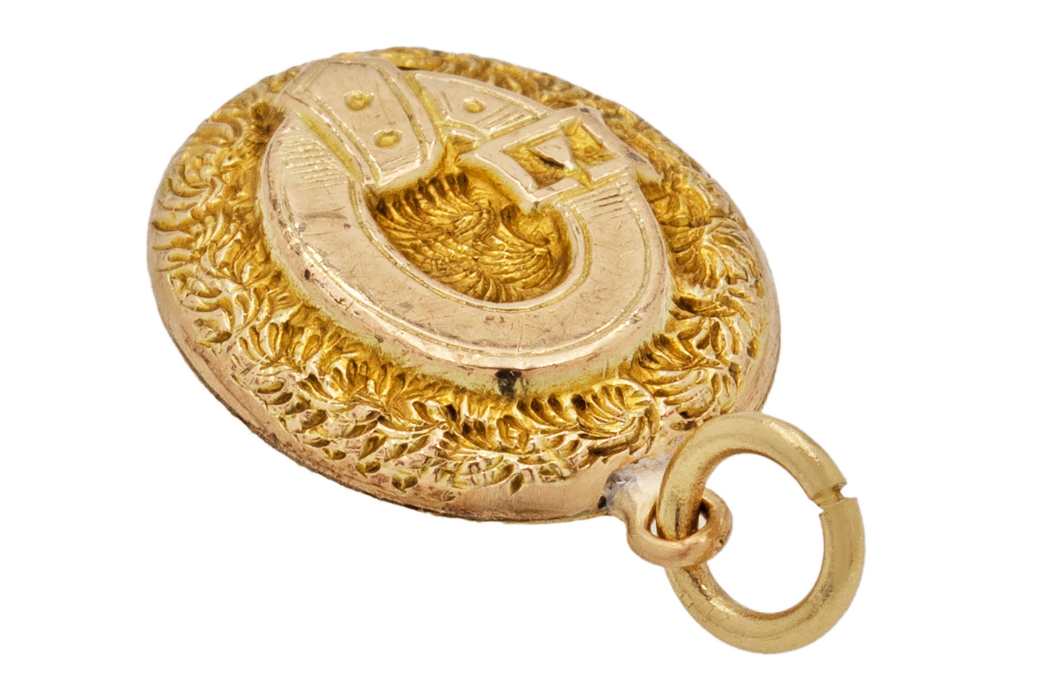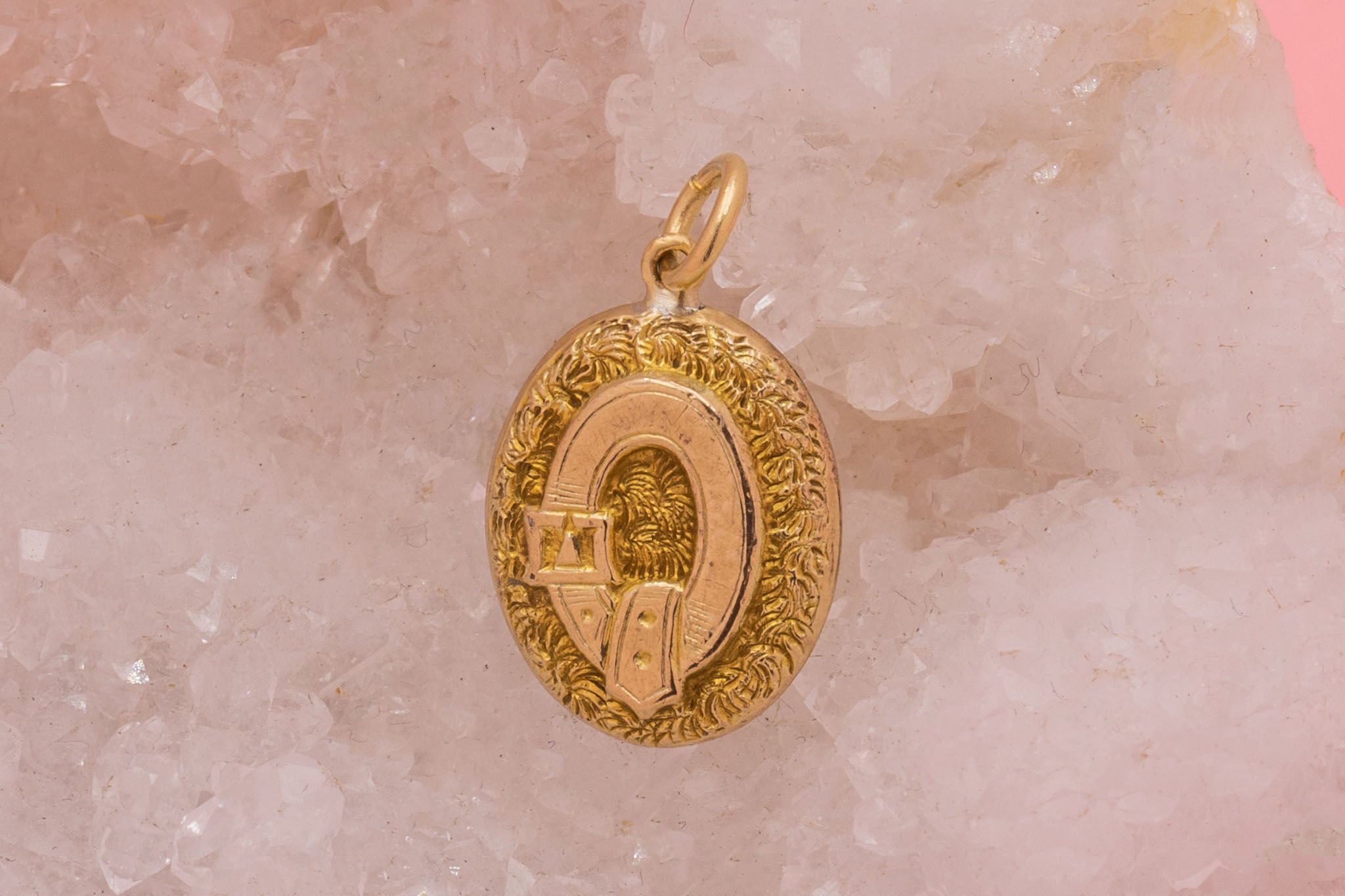 We adore this antique Gold toned buckle motif pendant! This splendid piece is made from a Gold coloured metal, and has a symbolic buckle motif on its front.