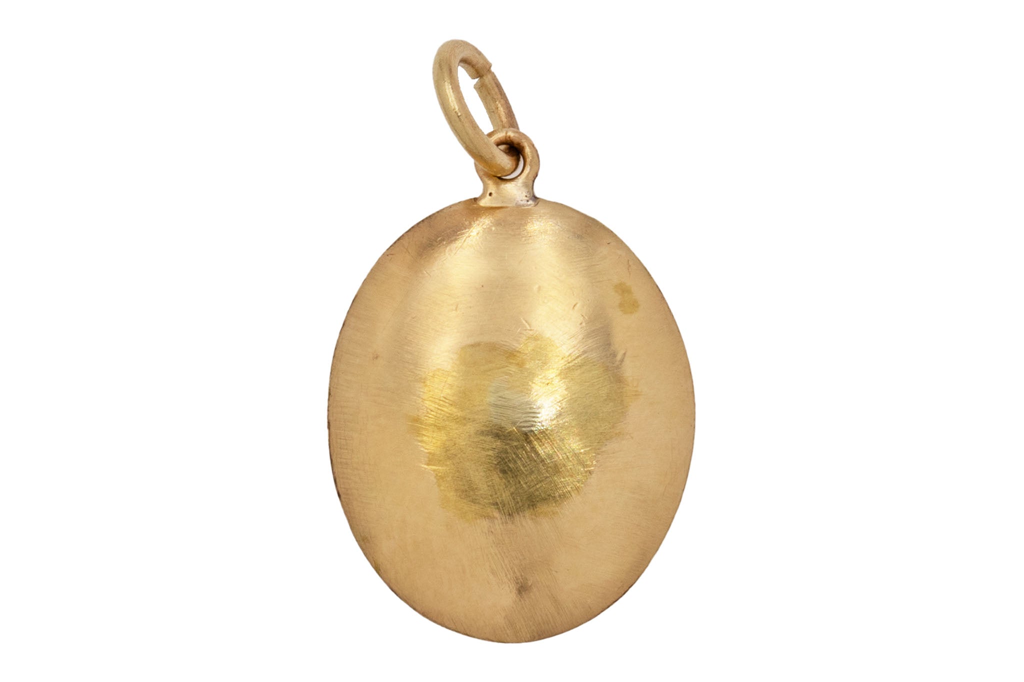 VERY GOOD. This antique Gold toned buckle motif pendant is absolutely gorgeous. Featuring a symbolic buckle on her front, this piece was actually once part of a cufflink set! There is a small sign of this to the back of the piece but it is smooth and lustrous overall. The jump ring allows you to attach this pretty to a chain of your choice!