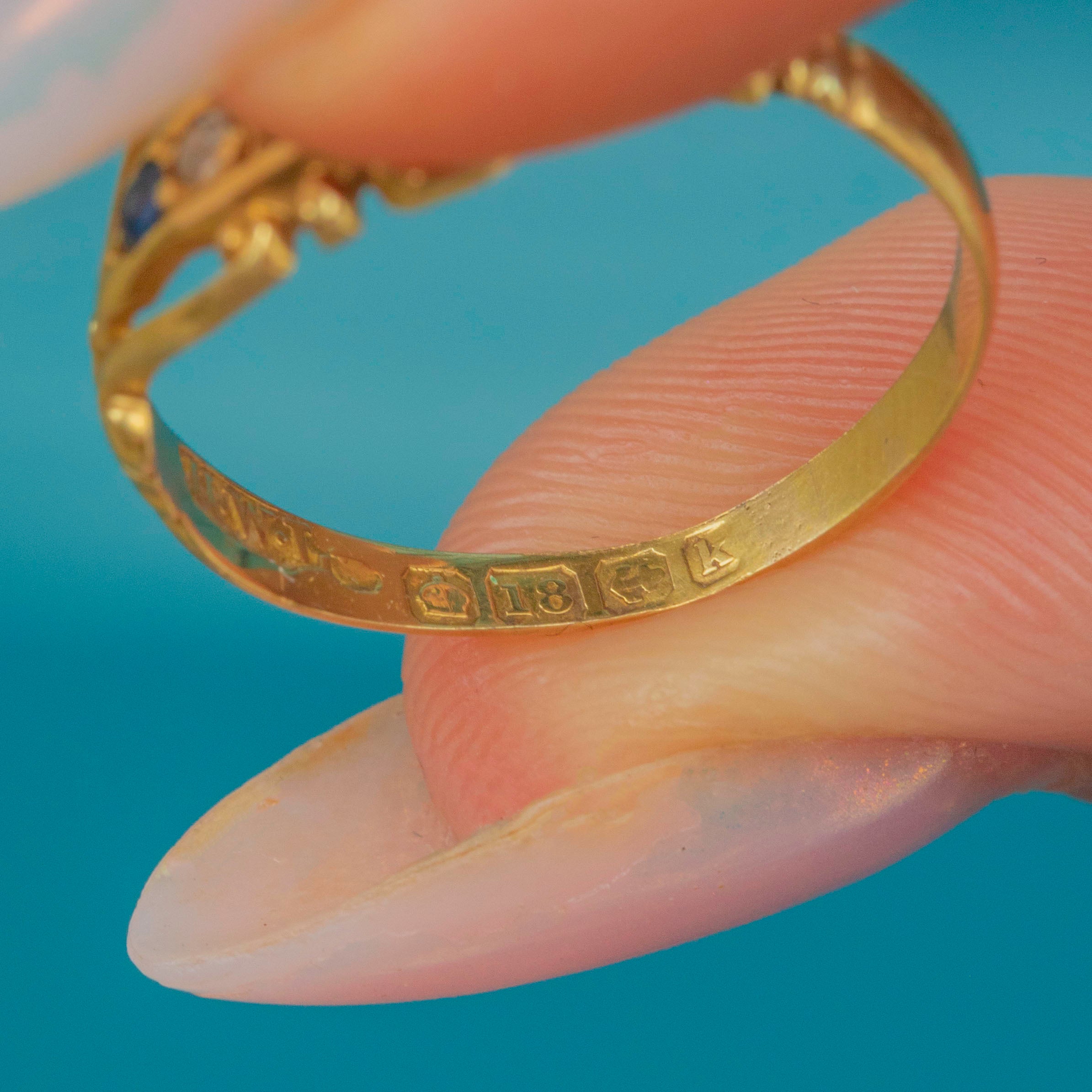 MATERIALS: Tests as 18ct Gold, Sapphires, Rose-Cut Diamonds.
