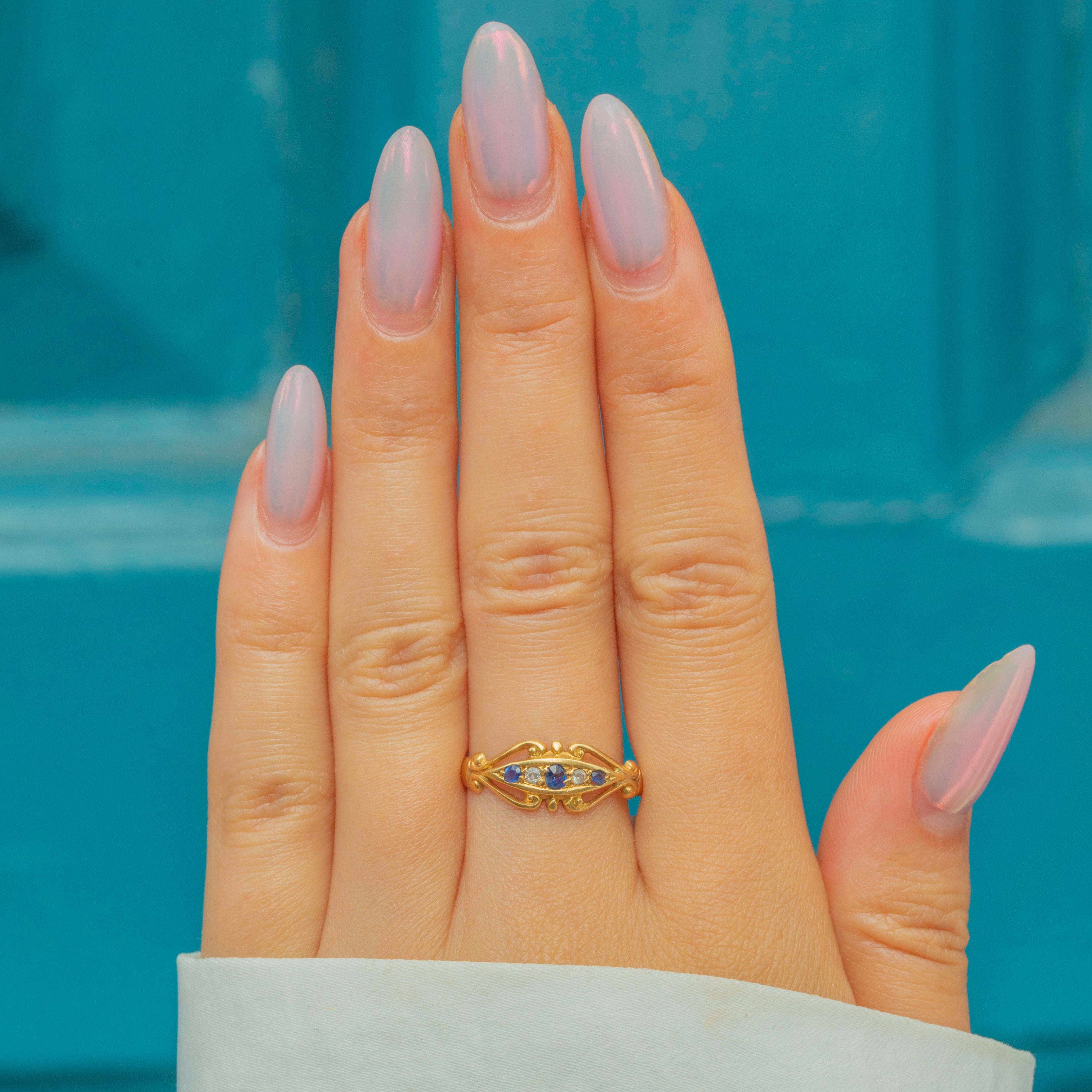 A quintessentially Edwardian five stone ring, featuring three saturated blue Sapphires, each flanked by twinkling rose-cut Diamonds, akin to a starry night sky.