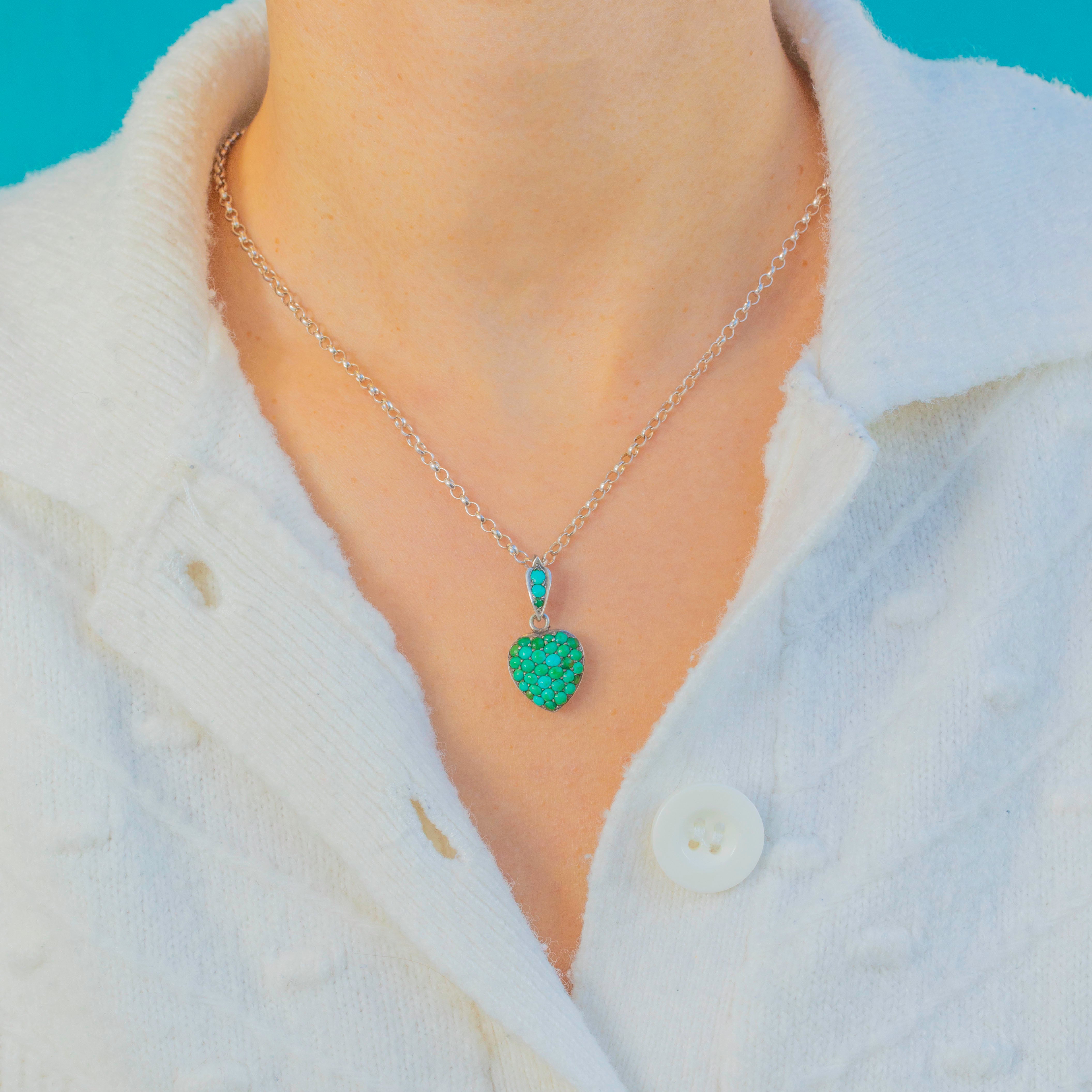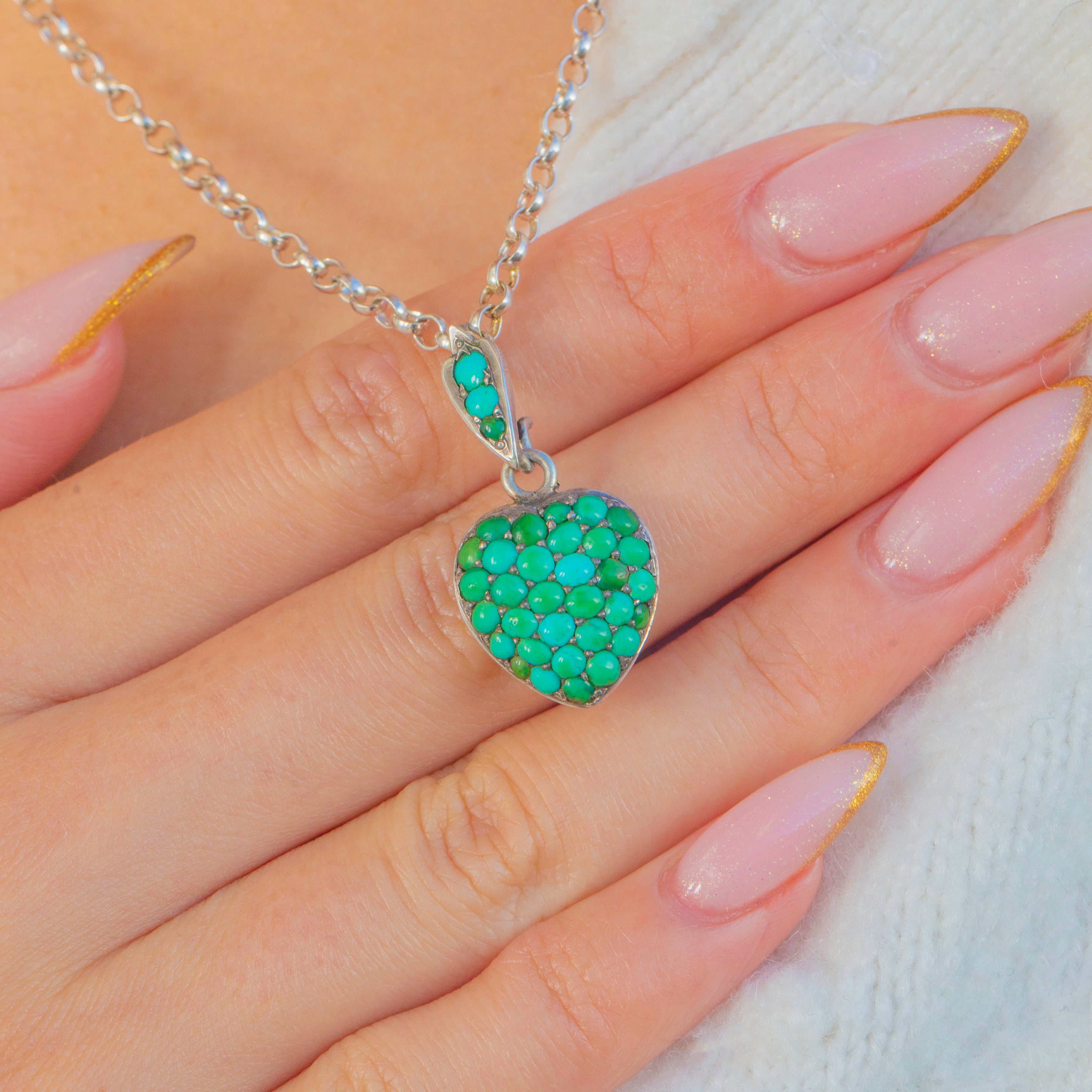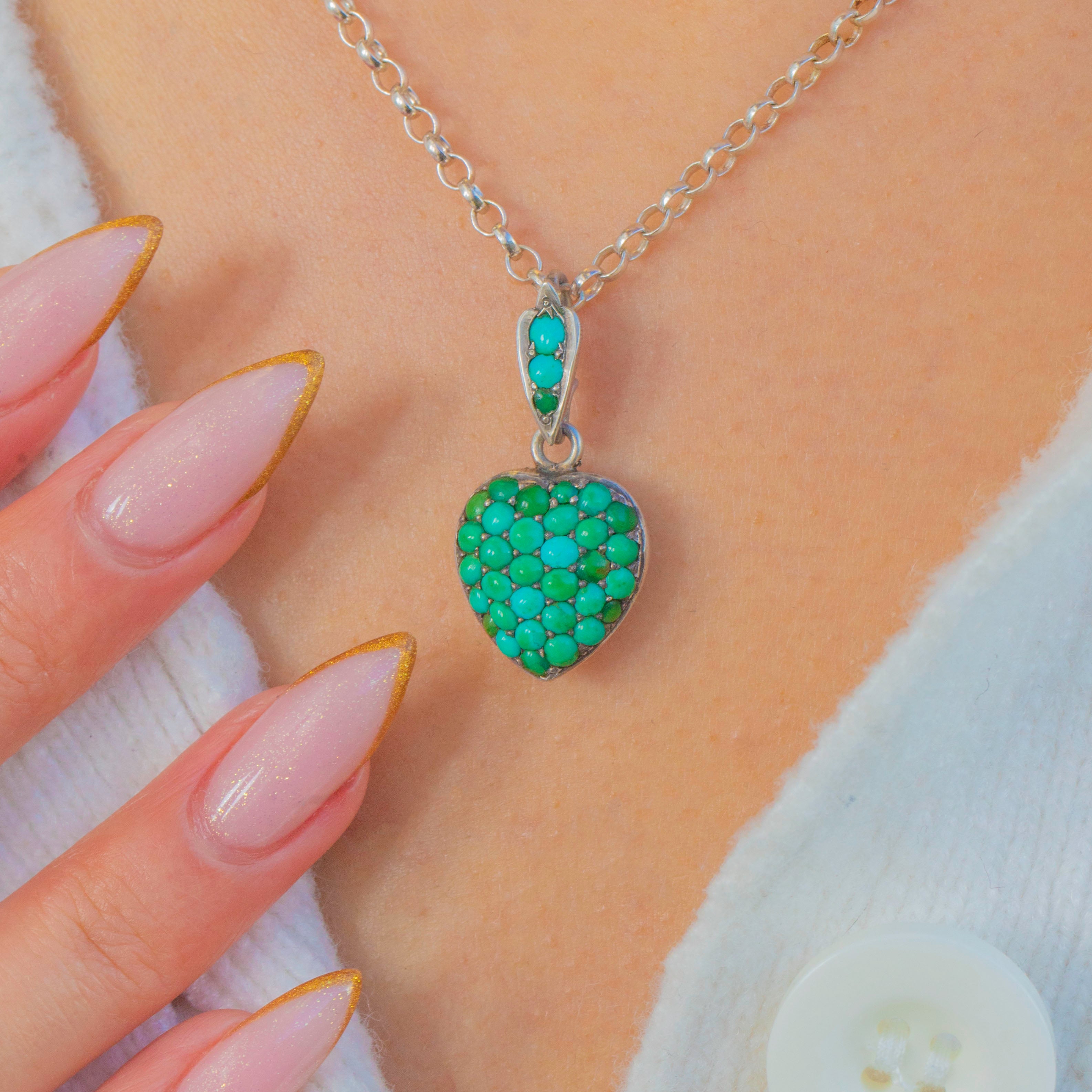 This vibrant Victorian heart charm is a true sweetheart jewel, brimming with character and colour. The front is fully pavé-set with Turquoise cabochons in a beautiful array of hues, from soft sky-blue to deep greenish teal. Their natural variation creates a lively, mosaic-like surface that feels both romantic and organic—exactly what collectors treasure in genuine antique Turquoise.