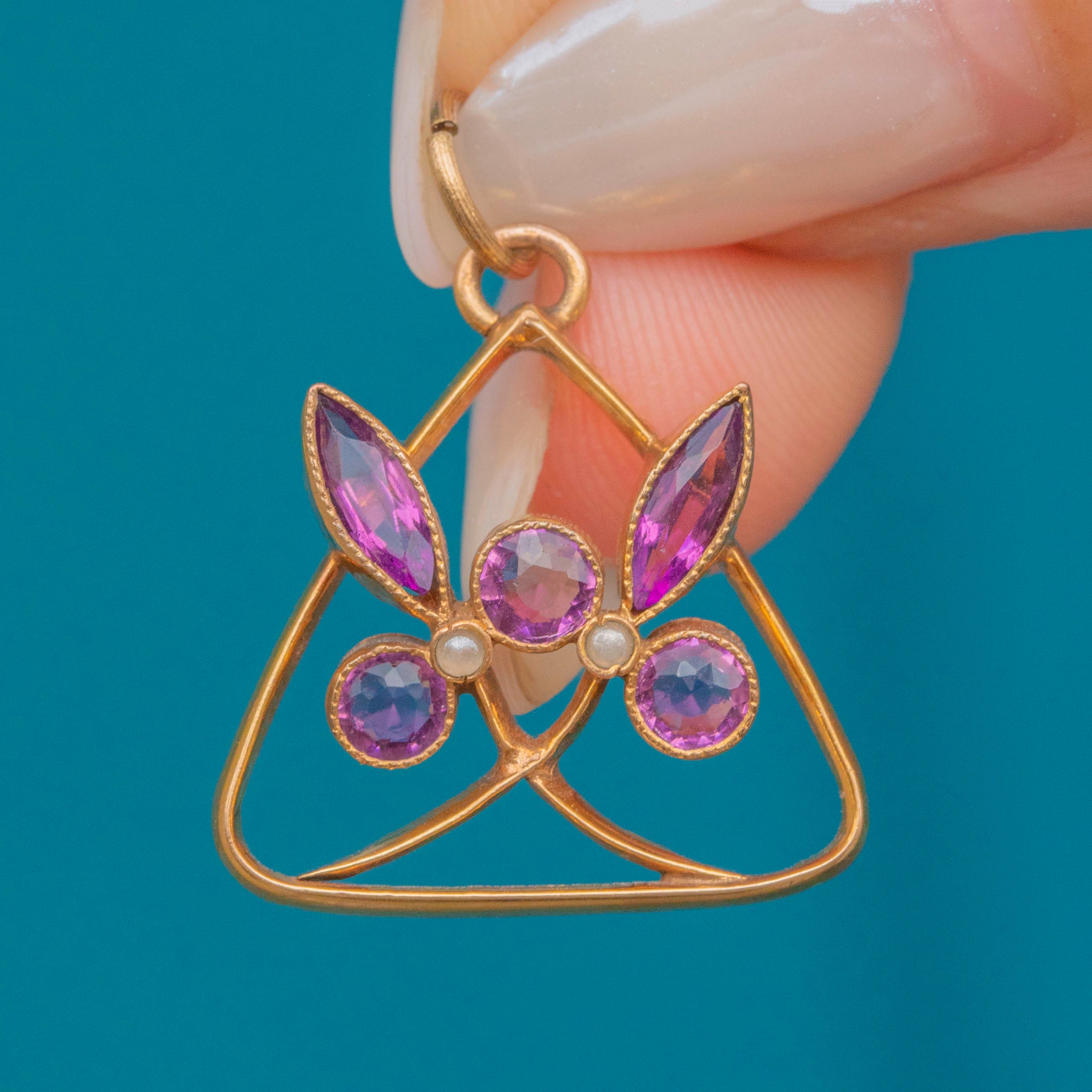 EXCELLENT: The Paste and Pearls are securely set and free from chips or scuffs. Gold casing has an even saturated hue, besides some mild wear on the back, commensurate with age. The pendant has held its form well and the large jump ring ensures you can suspend this Victorian Paste pendant from a chain of your choice with ease!