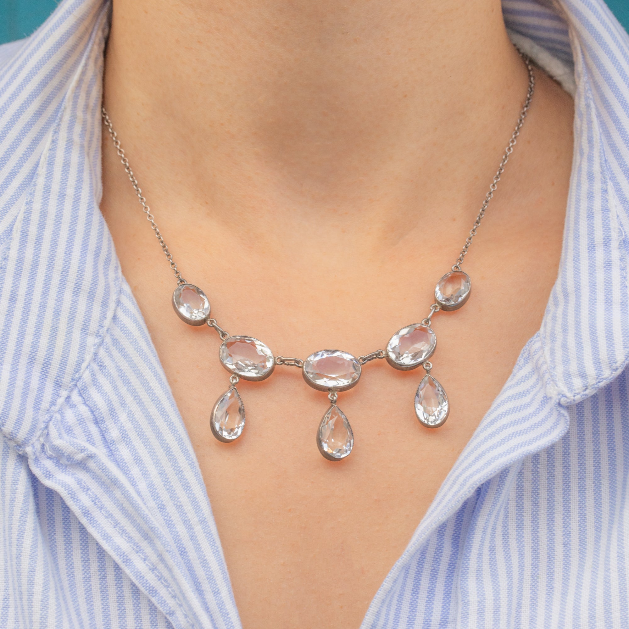 This delicate Edwardian Silver necklace features a shimmering fringe of faceted Rock Crystals totalling approximately 65cts. Each Crystal catches the light beautifully, creating an enchanting sparkle that dances along the neckline. The stones graduate gracefully in size, suspended from a fine Silver chain.