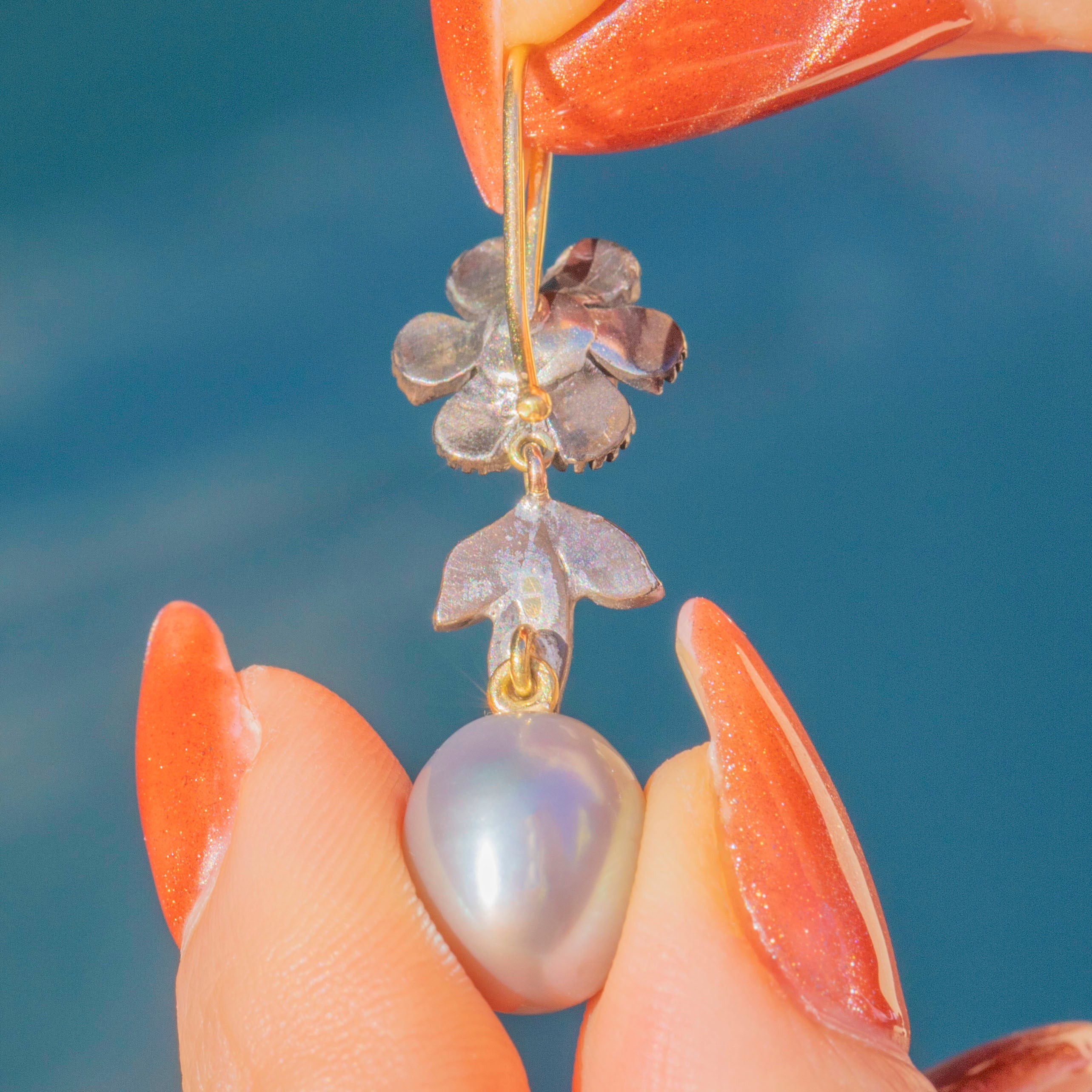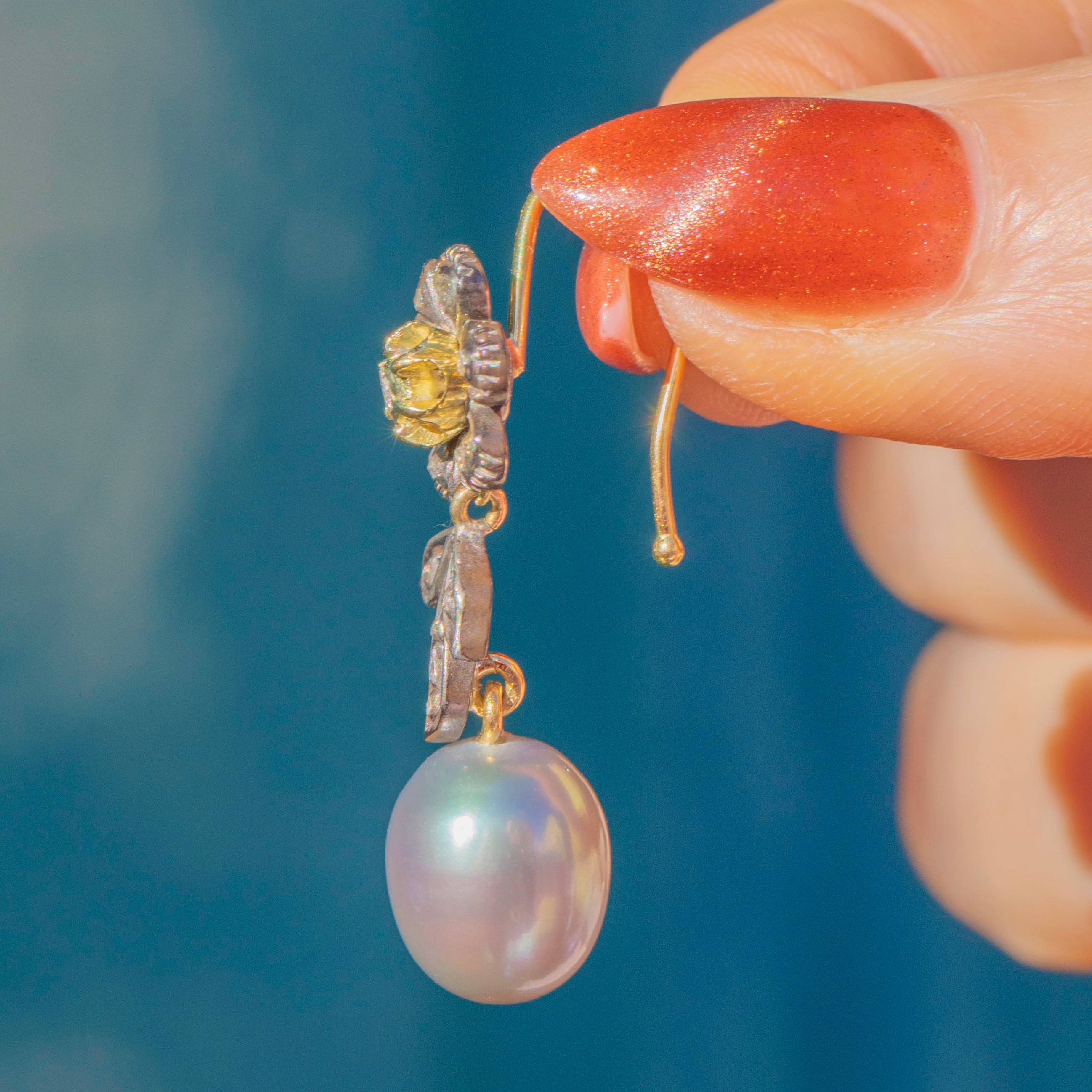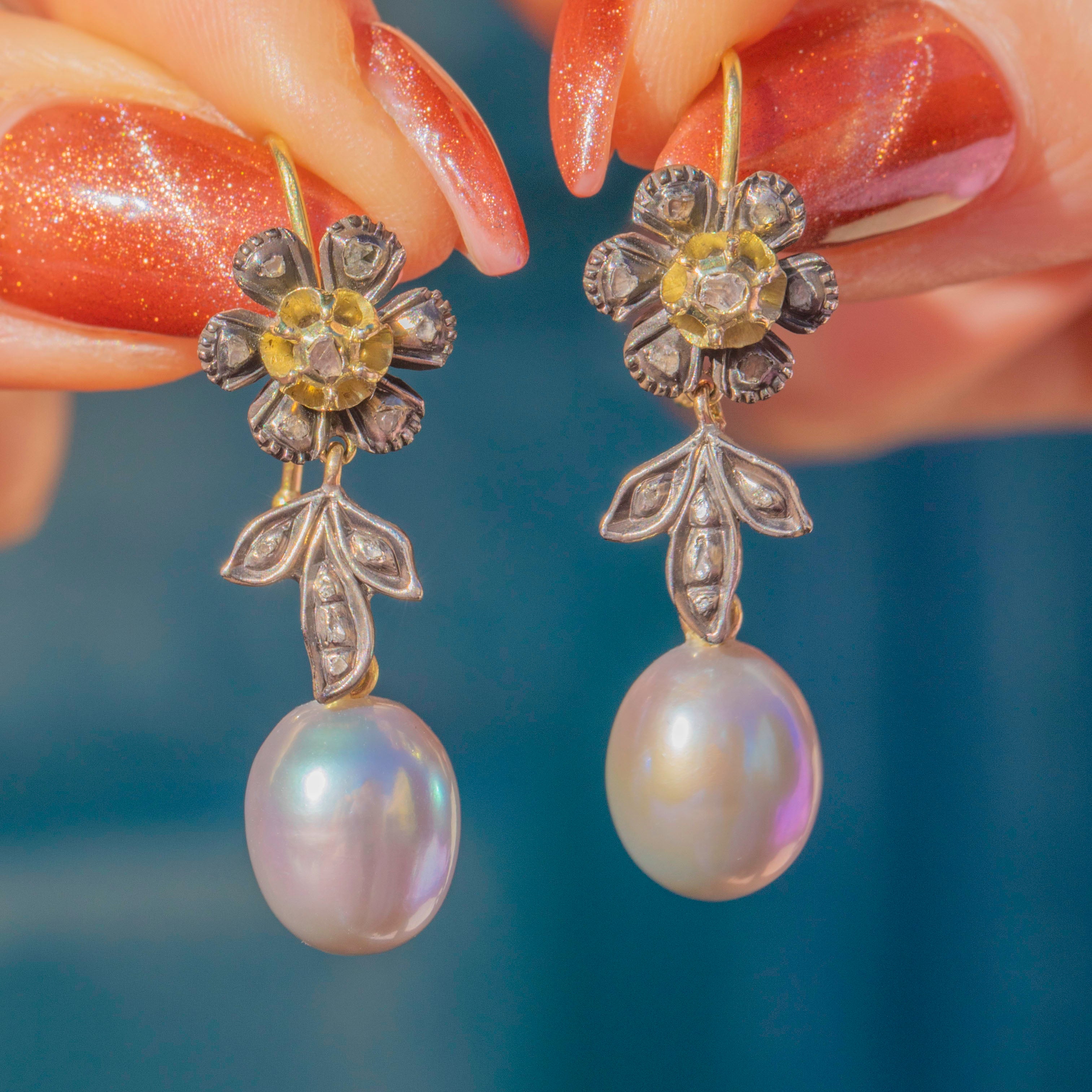 VERY GOOD-EXCELLENT. These Victorian rose-cut Diamond flower Pearl drop earrings are in superb condition. Each component is securely affixed and the hooks are robust, providing comfortable and secure wear. The Diamonds are all present with only minor wear on the floral settings, but they all remain securely set. The Silver has accrued an admirable patina giving the earrings a dramatic finish and highlighting the brilliance of the Diamonds. The Pearls are radiant and smooth, free from visible signs of surface wear, and securely connected. With so much beauty to admire, these antique Diamond Pearl earrings will look resplendent suspended from your lobes!