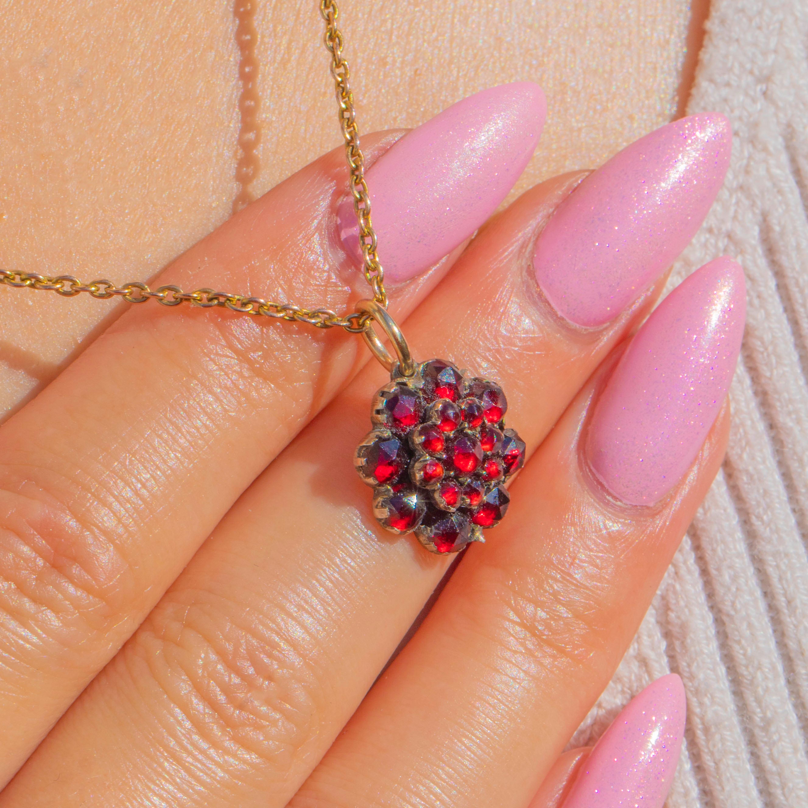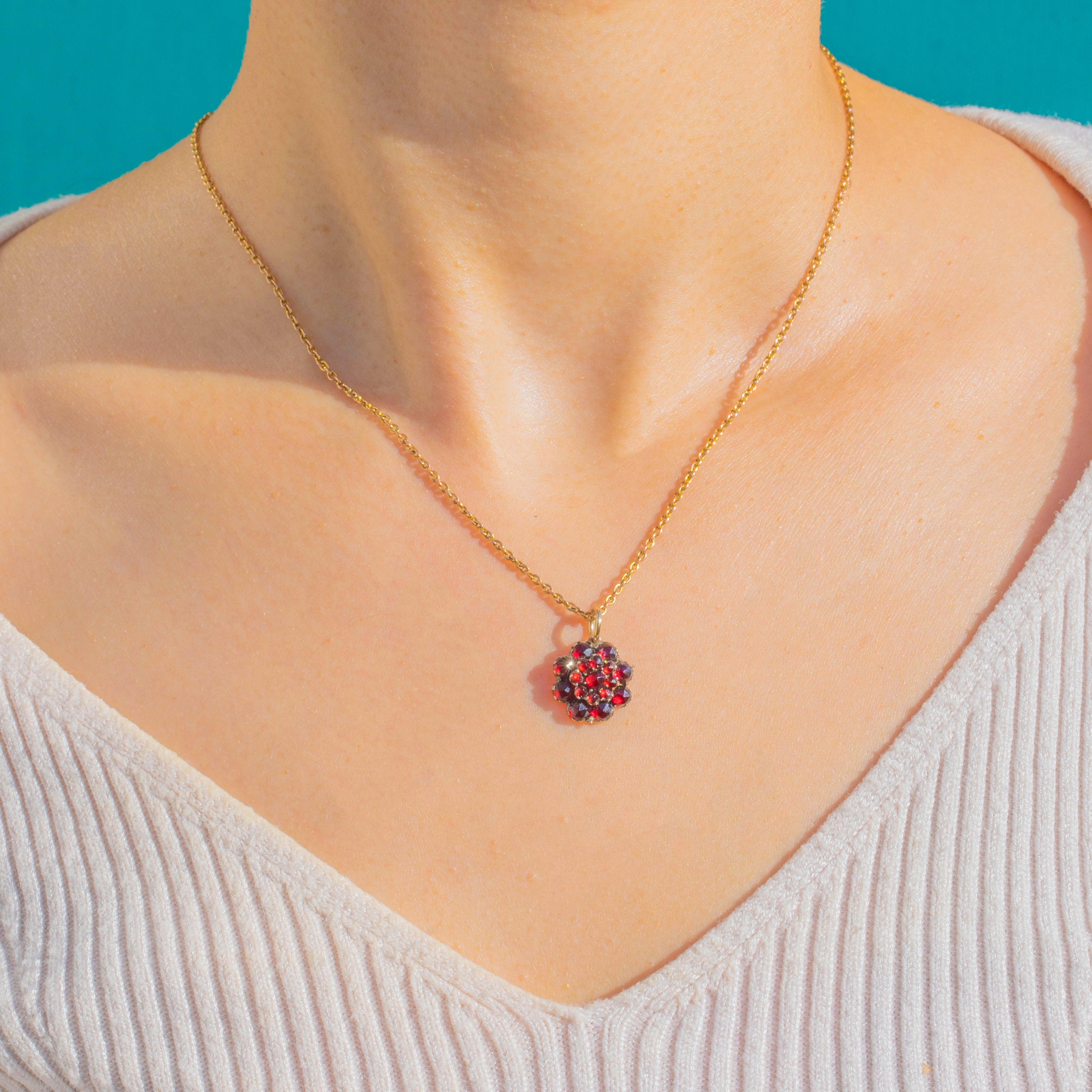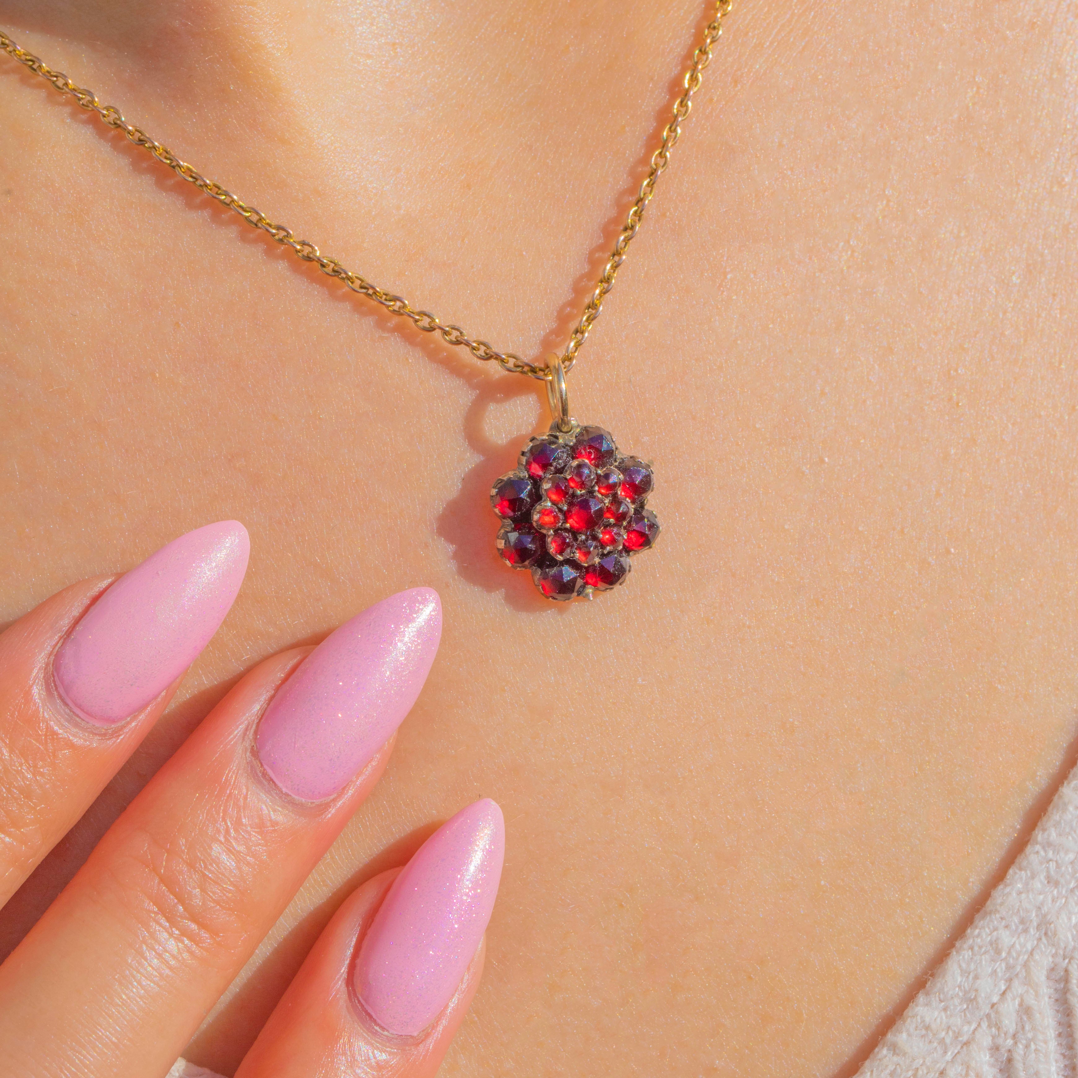 This antique Victorian charm is a wonderfully sweet little flower cluster, set throughout with glowing rose-cut Garnets in rich berry-red tones. The domed floral arrangement gives the piece lovely depth and texture, while the rose-cut facets catch the light beautifully.