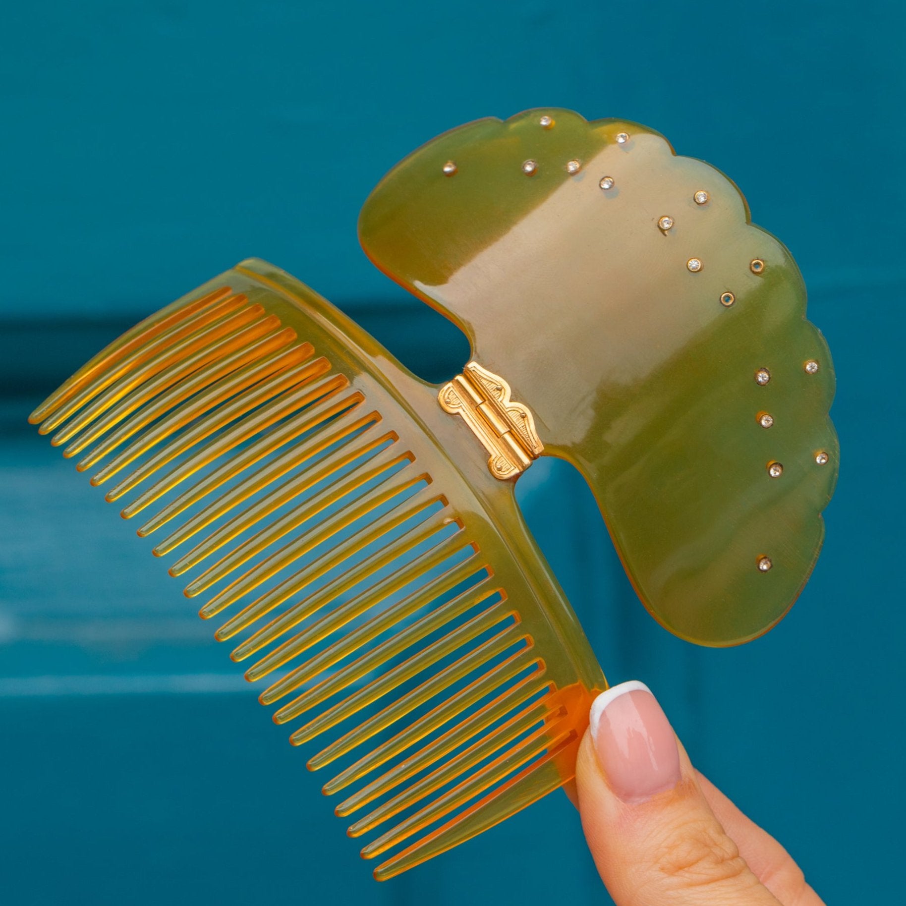 The rich caramel hue of the comb is both velvety and captivating, making it a standout piece in any collection. Like the stars themselves, dotted across a warm airglow, this hair comb is delicately adorned with shimmering Paste gemstones, adding a touch of sparkle to your hairdo. Fused together with an ornate 15ct Gold hinge with dainty engravings, if you want to dress to impress, this Victorian hair comb is a must!