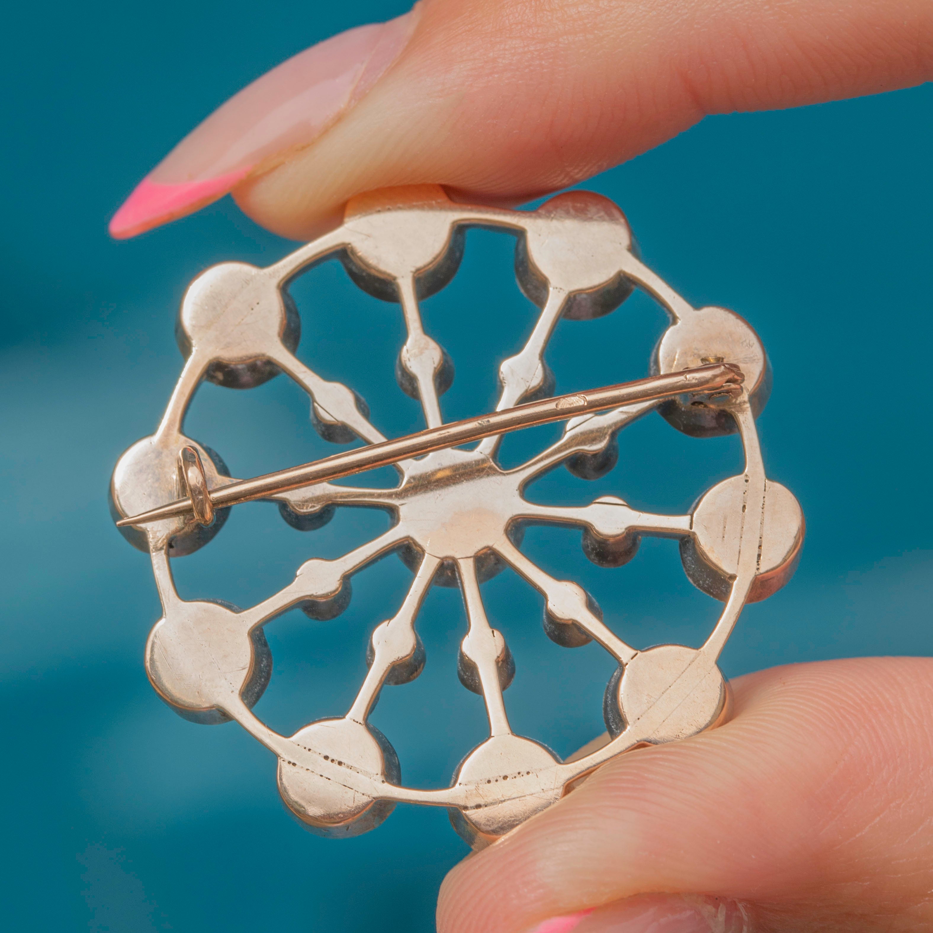 EXCELLENT: We are pleased to present this antique 15ct Gold rose-cut Diamond cluster brooch in excellent condition. The Diamonds are bright and securely set, free from chips or abrasions. With a fully functioning and robust pin, you can show this outstanding antique Diamond brooch off with utmost confidence!