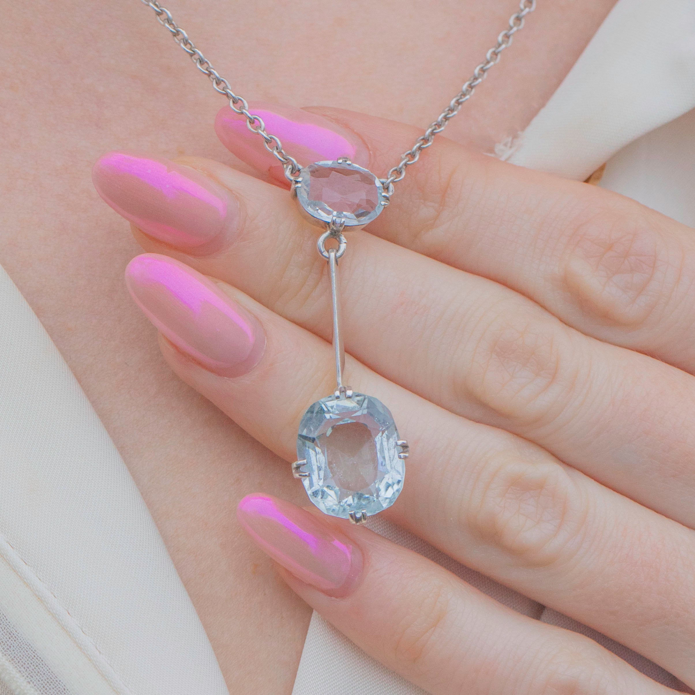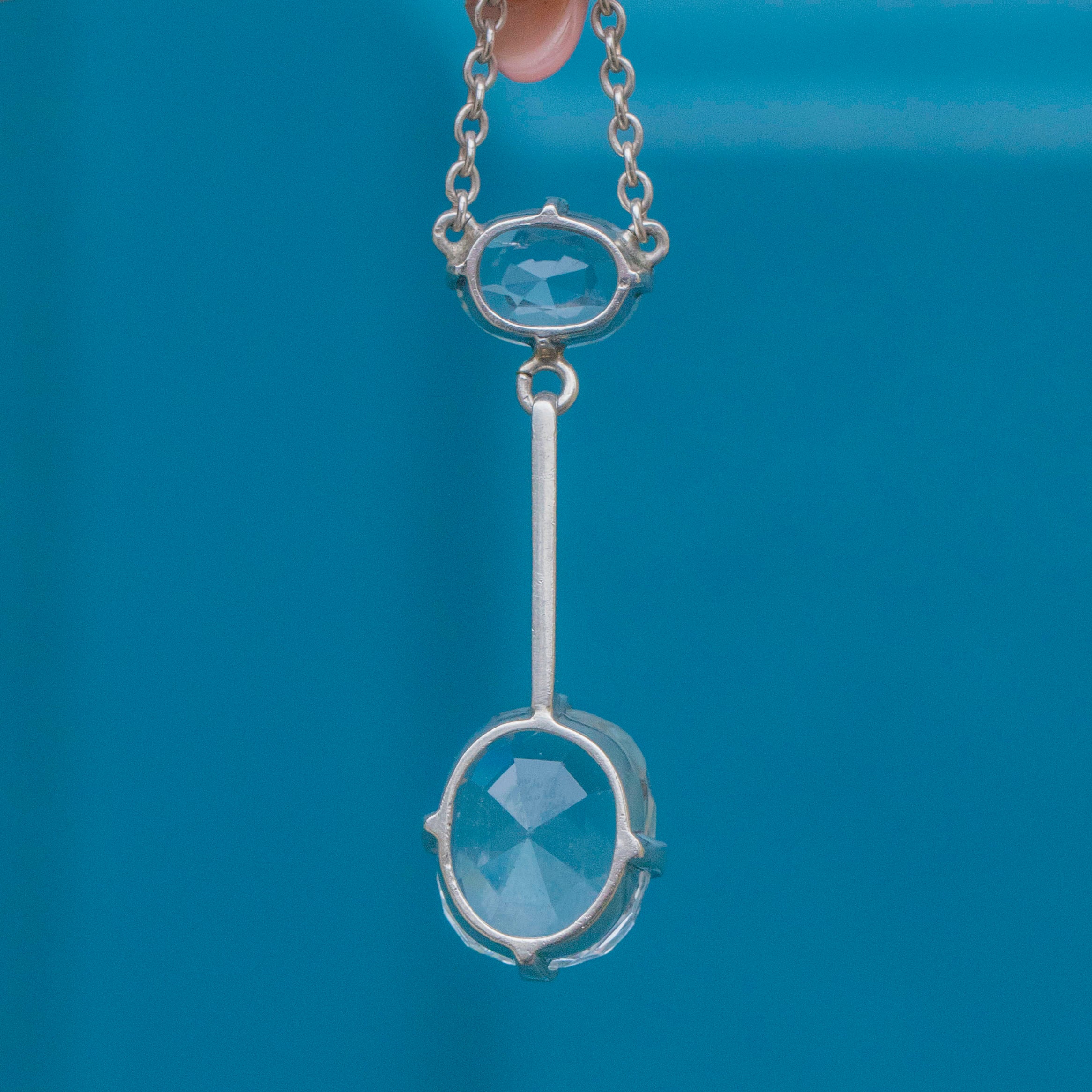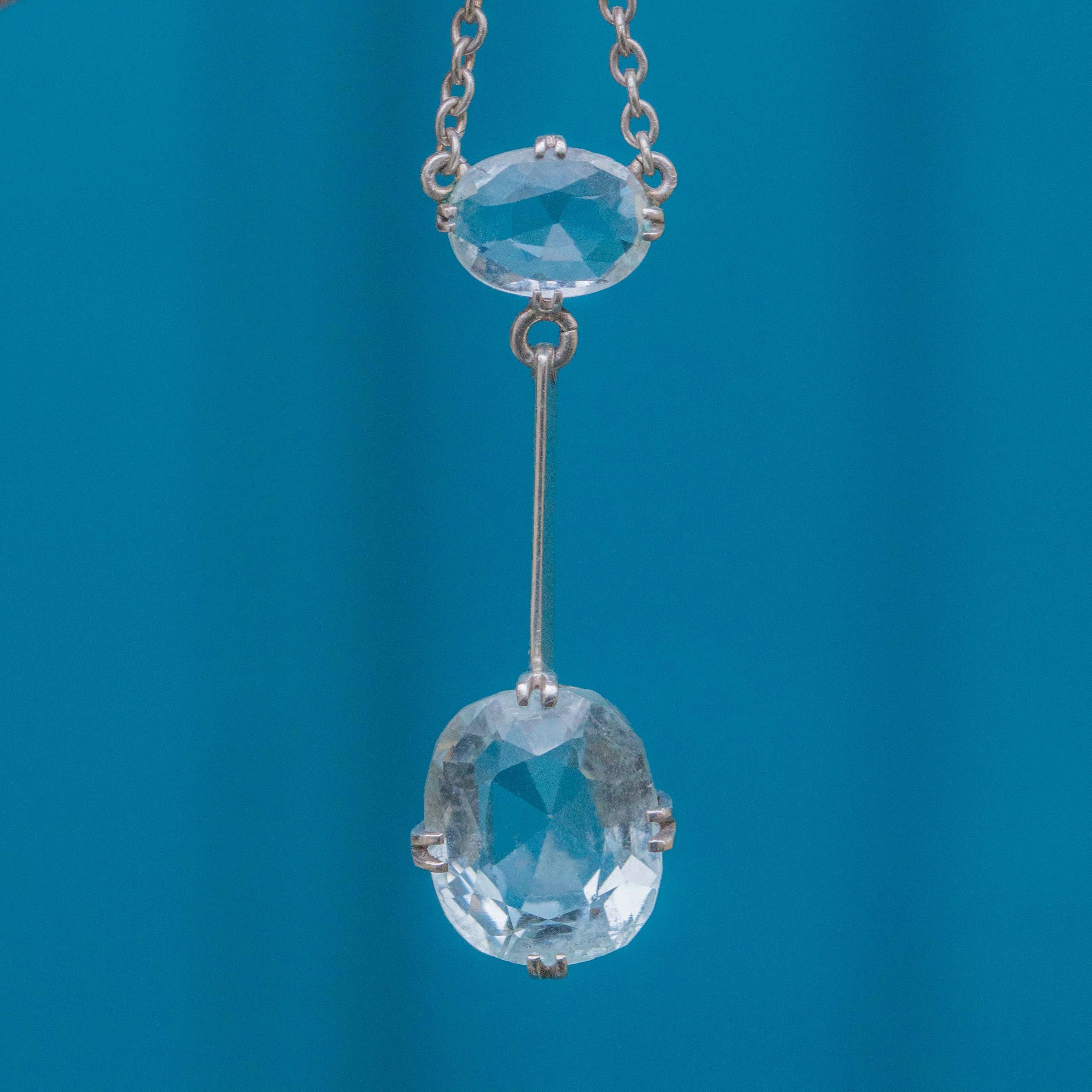 VERY GOOD-EXCELLENT. This antique Silver Aquamarine negligee necklace is in lovely condition throughout. The Aquamarines are securely held within their claw settings and boast crisp facets and an elegant light blue hue. Under close inspection the gems do have some light surface wear, commensurate with age, the top one has a minor nibble at the top (in a straight line form) and a couple of fleabites on the bottom one, but these do not draw the eye. The links are securely connected and each component is firmly affixed, allowing you to wear this Edwardian necklace with absolute confidence!