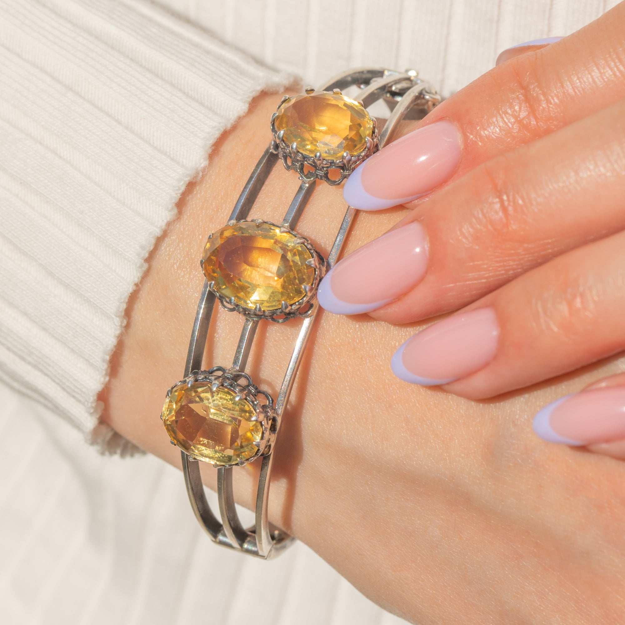 Make a statement wherever you go with this outstanding antique Silver Citrine bangle adorning your wrist! Boasting a whopping 12.28 carats combined, the three oval-cut Citrines burst with joyful lemony hues as their crisp cut facets dance in the light.