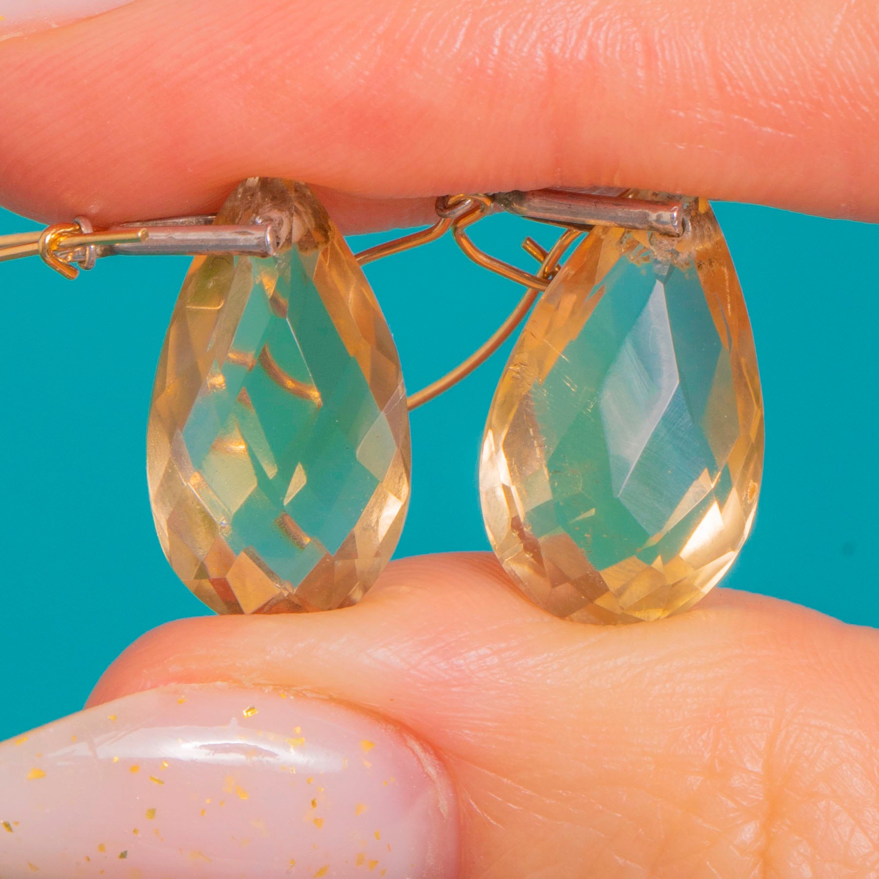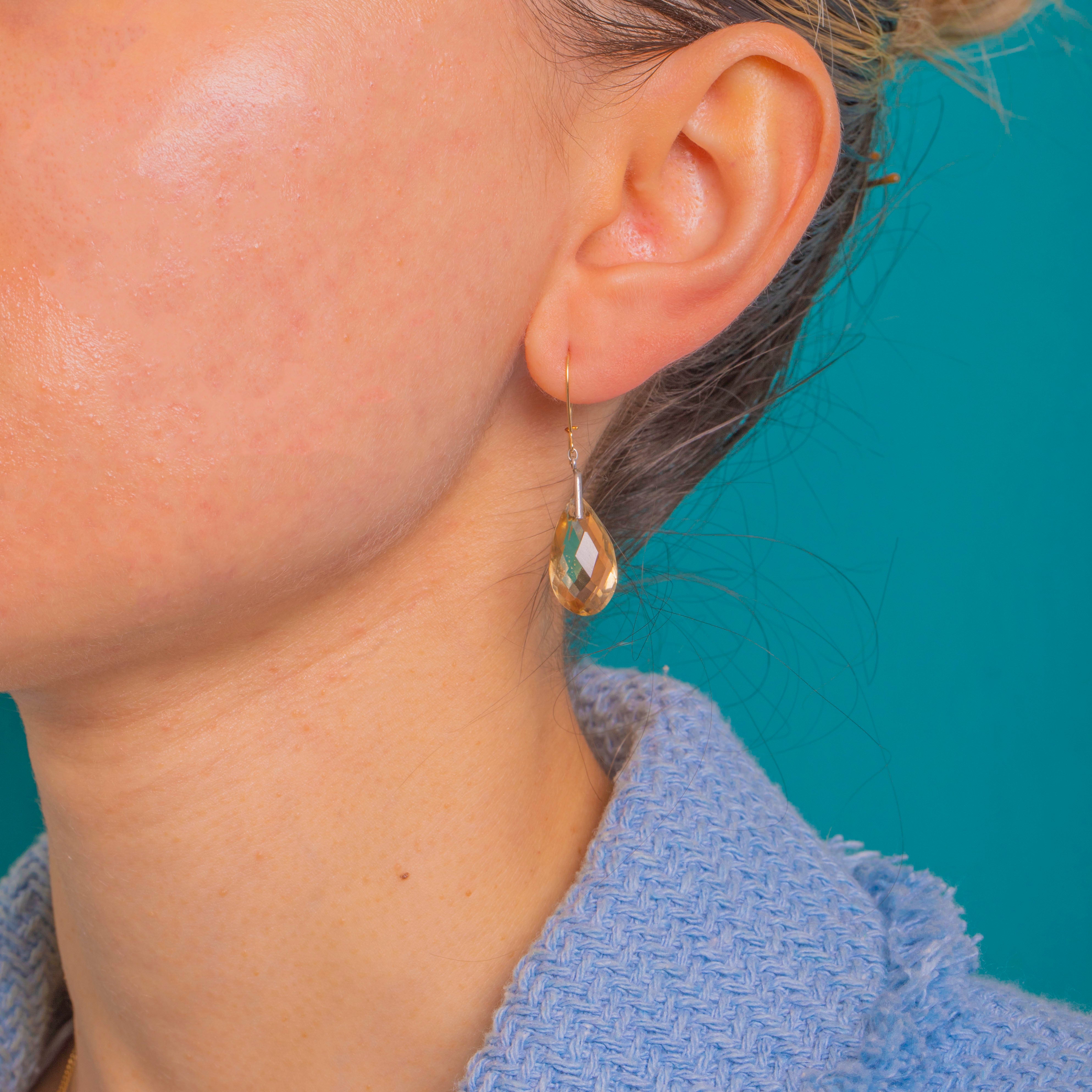 Bathed in soft honeyed light, these Victorian Citrine drop earrings capture the effortless elegance of a single, perfectly poised teardrop. Each transparent pear-shaped briolette shimmers with lively, checkerboard facets, the luminous hue beautifully complemented by the refined two-tone setting—Silver caps over the Citrines and graceful 18ct Gold hooks. The articulated drops sway delicately, catching the light with every movement for a look that is both timeless and luxuriously understated.