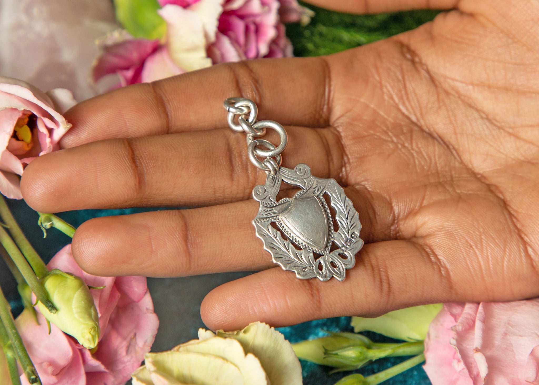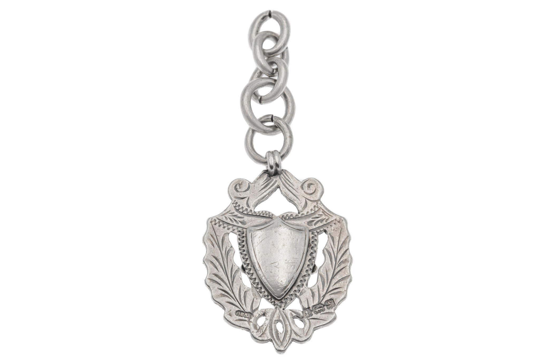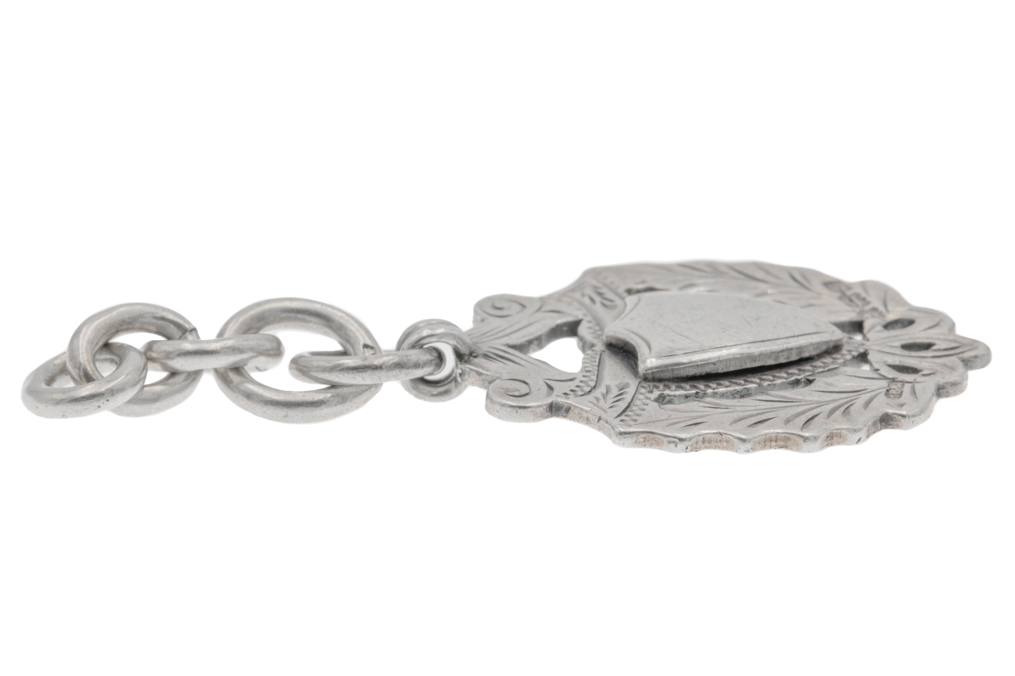 VERY GOOD: This antique Silver Medal Fob is in very good condition. Heavy, sturdy, and equipped with 5 jump rings, we can assure you this fob will last you for many years to come! She features some surface wear on the front and back, but her Silver is still shiny and bright. You could even personalise this antique by engraving the blank shield!
