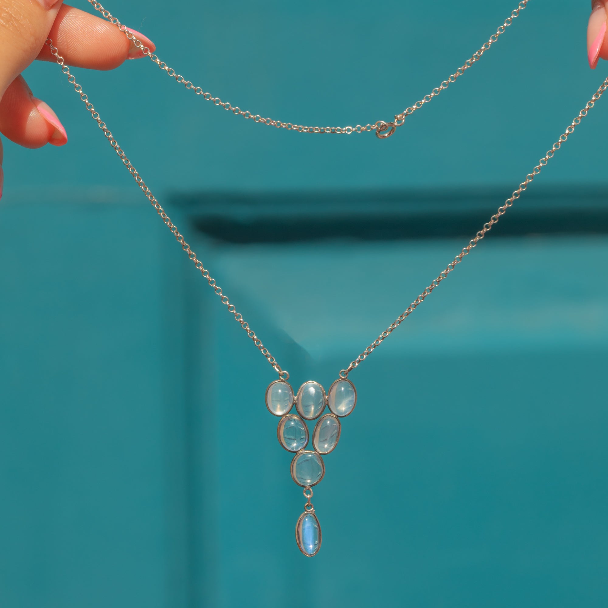 Moonstone cluster drop is 37mm long x 19.5mm wide.